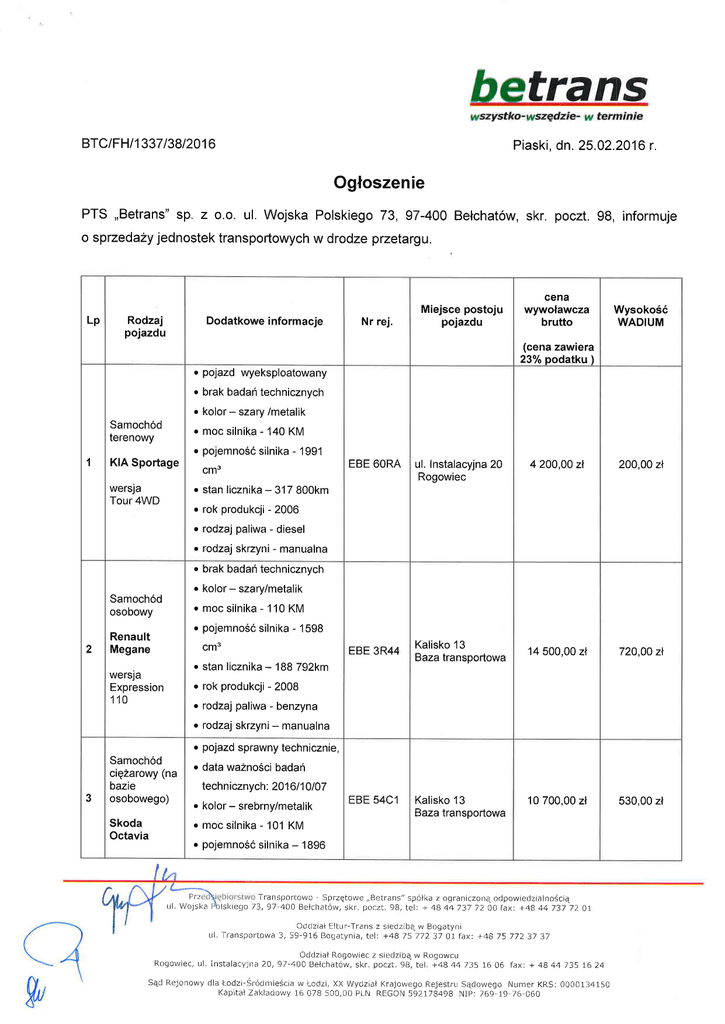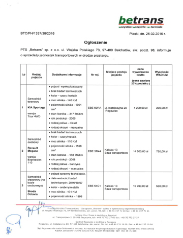 PTS ,,Betrans" sp. z o.o. ul. Wojska Polskiego 73, 97-400 Belchat6w, skr. poczt. 98, informuje