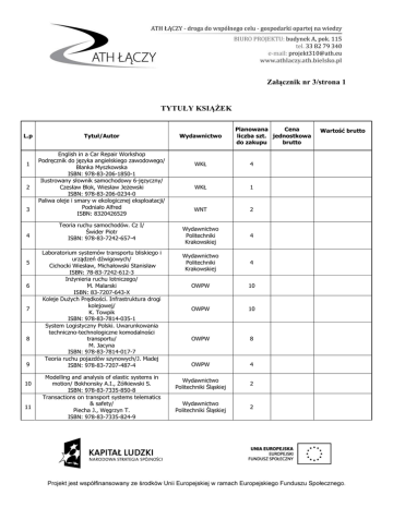 Załącznik nr 3/strona 1 TYTUŁY KSIĄŻEK L.p 1 2 3 4 5 6 7 8 9 10 11 Tytuł/Autor English in a Car Repair Workshop Podręcznik do języka angielskiego zawodowego/ Blanka Myszkowska ISBN: 978-83-206-1850-1 Ilustrowany słownik samochodowy 6-języczny/ Czesław Blok, Wiesław Jeżewski ISBN: 978-83-206-0234-0 Paliwa oleje i smary w ekologicznej eksploatacji/ Podniało Alfred ISBN: 8320426529 Teoria ruchu samochodów. Cz I/ Świder Piotr ISBN: 978-83-7242-657-4 Laboratorium systemów transportu bliskiego i urządzeń dźwigowych/ Cichocki Wiesław, Michałowski Stanisław ISBN: 78-83-7242-612-3 Inżynieria ruchu lotniczego/ M. Malarski ISBN: 83-7207-643-X Koleje Dużych Prędkości. Infrastruktura drogi kolejowej/ K. Towpik ISBN: 978-83-7814-035-1 System Logistyczny Polski. Uwarunkowania techniczno-technologiczne komodalności transportu/ M. Jacyna ISBN: 978-83-7814-017-7 Teoria ruchu pojazdów szynowych/J. Madej ISBN: 978-83-7207-487-4 Modelling and analysis of elastic systems in motion/ Bokhonsky A.I., Żółkiewski S. ISBN: 978-83-7335-850-8 Transactions on transport systems telematics & safety/ Piecha J., Węgrzyn T. ISBN: 978-83-7335-824-9 Wydawnictwo Planowana Cena liczba szt. jednostkowa do zakupu brutto WKŁ 4 WKŁ 1 WNT 2 Wydawnictwo Politechniki Krakowskiej 4 Wydawnictwo Politechniki Krakowskiej 4 OWPW 10 OWPW 10 OWPW 8 OWPW 4 Wydawnictwo Politechniki Śląskiej 2 Wydawnictwo Politechniki Śląskiej 2 Wartość brutto Załącznik nr 3/strona 2 12 13 Finite element method for transport applications/ Sładkowski A. ISBN: 978-83-7335-876-8 Wybrane problemy eksploatacji maszyn/ Stanisław Laber ISBN: 978-83-7789-028-8 Wydawnictwo Politechniki Śląskiej 2 Uniwersytet Zielonogórski 4 Razem wartość brutto: ..................................................... (Data) ……………………………………………………….. (Podpis i pieczęć osoby upoważnionej do składania oświadczeń w imieniu Wykonawcy)