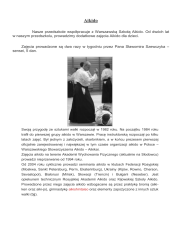 Aikido Nasze przedszkole współpracuje z Warszawską Szkołą Aikido. Od dwóch lat w naszym przedszkolu, prowadzimy dodatkowe zajęcia Aikido dla dzieci. Zajęcia prowadzone są dwa razy w tygodniu przez Pana Sławomira Szewczyka – sensei, 5 dan. Swoją przygodę ze sztukami walki rozpoczął w 1982 roku. Na początku 1984 roku trafił do pierwszej grupy aikido w Warszawie. Pracę instruktorską rozpoczął po kilku latach zajęć. Był jednym z założycieli, skarbnikiem, a w końcu prezesem pierwszej oficjalnie zarejestrowanej i największej w tym czasie organizacji aikido w Polsce – Warszawskiego Stowarzyszenia Aikido – Aikikai. Zajęcia aikido na terenie Akademii Wychowania Fizycznego (aktualnie na Słodowcu) prowadzi nieprzerwanie od 1994 roku. Od 2004 roku cyklicznie prowadzi seminaria aikido w klubach Federacji Rosyjskiej (Moskwa, Sankt Petersburg, Perm, Ekaterinburg), Ukrainy (Kijów, Rowno, Cherson, Sevastopol), Białorusi (Mińsk), Słowacji (Trencin) i Bułgarii (Neseber). Jest opiekunem technicznym Rosyjskiej Akademii Aikido oraz Kijowskiej Szkoły Aikido. Prowadzone przez niego zajęcia aikido wzbogacane są przez praktykę bronią (aikiken oraz aiki-jo), gimnastykę aikishintaiso oraz elementy zapożyczone z innych sztuk walki (bjj).