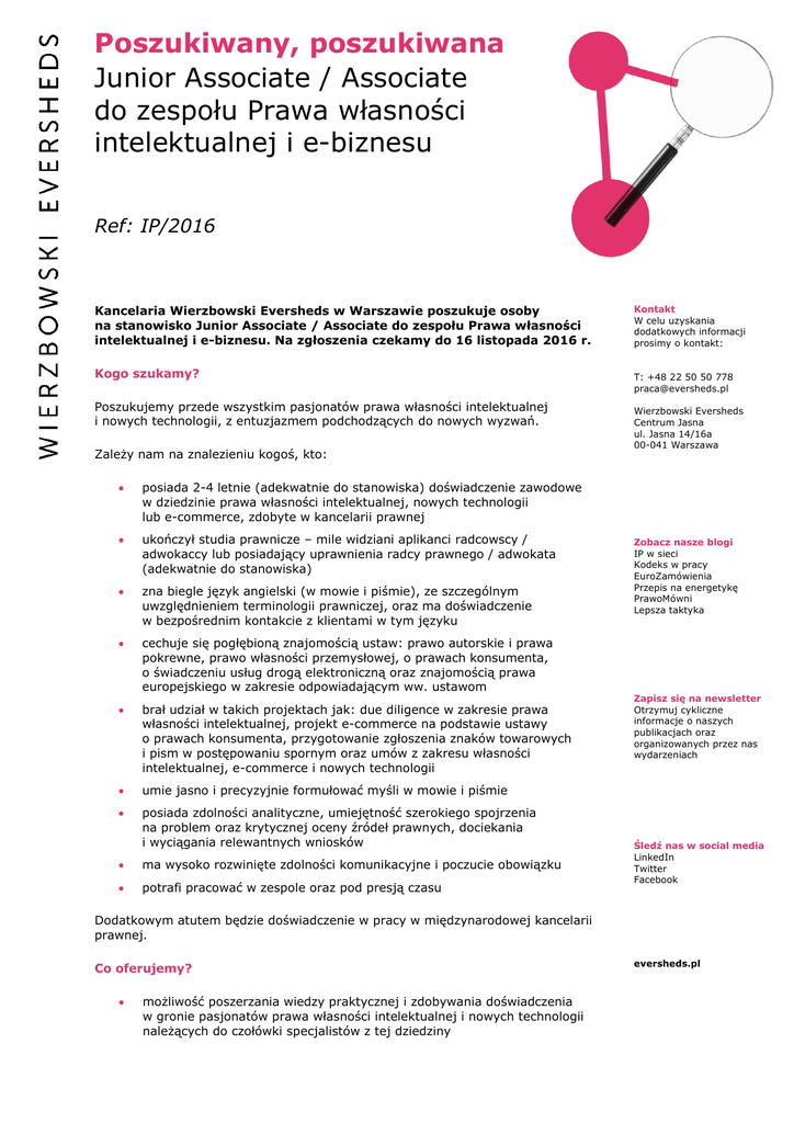 Poszukiwany, poszukiwana Junior Associate / Associate do zespołu Prawa własności intelektualnej i e-biznesu Ref: IP/2016 Kancelaria Wierzbowski Eversheds w Warszawie poszukuje osoby na stanowisko Junior Associate / Associate do zespołu Prawa własności intelektualnej i e-biznesu. Na zgłoszenia czekamy do 16 listopada 2016 r. Kogo szukamy? Poszukujemy przede wszystkim pasjonatów prawa własności intelektualnej i nowych technologii, z entuzjazmem podchodzących do nowych wyzwań. Zależy nam na znalezieniu kogoś, kto: posiada 2-4 letnie (adekwatnie do stanowiska) doświadczenie zawodowe w dziedzinie prawa własności intelektualnej, nowych technologii lub e-commerce, zdobyte w kancelarii prawnej ukończył studia prawnicze – mile widziani aplikanci radcowscy / adwokaccy lub posiadający uprawnienia radcy prawnego / adwokata (adekwatnie do stanowiska) zna biegle język angielski (w mowie i piśmie), ze szczególnym uwzględnieniem terminologii prawniczej, oraz ma doświadczenie w bezpośrednim kontakcie z klientami w tym języku cechuje się pogłębioną znajomością ustaw: prawo autorskie i prawa pokrewne, prawo własności przemysłowej, o prawach konsumenta, o świadczeniu usług drogą elektroniczną oraz znajomością prawa europejskiego w zakresie odpowiadającym ww. ustawom brał udział w takich projektach jak: due diligence w zakresie prawa własności intelektualnej, projekt e-commerce na podstawie ustawy o prawach konsumenta, przygotowanie zgłoszenia znaków towarowych i pism w postępowaniu spornym oraz umów z zakresu własności intelektualnej, e-commerce i nowych technologii umie jasno i precyzyjnie formułować myśli w mowie i piśmie posiada zdolności analityczne, umiejętność szerokiego spojrzenia na problem oraz krytycznej oceny źródeł prawnych, dociekania i wyciągania relewantnych wniosków ma wysoko rozwinięte zdolności komunikacyjne i poczucie obowiązku potrafi pracować w zespole oraz pod presją czasu Kontakt W celu uzyskania dodatkowych informacji prosimy o kontakt: T: +48 22 50 50 778 [email protected] Wierzbowski Eversheds Centrum Jasna ul. Jasna 14/16a 00-041 Warszawa Zobacz nasze blogi IP w sieci Kodeks w pracy EuroZamówienia Przepis na energetykę PrawoMówni Lepsza taktyka Zapisz się na newsletter Otrzymuj cykliczne informacje o naszych publikacjach oraz organizowanych przez nas wydarzeniach Śledź nas w social media LinkedIn Twitter Facebook Dodatkowym atutem będzie doświadczenie w pracy w międzynarodowej kancelarii prawnej. Co oferujemy? możliwość poszerzania wiedzy praktycznej i zdobywania doświadczenia w gronie pasjonatów prawa własności intelektualnej i nowych technologii należących do czołówki specjalistów z tej dziedziny eversheds.pl szerokie możliwości, jakie daje praca w renomowanej kancelarii, będącej członkiem Eversheds International – jednej z największych sieci firm prawniczych na świecie szansę na rozwój osobisty i awans Zapraszamy do udziału w rekrutacji Zainteresowane osoby prosimy o przesłanie listu motywacyjnego oraz CV z dokładnym opisem dotychczasowych doświadczeń na adres [email protected]. Na zgłoszenia czekamy do 16 listopada 2016 r. Prosimy o dopisanie w temacie emaila: nr ref. IP/2016. Rozmowa kwalifikacyjna będzie poprzedzona testami z języka angielskiego oraz z prawniczych umiejętności praktycznych. Uprzejmie informujemy, że skontaktujemy się tylko z wybranymi kandydatami. 2