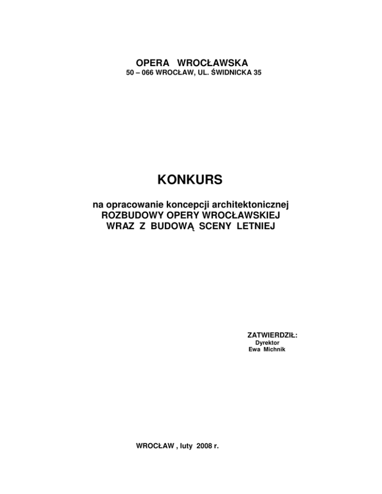 OPERA WROCŁAWSKA 50 – 066 WROCŁAW, UL. ŚWIDNICKA 35 KONKURS na opracowanie koncepcji architektonicznej ROZBUDOWY OPERY WROCŁAWSKIEJ WRAZ Z BUDOWĄ SCENY LETNIEJ ZATWIERDZIŁ: Dyrektor Ewa Michnik WROCŁAW , luty 2008 r. SPIS TREŚCI Część I Postanowienia ogólne Część II Przedmiot , cel i zadanie Konkursu Część III Program i szczegółowy opis przedmiotu Konkursu Część IV Harmonogram Konkursu Część V Warunki uczestnictwa w Konkursie Część VI Wyjaśnienia i modyfikacje treści Regulaminu Konkursu Część VII Miejsce i termin składania wniosków o dopuszczenie do udziału w Konkursie Część VIII Zasady kwalifikacji i dopuszczenia do udziału w Konkursie Część IX Informacja o zakwalifikowaniu Część X Forma i sposób prezentacji pracy konkursowej Część XI Składanie prac konkursowych Część XII Kwalifikacja prac do grupy „N” i „O” Część XIII Skład Sądu Konkursowego Część XIV Kryteria oceny prac konkursowych Część XV Nagrody i wyróżnienie Część XVI Ogłoszenie wyników Konkursu Część XVII Termin wydania nagród i procedura udzielenia zamówienia publicznego Część XVIII Postanowienia dotyczące przejścia autorskich praw majątkowych Część XIX Unieważnienie Konkursu Część XX Środki ochrony prawnej Część XXI Wykaz załączników Część I. Postanowienia ogólne 1. Informacja o Organizatorze Konkursu. Organizatorem Konkursu jest Opera Wrocławska, ul. Świdnicka 35, 50 – 066 Wrocław. Czynności Kierownika Zamawiającego ( Kierownika Organizatora Konkursu ), wykonuje Pani Ewa Michnik - Dyrektor Opery Wrocławskiej. 2 2. Sposób porozumiewania się Organizatora z uczestnikami. 1) Wszelką korespondencję związaną z niniejszym Konkursem należy kierować do Organizatora Konkursu, na adres: Opera Wrocławska , ul. Świdnicka 35, 50 – 066 Wrocław z dopiskiem: „KONKURS NA ROZBUDOWĘ OPERY WROCŁAWSKIEJ WRAZ Z BUDOWĄ SCENY LETNIEJ” Organizator nie bierze odpowiedzialności za skutki braku zachowania przez uczestnika powyższego wymogu. 2) Wszelkie oświadczenia, zawiadomienia, wnioski oraz informacje winny być przekazywane w formie pisemnej. Organizator dopuszcza możliwość przesyłania zawiadomień, wniosków oraz informacji za pomocą faksu, jeżeli ich treść dotrze do Organizatora na adres wskazany w niniejszym Regulaminie przed upływem terminu w nim wskazanego i zostanie niezwłocznie potwierdzona na piśmie przez przekazującego. 3) Regulamin Konkursu dostępny jest w serwisie internetowym Opery : www.opera.wroclaw.pl/1/index.php?page=114 4) Osobą uprawnioną do kontaktów z uczestnikami Konkursu jest Pani mgr inż. Beata Kawińska, pełniąca funkcje Sekretarza Konkursu, tel.( 071) 370 88 60, fax.( 071) 370 88 62 adres e-mail: [email protected] 3. Rodzaj i forma Konkursu. Niniejszy Konkurs jest Konkursem realizacyjnym, jednoetapowym, prowadzonym na podstawie przepisów Działu III, Rozdziału 3 ustawy z dnia 29 stycznia 2004 r. Prawo zamówień publicznych (tekst jednolity Dz. U. Nr 223 z 2007r., poz. 1655) zwaną w dalszej treści niniejszego Regulaminu „ustawą Pzp ”. 4. Planowane koszty inwestycji. Maksymalny planowany koszt wykonania prac realizowanych na podstawie pracy konkursowej, nie może być wyższy od kwoty 85 233 000 zł (bez podatku VAT) . W/w kwota obejmuje wszystkie koszty przedsięwzięcia inwestycyjnego w szczególności: przygotowanie terenu, przyłączenie obiektów do sieci, budowę obiektu podstawowego, instalacje, zagospodarowanie terenu, wyposażenie, rozruch a także koszty: projektowe, obsługi inwestorskiej, nadzoru autorskiego. Część II. Przedmiot, cel i zadanie Konkursu 1. Przedmiot Konkursu. Przedmiotem Konkursu jest koncepcja architektoniczna ROZBUDOWY OPERY WROCŁAWSKIEJ WRAZ Z BUDOWĄ SCENY LETNIEJ oraz koncepcją zagospodarowania terenu w granicach objętych opracowaniem konkursowym, w tym idea budynku frontowego od strony Placu Wolności. 2. Cel i zadanie Konkursu. 1) Celem Konkursu jest uzyskanie najlepszych rozwiązań architektonicznych dla realizacji przedsięwzięcia pn. „ROZBUDOWA OPERY WROCŁAWSKIEJ WRAZ Z BUDOWĄ SCENY LETNIEJ” 2) Zadaniem Konkursu jest wybranie spośród złożonych prac konkursowych, najwyżej ocenionej przez Sąd Konkursowy, której autor (osoba fizyczna, osoba prawna lub jednostka nie posiadająca osobowości prawnej, lub która złożyła wspólny wniosek (art.23 ustawy Pzp)/zespół autorski) 3 otrzyma nagrodę oraz zaproszenie do udziału w postępowaniu o udzielenie zamówienia publicznego w trybie z wolnej ręki na opracowanie: dokumentacji projektowej, specyfikacji technicznej wykonania i odbioru robót (STWiOR), kosztorysu inwestorskiego dla zadania inwestycyjnego „ROZBUDOWA OPERY WROCŁAWSKIEJ WRAZ Z BUDOWĄ SCENY LETNIEJ” oraz pełnieniem nadzoru autorskiego nad realizacją inwestycji . 3. Zakres zadania inwestycyjnego Planowana inwestycja obejmuje realizację szeregu funkcji, które ze względu na szczupłość powierzchni nie mogły być zrealizowane w wystarczającej wielkości w budynku głównym w czasie ostatniej przebudowy. Jednocześnie przeniesienie części funkcji do projektowanej rozbudowy pozwoli na po-szerzenie tych, które są niezbędne w bezpośredniej bliskości zaplecza scenicznego. Zadanie inwestycyjne „ROZBUDOWA OPERY WROCŁAWSKIEJ WRAZ Z BUDOWĄ SCENY LETNIEJ” obejmuje: - wielofunkcyjne zadaszone forum integrujące cały zespół – scena letnia, - zespół sal prób orkiestry, baletu i chóru, - zespół przygotowywania i przechowywania kostiumów, - zespół opracowywania dekoracji i rekwizytów oraz ich przechowywania, - zespół administracyjno-biurowy, - zespół garderób i pokoi gościnnych, - zespół socjalny i gospodarczo-techniczny, - parking podziemny dla pracowników i widzów, - gastronomia, handel i usługi ogólnodostępne w parterze budynków. Część III. Program i szczegółowy opis przedmiotu Konkursu. 1. ZAŁOŻENIA OGÓLNE Opera Wrocławska dla realizacji ww. za