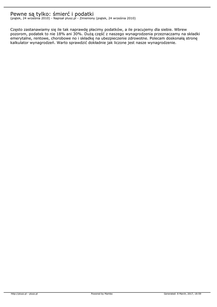 Pewne są tylko: śmierć i podatki (piątek, 24 września 2010) - Napisał plusz.pl - Zmieniony (piątek, 24 września 2010) Często zastanawiamy się ile tak naprawdę płacimy podatków, a ile pracujemy dla siebie. Wbrew pozorom, podatek to nie 18% ani 30%. Dużą część z naszego wynagrodzenia przeznaczamy na składki emerytalne, rentowe, chorobowe no i składkę na ubezpieczenie zdrowotne. Polecam doskonałą stronę kalkulator wynagrodzeń. Warto sprawdzić dokładnie jak liczone jest nasze wynagrodzenie. http://plusz.pl - plusz.pl Powered by Mambo Generated: 8 March, 2017, 18:59