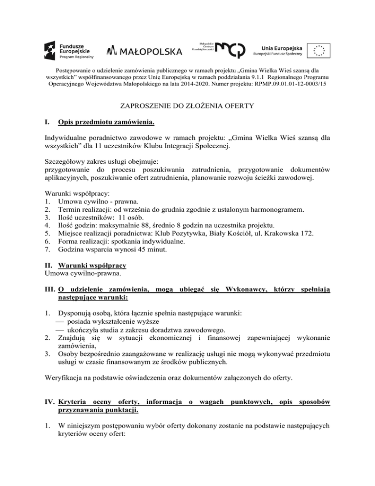 Postępowanie o udzielenie zamówienia publicznego w ramach projektu „Gmina Wielka Wieś szansą dla wszystkich” współfinansowanego przez Unię Europejską w ramach poddziałania 9.1.1 Regionalnego Programu Operacyjnego Województwa Małopolskiego na lata 2014-2020. Numer projektu: RPMP.09.01.01-12-0003/15 ZAPROSZENIE DO ZŁOŻENIA OFERTY I. Opis przedmiotu zamówienia. Indywidualne poradnictwo zawodowe w ramach projektu: „Gmina Wielka Wieś szansą dla wszystkich” dla 11 uczestników Klubu Integracji Społecznej. Szczegółowy zakres usługi obejmuje: przygotowanie do procesu poszukiwania zatrudnienia, przygotowanie dokumentów aplikacyjnych, poszukiwanie ofert zatrudnienia, planowanie rozwoju ścieżki zawodowej. Warunki współpracy: 1. Umowa cywilno - prawna. 2. Termin realizacji: od września do grudnia zgodnie z ustalonym harmonogramem. 3. Ilość uczestników: 11 osób. 4. Ilość godzin: maksymalnie 88, średnio 8 godzin na uczestnika projektu. 5. Miejsce realizacji poradnictwa: Klub Pozytywka, Biały Kościół, ul. Krakowska 172. 6. Forma realizacji: spotkania indywidualne. 7. Godzina wsparcia wynosi 45 minut. II. Warunki współpracy Umowa cywilno-prawna. III. O udzielenie zamówienia, mogą ubiegać się Wykonawcy, którzy spełniają następujące warunki: Dysponują osobą, która łącznie spełnia następujące warunki: posiada wykształcenie wyższe ukończyła studia z zakresu doradztwa zawodowego. 2. Znajdują się w sytuacji ekonomicznej i finansowej zapewniającej wykonanie zamówienia, 3. Osoby bezpośrednio zaangażowane w realizację usługi nie mogą wykonywać przedmiotu usługi w czasie finansowanym ze środków publicznych. 1. Weryfikacja na podstawie oświadczenia oraz dokumentów załączonych do oferty. IV. Kryteria oceny oferty, informacja o wagach punktowych, opis sposobów przyznawania punktacji. 1. W niniejszym postępowaniu wybór oferty dokonany zostanie na podstawie następujących kryteriów oceny ofert: a) cena usługi brutto - 60 % - liczba możliwych do uzyskania punktów = 60 b) doświadczenie osoby wskazanej do realizacji poradnictwa zawodowego – 40% - liczba możliwych do uzyskania punktów = 40 2. Oferty niepodlegające odrzuceniu oceniane będą wg wzoru: Cena: (Cmin / C of. licz.) x 60 = liczba uzyskanych punktów, gdzie: Cmin - najniższa całkowita cena brutto wykonania zamówienia spośród wszystkich ocenianych ofert. C of. licz. - zaoferowana całkowita cena brutto wykonania zamówienia w ofercie ocenianej. Końcowy wyniki powyższego działania zostanie zaokrąglony do 2 miejsc po przecinku. 3. Punkty za kryterium „doświadczenie osoby wskazanej do realizacji poradnictwa zawodowego”. Doświadczenie osoby wskazanej do realizacji poradnictwa zawodowego oceniane będzie przy zastosowaniu następującej punktacji: Od 1 do 10 godzin przeprowadzonego poradnictwa zawodowego - 2 pkt Powyżej 10 do 20 godzin przeprowadzonego poradnictwa zawodowego – 10 pkt Powyżej 20 do 50 godzin przeprowadzonego poradnictwa zawodowego – 30 pkt Powyżej 50 godzin przeprowadzonego poradnictwa zawodowego – 40 pkt. Punkty się nie sumują. Maksymalna ilość punktów możliwa do uzyskania – 40 pkt. Liczby punktów, o których mowa powyżej, zostaną wpisane do protokołu postępowania, a następnie, po zsumowaniu stanowić będą końcową ocenę oferty. Zamawiający udzieli zamówienia temu Wykonawcy, którego oferta uzyska największą liczbą punktów, tj. będzie przedstawiać najkorzystniejszy bilans kryteriów oceny ofert. Jeżeli nie można wybrać oferty najkorzystniejszej z uwagi na to, że dwie lub więcej ofert przedstawia taki sam bilans kryteriów oceny ofert, zamawiający spośród tych ofert wybierze ofertę z najniższą ceną. V. Dokumenty które będą wymagane przez zamawiającego przed zawarciem umowy: 1. 2. 3. Oświadczenie wykonawcy, o spełnieniu warunków określonych w pkt III, Lista specjalistów biorących udział w realizacji usługi, wraz z opisem ich kwalifikacji CV. Informacja cenowa – stawka za 1 godzinę brutto. VI. Miejsce oraz termin składania ofert. Informację dotyczącą stawki godzinowej brutto realizacji usługi (w tym stawka VAT) oraz pozostałe wymagane dokumenty oraz oświadczenia proszę przesłać na adres e-mail: [email protected], lub w formie pisemnej osobiście lub pocztą (decyduje data wpływu) na adres siedziby Zamawiającego: GOPS, 32-085 Szyce, Plac Wspólnoty 2 do dnia 13.09.2016 roku do godz. 9:00. Każdy wykonawca może złożyć tylko jedną ofertę. W przypadku złożenia przez jednego wykonawcę więcej niż jednej oferty, wszystkie oferty złożone przez tego Wykonawcę podlegać będą odrzuceniu. VII.Warunki zmiany umowy zawartej w wyniku przeprowadzonego postępowania o udzielenie zamówienia publicznego. 1. 2. Zamawiający przewiduje możliwość istotnych zmian postanowień zawartej umowy. Wprowadzone zmiany dotyczyć mogą w szczególności terminu realizacji umowy w przypadku wystąpienia okoliczności niezależnych od zamawiającego lub wykonawcy. Zmiany wprowadzone zostaną pod rygorem nieważności w formie pisemnej po wcześniejszym zgłoszeniu przez którąkolwiek ze stron umowy, faktu zaistnienia okoliczności warunkującej konieczność wprowadzenia zmiany oraz obustronnej ich akceptacji. Zamawiający przewiduje możliwość unieważnienia postępowania o udzielenie zamówienia i odstąpienia od umowy w przypadku nie pozyskania środków pochodzących z budżetu Unii Europejskiej, które miały być przeznaczone na sfinansowanie projektu.
