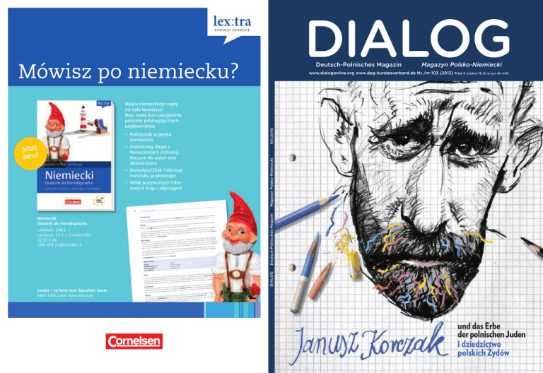 DIALOG Deutsch-Polnisches Magazin Mówisz po niemiecku? Niemiecki Deutsch als Fremdsprache Lehrbuch, 248 S. + Lernbuch, 72 S. + 2 Audio-CDs 22,95 € (D) ISBN 978-3-589-01081-3 w. Struktura a się z 20 rozdziałó buch, który skład poszerzana. podręcznik Lehr cznie i spójnie entem kursu jest jest systematy Głównym elem sama, a ich treść ziałów jest taka wszystkich rozd na płytach znajdują się także ch dialogów, które Dialog jednego lub dwó zacz yna się od należy wybrać. Każdy rozdział m odponumer nagrania pote jaki , móc by muje , infor miałeś treść CD. Symbol pewny, że zrozu nowy wyraz, to, aż będziesz h słów – każdy esz j dialogi tak częs a znać wszystkic iesz rozumiał, moż Słuchaj i czyta dialogu. Nie trzeb nagrania nie będz aniu nia dotyczące pyta słuch na prze zieć wied krotnym nawet po kilku którego znaczenia Wortschatz. yce rubr w zy sprawdzić ka. Nowe wyra ują się nowe słów dialogu lub w których znajd Wortschatz ieskie rubr yki, si się do kontekstu zapisać znajdziesz nieb (tłumaczenie odno gdzie możesz W podręczniku język angielski ie wolne miejsce, tłumaczone na nowego wyrazu. po prawej stron anie ziesz mięt i zdania są prze znajd zapa Ci każdym wyrazie tki, ułatwiające nym, ćwiczeń). Przy lub dopisać nota rodzaju gramatycz języku polskim, tłumaczenie w informacja o jego dowiesz ci podręcznika znajduje się także zu. W dalszej częś ym rzeczowniku Przy każdym now c się nowego wyra uczą ać, mięt eś zapa którą powinien mnogiej. t formy liczby się więcej na tema erny Glossar. znajdziesz obsz W Begleitbuch Lehrbuch Wortschatz . . . to eat ............... essen . . . . . . . . . . . . fried sausage ü-e . . . . . . . . . die Bratwurst, . . to be hungry ............... … Hunger haben . . . I would like ............... Ich möchte . . ćwiczeniu rozu e CD, które służą schatz. Słuchaj nagrane na płyci i rubr yce Wort lub dwa dialogi, ce. zawiera jeden ziesz po pytaniach enia tekstu w książ Każdy rozdział iku dialogi te znajd iku. najlepiej bez śledz ęczn u. W podręczn razem podr słuch w ze u szym ia z tekst mien za pierw miesz, skorz ystaj to, jak trzeba, a l czegoś nie rozu dialogów tak częs ym słuchaniu nada Jeśli po kilkukrotn na gramaSą one opar te ne i przykłady. kroku, jak śnienia gramatycz iesz się krok po Grammatik obja dow j stkie . Tuta znajdziesz wszy tkowe ilustracje. Dialog i Hören. doda ciach ą częś W tej rubr yce rzysz w towa to ła wprowadzona śnieniom częs tyce, która zosta i używany. Obja jest zbudowany język niemiecki z . Kluc odpowieo już się nauczyłeś masz tórzyć to, czeg Übung jetzt Sie !““ – tutaj ćwiczyć i pow zeniami możesz zatytułowane „Und poznasz nowe W rubr yce z ćwic tóre zadania są . W ten sposób Niek ch. sobie o ji eitbu mac w Begl dzi znajdziesz nia, używając infor ch. pyta owa na rozm zenia ych wied ienn możliwość odpo przydatne w codz byś sam mógł ty, które będą gu z lukami, tak słownictwo i zwro luki. i mają formę dialo ią rodziału, mają materiał audio o związane z treśc zawierają także gi, które są blisk Inne ćwiczenia . Niektóre dialo iecku niem po mówić Hören Lextra – so lernt man Sprachen heute Mehr Infos unter www.lextra.de 103 (2013) p Einleitung | Wstę Deutsch-Polnisches Magazin 6 Preis 5 €/cena 12 zł (w tym 5% VAT) DIALOG Jetzt neu! oô PodrĊcznik w jĊzyku niemieckim oô Dodatkowy skrypt z tłumaczeniami instrukcji, kluczem do zadaĔ oraz słowniczkiem oô DwiepłytyCD(ok.140minut materiału jĊzykowego) oô Wiele poĪytecznych informacji o kraju i obyczajach www.dialogonline.org www.dpg-bundesverband.de Nr. /nr 103 (2013) Magazyn Polsko-Niemiecki Nauka niemieckiego nigdy nie była łatwiejsza! Nasz nowy kurs uwzglĊdnia potrzeby polskojĊzycznych uĪytkowników. Magazyn Polsko-Niemiecki und das Erbe der polnischen Juden i dziedzictwo polskich Żydów DIALOG • Deutsch-Polnisches Magazin • Magazyn Polsko-Niemiecki Nr. • nr 103 (2013), XXVI. Jahrgang • rocznik XXVI, Umschlag • okładka: Wiesław Smętek Herausgeber • wydawca: Deutsch-Polnische Gesellschaft Bundesverband, www.dpg-bundesverband.de Partner in Polen • partner w Polsce „Przegląd Polityczny” • www.przegladpolityczny.pl • Facebook: DIALOG Deutsch -Polnisches Magazin Basil Kerski Chefredakteur / redaktor naczelny Editorial Od redakcji „Ich bin nicht dazu da, geliebt und bewundert zu werden, sondern um zu handeln und zu lieben. Es ist nicht Pflicht meiner Umgebung, mir zu helfen, sondern ich habe die Pflicht, mich um die Welt, um den Menschen zu kümmern.“ Diese Worte schrieb Janusz Korczak 1942 in sein Tagebuch. Im Warschauer Ghetto begann er wenige Wochen vor seinem Tod ein Tagebuch zu führen. Korczaks Notizen beinhalten nicht nur Bilder aus dem Leben im Ghetto, mit ihnen zieht er auch die Bilanz seines Lebens. Korczaks Aufzeichnungen sind ein Zeugnis des geistigen Widerstandes im Warschauer Ghetto, des Bemühens um den Schutz der Menschenwürde vor der barbarischen Vernichtungspolitik der deutschen Besatzer. 70 Jahre nach Ausbruch des Aufstandes im Warschauer Ghetto wird in diesem Frühjahr in Polens Hauptstadt das Museum der Geschichte der polnischen Juden eröffnet. Dieses Ereignis haben wir zum Anlass genommen, um uns Korczak, der Symbolgestalt der polnischjüdischen Kultur, anzunähern und der Frage nachzugehen, wie das jüdische Erbe heute in Polen gepflegt wird. Die Erinnerungskultur haben wir nicht aus der Perspektive der kulturellen Zentren zu beschreiben versucht. Katarzyna Weintraub hat uns in die Provinz geführt, wo – begünstigt durch die Dezentralisierung – in vielen kleinen Gemeinden Vereine und Stiftungen entstanden sind, die das Erbe der polnischen Juden sichern und an die jüngere Generation weiterreichen. Diese Initiativen decken nicht nur die kulturelle und ethnische Vielschichtigkeit polnischer Geschichte auf, sondern stellen oft auch nationalistische Identitä