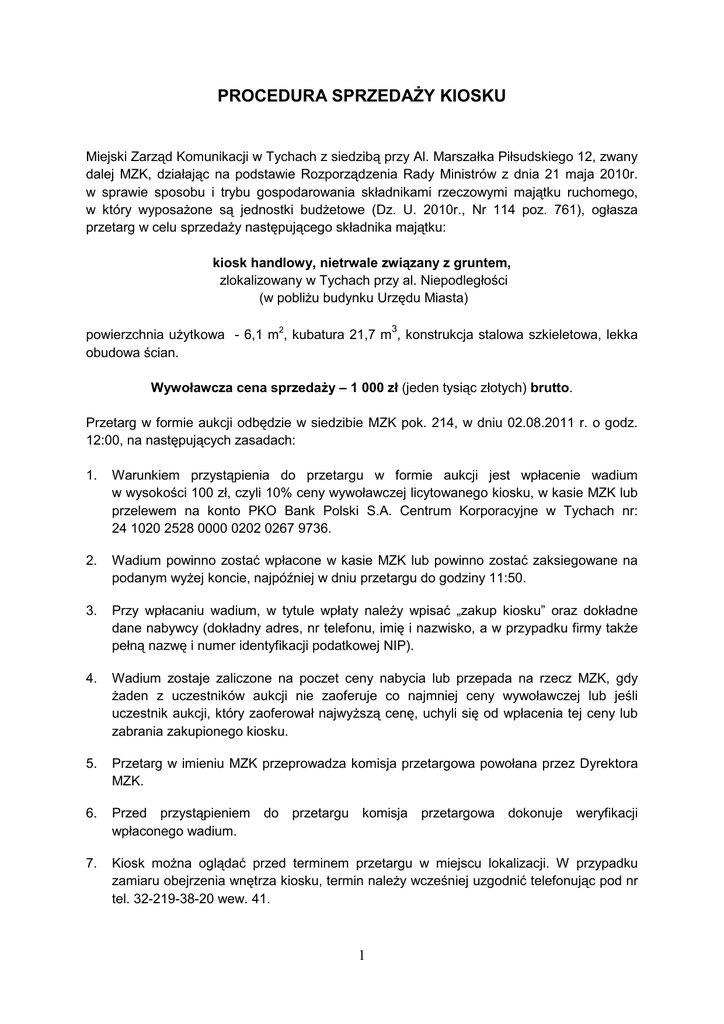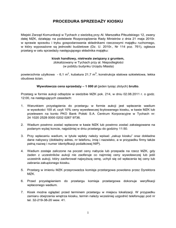 PROCEDURA SPRZEDAśY KIOSKU Miejski Zarząd Komunikacji w Tychach z siedzibą przy Al. Marszałka Piłsudskiego 12, zwany dalej MZK, działając na podstawie Rozporządzenia Rady Ministrów z dnia 21 maja 2010r. w sprawie sposobu i trybu gospodarowania składnikami rzeczowymi majątku ruchomego, w który wyposaŜone są jednostki budŜetowe (Dz. U. 2010r., Nr 114 poz. 761), ogłasza przetarg w celu sprzedaŜy następującego składnika majątku: kiosk handlowy, nietrwale związany z gruntem, zlokalizowany w Tychach przy al. Niepodległości (w pobliŜu budynku Urzędu Miasta) powierzchnia uŜytkowa - 6,1 m2, kubatura 21,7 m3, konstrukcja stalowa szkieletowa, lekka obudowa ścian. Wywoławcza cena sprzedaŜy – 1 000 zł (jeden tysiąc złotych) brutto. Przetarg w formie aukcji odbędzie w siedzibie MZK pok. 214, w dniu 02.08.2011 r. o godz. 12:00, na następujących zasadach: 1. Warunkiem przystąpienia do przetargu w formie aukcji jest wpłacenie wadium w wysokości 100 zł, czyli 10% ceny wywoławczej licytowanego kiosku, w kasie MZK lub przelewem na konto PKO Bank Polski S.A. Centrum Korporacyjne w Tychach nr: 24 1020 2528 0000 0202 0267 9736. 2. Wadium powinno zostać wpłacone w kasie MZK lub powinno zostać zaksiegowane na podanym wyŜej koncie, najpóźniej w dniu przetargu do godziny 11:50. 3. Przy wpłacaniu wadium, w tytule wpłaty naleŜy wpisać „zakup kiosku” oraz dokładne dane nabywcy (dokładny adres, nr telefonu, imię i nazwisko, a w przypadku firmy takŜe pełną nazwę i numer identyfikacji podatkowej NIP). 4. Wadium zostaje zaliczone na poczet ceny nabycia lub przepada na rzecz MZK, gdy Ŝaden z uczestników aukcji nie zaoferuje co najmniej ceny wywoławczej lub jeśli uczestnik aukcji, który zaoferował najwyŜszą cenę, uchyli się od wpłacenia tej ceny lub zabrania zakupionego kiosku. 5. Przetarg w imieniu MZK przeprowadza komisja przetargowa powołana przez Dyrektora MZK. 6. Przed przystąpieniem wpłaconego wadium. 7. Kiosk moŜna oglądać przed terminem przetargu w miejscu lokalizacji. W przypadku zamiaru obejrzenia wnętrza kiosku, termin naleŜy wcześniej uzgodnić telefonując pod nr tel. 32-219-38-20 wew. 41. do przetargu komisja przetargowa dokonuje weryfikacji 1 8. Podczas przetargu minimalne postąpienie wynosić będzie 50 zł. 9. Z chwilą przybicia następuje zawarcie ustnej umowy sprzedaŜy przedmiotu przetargu, a nabywca, który zgłosił najwyŜszą cenę jest zobowiązany zapłacić zgłoszoną cenę nabycia (pomniejszoną o wpłacone wadium), na podstawie faktury wystawionej przez MZK, niezwłocznie, jednak nie później niŜ w ciągu 5 dni roboczych od daty przetargu. 10. Nabywca jest zobowiązany do zabrania kiosku z miejsca lokalizacji na swój koszt, w terminie 7 dni od daty zapłacenia ceny nabycia. 11. W przypadku nie zapłacenia przez nabywcę ceny nabycia, o której mowa w pkt. 9 lub nie zabrania kiosku z miejsca lokalizacji w terminie określonym w pkt. 10, umowa sprzedaŜy przedmiotu przetargu ulega uniewaŜnieniu. 12. W przypadku uniewaŜnienia umowy sprzedaŜy na zasadach określonych w pkt. 10, wadium wpłacone przez nabywcę przechodzi na własność MZK. 13. Miejski Zarząd Komunikacji w Tychach zastrzega sobie prawo uniewaŜnienia przetargu bez wybrania którejkolwiek z ofert, bez podania przyczyn. Osobami upowaŜnionymi przez MZK do kontaktu z nabywcami są: 1. w zakresie proceduralnym: Bolesław Twaróg – Kierownik Sekcji Planowania i Wykonywania Usług tel. (32) 219 38 20, wew. 41, e-mail: [email protected] 2. w zakresie merytorycznym: Dariusz Olędzki – Kierownik Działu Organizacji i Kontroli Komunikacji tel. (32) 219 38 20, wew. 26, e-mail: [email protected] 2
