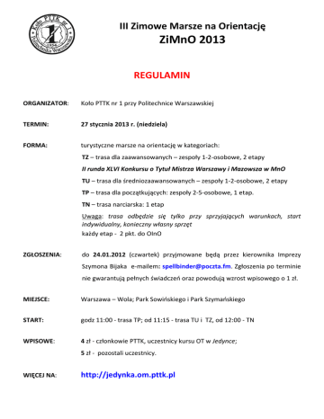 III Zimowe Marsze na Orientację ZiMnO 2013 REGULAMIN ORGANIZATOR: Koło PTTK nr 1 przy Politechnice Warszawskiej TERMIN: 27 stycznia 2013 r. (niedziela) FORMA: turystyczne marsze na orientację w kategoriach: TZ – trasa dla zaawansowanych – zespoły 1-2-osobowe, 2 etapy II runda XLVI Konkursu o Tytuł Mistrza Warszawy i Mazowsza w MnO TU – trasa dla średniozaawansowanych – zespoły 1-2-osobowe, 2 etapy TP – trasa dla początkujących: zespoły 2-5-osobowe, 1 etap. TN – trasa narciarska: 1 etap Uwaga: trasa odbędzie się tylko przy sprzyjających warunkach, start indywidualny, konieczny własny sprzęt każdy etap - 2 pkt. do OInO ZGŁOSZENIA: do 24.01.2012 (czwartek) przyjmowane będą przez kierownika Imprezy Szymona Bijaka e-mailem: [email protected]. Zgłoszenia po terminie nie gwarantują pełnych świadczeń oraz powodują wzrost wpisowego o 1 zł. MIEJSCE: Warszawa – Wola; Park Sowińskiego i Park Szymańskiego START: godz 11:00 - trasa TP; od 11:15 - trasa TU i TZ, od 12:00 - TN WPISOWE: 4 zł - członkowie PTTK, uczestnicy kursu OT w Jedynce; 5 zł - pozostali uczestnicy. WIĘCEJ NA: http://jedynka.om.pttk.pl
