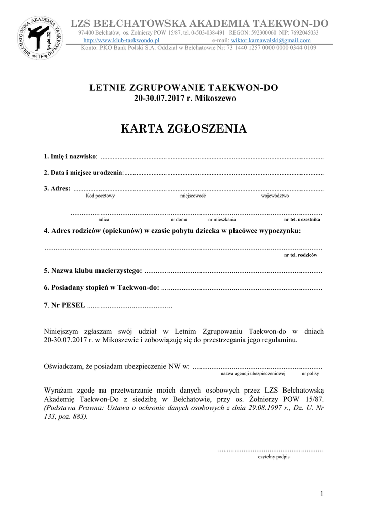 LZS BEŁCHATOWSKA AKADEMIA TAEKWON-DO 97-400 Bełchatów, os. Żołnierzy POW 15/87, tel. 0-503-038-491 REGON: 592300060 NIP: 7692045033 http://www.klub-taekwondo.pl e-mail: [email protected] Konto: PKO Bank Polski S.A. Oddział w Bełchatowie Nr: 73 1440 1257 0000 0000 0344 0109 LETNIE ZGRUPOWANIE TAEKWON-DO 20-30.07.2017 r. Mikoszewo KARTA ZGŁOSZENIA 1. Imię i nazwisko: ................................................................................................................................... 2. Data i miejsce urodzenia: ..................................................................................................................... 3. Adres: ................................................................................................................................................... miejscowość Kod pocztowy województwo ........................................................................................................................................ ulica nr domu nr mieszkania nr tel. uczestnika 4. Adres rodziców (opiekunów) w czasie pobytu dziecka w placówce wypoczynku: ...................................................................................................................................................... nr tel. rodziców 5. Nazwa klubu macierzystego: ................................................................................................ 6. Posiadany stopień w Taekwon-do: ....................................................................................... 7. Nr PESEL .............................................. Niniejszym zgłaszam swój udział w Letnim Zgrupowaniu Taekwon-do w dniach 20-30.07.2017 r. w Mikoszewie i zobowiązuję się do przestrzegania jego regulaminu. Oświadczam, że posiadam ubezpieczenie NW w: ...................................................................... nazwa agencji ubezpieczeniowej nr polisy Wyrażam zgodę na przetwarzanie moich danych osobowych przez LZS Bełchatowską Akademię Taekwon-Do z siedzibą w Bełchatowie, przy os. Żołnierzy POW 15/87. (Podstawa Prawna: Ustawa o ochronie danych osobowych z dnia 29.08.1997 r., Dz. U. Nr 133, poz. 883). ......................................................... czytelny podpis 1 ZGODA RODZICÓW (OPIEKUNÓW) Wyrażam zgodę na udział syna/córki: ........................................................................................ w Letnim Zgrupowaniu Taekwon-do w dniach 20-30.07.2017 r. w Mikoszewie organizowanym przez LZS Bełchatowską Akademię Taekwon-Do z siedzibą w Bełchatowie, przy os. Żołnierzy POW 15/87. ........................................................ czytelny podpis rodzica /opiekuna nieletniego ....................................................... pieczęć przychodni OPINIA LEKARSKA Zaświadcza się, że Kol. ............................................................................................. nie posiada przeciwwskazań zdrowotnych do wzięcia udziału w zgrupowaniu sportowo-szkoleniowym Taekwon-Do, które odbędzie się w dniach 20-30.07.2017 r. w Mikoszewie .................................................... pieczęć i podpis lekarza INFORMACJA RODZICÓW (OPIEKUNÓW) O STANIE ZDROWIA DZIECKA (np. na co dziecko jest uczulone, jak znosi jazdę samochodem, czy przyjmuje stale leki i w jakich dawkach, czy nosi aparat ortodontyczny lub okulary, itp.) ....................................................................................................................................................... ....................................................................................................................................................... ....................................................................................................................................................... Stwierdzam, że podałam(em) wszystkie znane mi informacje o dziecku, które mogą pomóc w zapewnieniu właściwej opieki w czasie pobytu dziecka w placówce wypoczynku. Oświadczam, że w przypadku konieczności interwencji medycznej i braku możliwości kontaktu ze mną wyrażam zgodę na badania i leczenie ratujące zdrowie lub życie mojego dziecka oraz podawanie leków przepisanych przez lekarza pierwszego kontaktu, lekarza specjalistę lub środków farmakologicznych doraźnych w sytuacjach np. gorączki, bólu, itp. podczas jego pobytu w Mikoszewie w dniach 20-30.07.2017 r. ............................. data .......................................................................... czytelny podpis rodzica /opiekuna nieletniego 2 ZGODA NA WYKORZYSTANIE WIZERUNKU DZIECKA Oświadczam, że wyrażam zgodę na rejestrowanie wizerunku mojego dziecka ………………………………………………………………………………………………… ( imię/imiona i nazwisko dziecka) podczas zajęć Letniego Zgrupowania Taekwon-Do w dniach 20-30.07.2017 r. w Mikoszewie oraz wykorzystanie tego wizerunku poprzez umieszczanie informacji, zdjęć i filmów na stronie internetowej Klubu oraz w innych mediach lokalnych w celu informacji i promocji Taekwon-Do. Jednocześnie przyjmuję do wiadomości, że wizerunek mojego dziecka będzie wykorzystywany tylko i wyłącznie w celu promocji i potrzeb funkcjonowania LZS Bełchatowska Akademia Taekwon-Do z siedzibą w Bełchatowie, przy os. Żołnierzy POW 15/87. Podstawa prawna: 1. Ustawa o ochronie danych osobowych (tekst jedn.: Dz. U. z 2002 nr 101, poz. 926 ze zm.); 2. Ustawa o prawie autorskim i prawach pokrewnych (tekst jedn.: Dz. U. z 2006 nr 90, poz. 631 ze zm.). ..…………………..………………………….. ..………………………………………………. (czytelne podpisy obojga rodziców lub prawnych opiekunów ) 3 Regulamin zgrupowania 20-30.07.2017 r. Mikoszewo dotyczy wszystkich uczestników zgrupowania bez względu na wiek 1. Uczestnik zgrupowania musi obowiązkowo brać udział w treningach i zajęciach programowych. 2. Przestrzegać 