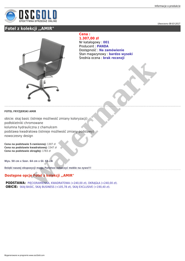 Informacje o produkcie Utworzono 08-03-2017 Fotel z kolekcji ,,AMIR" Cena : 1.307,00 zł FOTEL FRYZJERSKI AMIR er m ar k Nr katalogowy : 001 Producent : PANDA Dostępność : Na zamówienie Stan magazynowy : bardzo wysoki Średnia ocena : brak recenzji obicie: skaj basic (istnieje możliwość zmiany koloryzacji) podłokietniki chromowane kolumna hydrauliczna z chamulcem podstawa kwadratowa (istnieje możliwość zmiany podstawy) nowoczesny design at Cena na podstawie 5-ramiennej: 1307 zł Cena na podstawie kwadratowej: 1547 zł Cena na podstawie okrągłej: 1783 zł Wys. 50 cm x Szer. 64 cm x Gł. 65 cm w Dzięki naszej ekspozycji mogą Państwo zobaczyć meble na zywo!!! Dostępne opcje Fotel z kolekcji ,,AMIR" PODSTAWA: PIĘCIORAMIENNA, KWADRATOWA (+240,00 zł), OKRĄGŁA (+240,00 zł). OBICIE: SKAJ BASIC, SKAJ BUSINESS (+105,78 zł), SKAJ EXCLUSIVE (+190,40 zł). Wygenerowano w programie www.oscGold.com