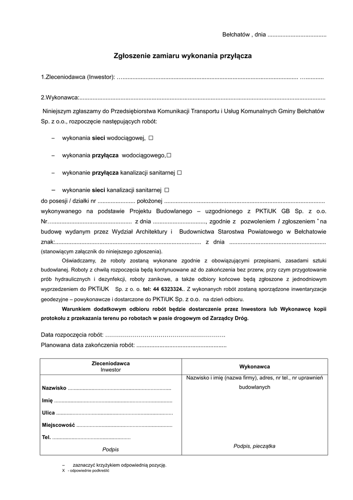 Bełchatów , dnia .................................... Zgłoszenie zamiaru wykonania przyłącza 1.Zleceniodawca (Inwestor): …........................................................................................................... …........... 2.Wykonawca:...................................................................................................................................................... Niniejszym zgłaszamy do Przedsiębiorstwa Komunikacji Transportu i Usług Komunalnych Gminy Bełchatów Sp. z o.o., rozpoczęcie następujących robót: □ – wykonania sieci wodociągowej, – wykonania przyłącza wodociągowego,□ – wykonanie przyłącza kanalizacji sanitarnej □ – wykonanie sieci kanalizacji sanitarnej □ do posesji / działki nr ....................... położonej .................................................................................................. wykonywanego na podstawie Projektu Budowlanego – uzgodnionego z PKTiUK GB Sp. z o.o. Nr…................................................ z dnia ................................, zgodnie z pozwoleniem / zgłoszeniem< =< na budowę wydanym przez Wydział Architektury i Budownictwa Starostwa Powiatowego w Bełchatowie znak:......................................................................................... z dnia ........................................................... (stanowiącym załącznik do niniejszego zgłoszenia). Oświadczamy, że roboty zostaną wykonane zgodnie z obowiązującymi przepisami, zasadami sztuki budowlanej. Roboty z chwilą rozpoczęcia będą kontynuowane aż do zakończenia bez przerw, przy czym przygotowanie prób hydraulicznych i dezynfekcji, roboty zanikowe, a także odbiory końcowe będą zgłoszone z jednodniowym wyprzedzeniem do PKTiUK Sp. z o. o. tel: 44 6323324.. Z wykonanych robót zostaną sporządzone inwentaryzacje geodezyjne – powykonawcze i dostarczone do PKTiUK Sp. z o.o. na dzień odbioru. Warunkiem dodatkowym odbioru robót będzie dostarczenie przez Inwestora lub Wykonawcę kopii protokołu z przekazania terenu po robotach w pasie drogowym od Zarządcy Dróg. Data rozpoczęcia robót: ……………………………………………………. Planowana data zakończenia robót: ....................................................... Zleceniodawca Inwestor Wykonawca Nazwisko i imię (nazwa firmy), adres, nr tel., nr uprawnień Nazwisko ...................................................................... budowlanych Imię ................................................................................ Ulica ............................................................................... Miejscowość ................................................................. Tel. ..................................................... Podpis – zaznaczyć krzyżykiem odpowiednią pozycję. X - odpowiednie podkreślić Podpis, pieczątka