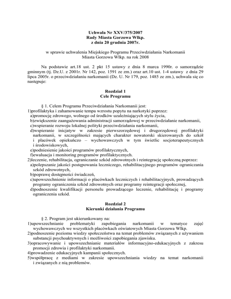 Uchwała Nr XXV/375/2007 Rady Miasta Gorzowa Wlkp. z dnia 20 grudnia 2007r. w sprawie uchwalenia Miejskiego Programu Przeciwdziałania Narkomanii Miasta Gorzowa Wlkp. na rok 2008 Na podstawie art.18 ust. 2 pkt 15 ustawy z dnia 8 marca 1990r. o samorządzie gminnym (tj. Dz.U. z 2001r. Nr 142, poz. 1591 ze zm.) oraz art.10 ust. 1-4 ustawy z dnia 29 lipca 2005r. o przeciwdziałaniu narkomanii (Dz. U. Nr 179, poz. 1485 ze zm.), uchwala się co następuje: Rozdział 1 Cele Programu § 1. Celem Programu Przeciwdziałania Narkomanii jest: 1)profilaktyka i zahamowanie tempa wzrostu popytu na narkotyki poprzez: a)promocję zdrowego, wolnego od środków uzależniających stylu życia, b)zwiększenie zaangażowania administracji samorządowej w przeciwdziałanie narkomanii, c)wspieranie rozwoju lokalnej polityki przeciwdziałania narkomanii, d)wspieranie inicjatyw w zakresie pierwszorzędowej i drugorzędowej profilaktyki narkomanii, w szczególności mających charakter nowatorski skierowanych do szkół i placówek opiekuńczo – wychowawczych w tym świetlic socjoterapeutycznych i środowiskowych, e)podniesienie jakości programów profilaktycznych, f)ewaluacja i monitoring programów profilaktycznych. 2)leczenie, rehabilitacja, ograniczanie szkód zdrowotnych i reintegrację społeczną poprzez: a)polepszanie jakości postępowania leczniczego, rehabilitacyjnego programów ograniczania szkód zdrowotnych, b)poprawę dostępności świadczeń, c)upowszechnienie informacji o placówkach leczniczych i rehabilitacyjnych, prowadzących programy ograniczenia szkód zdrowotnych oraz programy reintegracji społecznej, d)podnoszenie kwalifikacji personelu prowadzącego leczenie, rehabilitację i programy ograniczenia szkód. Rozdział 2 Kierunki działania Programu § 2. Program jest ukierunkowany na: 1)upowszechnianie problematyki zapobiegania narkomanii w tematyce zajęć wychowawczych we wszystkich placówkach oświatowych Miasta Gorzowa Wlkp. 2)podnoszenie poziomu wiedzy społeczeństwa na temat problemów związanych z używaniem substancji psychoaktywnych i możliwości zapobiegania zjawisku. 3)opracowywanie i upowszechnianie materiałów informacyjno-edukacyjnych z zakresu promocji zdrowia i profilaktyki narkomanii. 4)prowadzenie edukacyjnych kampanii społecznych. 5)współpracę z mediami w zakresie upowszechniania wiedzy na temat narkomanii i związanych z nią problemów. 6)polepszanie jakości postępowania leczniczego, rehabilitacyjnego i programów ograniczania szkód zdrowotnych. Rozdział 3 Zadania Programu § 3. Założone w Programie cele są realizowane poprzez zadania w następujących obszarach: 1)zwiększenie dostępności pomocy terapeutycznej i rehabilitacyjnej dla osób uzależnionych i osób zagrożonych uzależnieniem poprzez: a)działalność informacyjną na temat placówek niosących pomoc osobom z problemem narkotykowym i osobom uzależnionym, b)wspomaganie grup terapeutycznych oraz grup wsparcia dla osób uzależnionych i zagrożonych uzależnieniem, c)zakup i upowszechnianie materiałów edukacyjnych, informujących o istocie uzależnień i systemie pomocy. 2)udzielanie rodzinom, w których występują problemy narkomanii, pomocy psychospołecznej i prawnej poprzez: a)działalność informacyjną skierowaną bezpośrednio do rodzin, w których występują problemy narkomanii, b)informowanie o formach pomocy w problemach uzależnienia narkotykowego dostępnych na terenie całego województwa dla dzieci, młodzieży i ich rodziców. 3)prowadzenie profilaktycznej działalności informacyjnej i edukacyjnej oraz szkoleniowej w zakresie rozwiązywania problemów narkomanii, w szczególności dla dzieci i młodzieży poprzez: a)stałe monitorowanie problemu narkomanii na terenie miasta, b)wspieranie placówek oświatowych w prowadzeniu programów profilaktycznych dla dzieci, młodzieży i ich rodziców, c)promowanie zdrowego stylu życia i organizację alternatywnych form spędzania wolnego czasu z dala od uzależnień wśród dzieci i młodzieży, d)prowadzenie programów edukacyjnych, organizacja konkursów, olimpiad, turniejów o tematyce przeciwdziałania narkomanii dla dzieci i młodzieży, e)zakup materiałów o tematyce przeciwdziałania narkomanii i ich dystrybucja wśród instytucji działających na rzecz profilaktyki uzależnień, f)realizację zadań we współpracy ze szkołami z terenu Miasta Gorzowa Wlkp., ze świetlicami środowiskowymi i socjoterapeutycznymi oraz innymi organizacjami i instytucjami działającymi na terenie miasta. 4)wspomaganie działań instytucji, organizacji pozarządowych osób fizycznych służących rozwiązywaniu problemów narkomanii poprzez: a)zlecanie do realizacji zadań wynikających z Programu, b)współorganizowanie tematycznych konferencji i spotkań poświęconych problemom narkomanii na terenie miasta, c)włączanie się w przygotowanie i organizację konferencji dla pracowników organizacji działających w zakresie rozwiązywania problemów narkomanii, d)współorganizowanie szkoleń w zakresie rozwiązywania problemów narkomanii dla poszczególnych grup zawodowych mających do czynienia z osobami zagrożonymi uzależnieniem z terenu miasta, e)udział w lokalnych kampaniach edukacyjnych związanych z profilaktyką narkotykową. Rozdział 4 Sposoby realizacji i źródła finansowania Programu § 4. 1.Program realizowany jest we współpracy osób, instytucji rządowych i samorządowych oraz organizacji pozarządowych, a także grup samopomocowych zajmujących się zdrowiem, edukacją, kulturą, pomocą społeczną, sportem oraz wychowaniem w trzeźwości. 2.Program uwzględnia lokalne możliwości realizacji pod względem prawnym, administracyjnym i ekonomicznym, a także wiedzę na temat przeciwdziałania uzależnieniom, leczenia, rehabilitacji i resocjalizacji osób uzależnionych oraz redukcji szkód społecznych spowodowanych uzależnieniem i współuzależnieniem. 3.Źródłem finansowania zadań wynikających z Progr