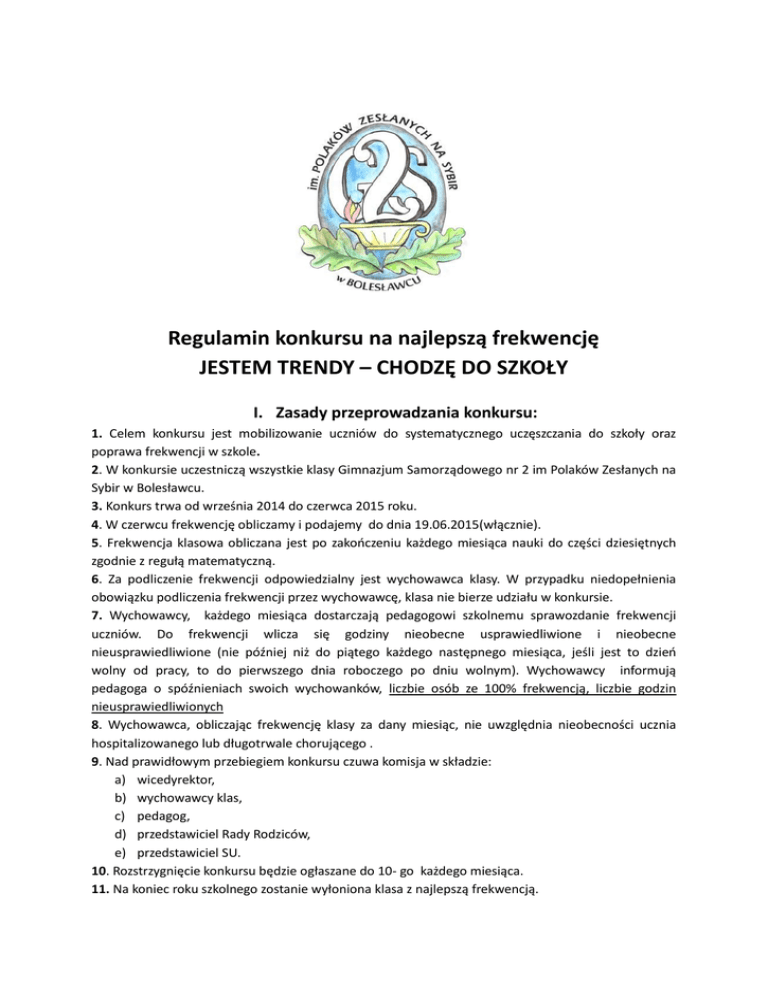 Regulamin konkursu na najlepszą frekwencję JESTEM TRENDY – CHODZĘ DO SZKOŁY I. Zasady przeprowadzania konkursu: 1. Celem konkursu jest mobilizowanie uczniów do systematycznego uczęszczania do szkoły oraz poprawa frekwencji w szkole. 2. W konkursie uczestniczą wszystkie klasy Gimnazjum Samorządowego nr 2 im Polaków Zesłanych na Sybir w Bolesławcu. 3. Konkurs trwa od września 2014 do czerwca 2015 roku. 4. W czerwcu frekwencję obliczamy i podajemy do dnia 19.06.2015(włącznie). 5. Frekwencja klasowa obliczana jest po zakończeniu każdego miesiąca nauki do części dziesiętnych zgodnie z regułą matematyczną. 6. Za podliczenie frekwencji odpowiedzialny jest wychowawca klasy. W przypadku niedopełnienia obowiązku podliczenia frekwencji przez wychowawcę, klasa nie bierze udziału w konkursie. 7. Wychowawcy, każdego miesiąca dostarczają pedagogowi szkolnemu sprawozdanie frekwencji uczniów. Do frekwencji wlicza się godziny nieobecne usprawiedliwione i nieobecne nieusprawiedliwione (nie później niż do piątego każdego następnego miesiąca, jeśli jest to dzień wolny od pracy, to do pierwszego dnia roboczego po dniu wolnym). Wychowawcy informują pedagoga o spóźnieniach swoich wychowanków, liczbie osób ze 100% frekwencją, liczbie godzin nieusprawiedliwionych 8. Wychowawca, obliczając frekwencję klasy za dany miesiąc, nie uwzględnia nieobecności ucznia hospitalizowanego lub długotrwale chorującego . 9. Nad prawidłowym przebiegiem konkursu czuwa komisja w składzie: a) wicedyrektor, b) wychowawcy klas, c) pedagog, d) przedstawiciel Rady Rodziców, e) przedstawiciel SU. 10. Rozstrzygnięcie konkursu będzie ogłaszane do 10- go każdego miesiąca. 11. Na koniec roku szkolnego zostanie wyłoniona klasa z najlepszą frekwencją. 12. Punktacja miesięczna: A. 45 punktów –frekwencja od 96% i powyżej B. 40 punktów – frekwencja od 94% do 95% C. 35 punktów – frekwencja od 92% do 93% D. 30 punktów - frekwencja od 90% do 91 % E. 25 punktów - frekwencja od 88% do 89% F. 20 punktów - frekwencja od 86% do 87% G. 15 punktów - frekwencja od 84% do 85% H. 10 punktów - frekwencja od 82% do 83% I. 5 punktów - frekwencja od 80% do 81% J. 0 punktów - frekwencja od 79% i poniżej 13. Za każdego ucznia ze 100 % frekwencją w danym miesiącu klasa otrzymuje dodatkowych 10 punktów. 14. W kategorii spóźnień i lekcji opuszczonych bez usprawiedliwienia klasa może otrzymać od „ – 28” punktów do „ – 2” punktów. Liczba punktów wynika z uzyskanego miejsca w rankingu. Najlepszy wynik, to brak punktów ujemnych (w sytuacji gdy klasa nie ma godzin nieusprawiedliwionych lub spóźnień), najsłabszy to „ - 28”punktów . 15. Zestawienie wyników konkursu przygotowuje pedagog. Dane prezentowane są na tablicy ogłoszeń. 16. Uczeń ze 100% roczną frekwencją otrzymuje na koniec roku szkolnego list gratulacyjny dyrektora szkoły. 17. Ogłoszenie wyników nastąpi: 25-06-2015 roku dla klas trzecich 26-06-2015 roku dla klas I-II II. Nagrody * Klasom za zajęcie I, II, III miejsca w każdym miesiącu zostaną przyznane nagrody w postaci tytułu oraz związane z nimi przywileje; I miejsce – LUZAKI - 3 dni bez sprawdzianów i pytania, II miejsce – LAJCIAKI – 2 dni bez sprawdzianów i pytania, III miejsce –SUPERAKI - 1 dzień bez sprawdzianów i pytania. W tym okresie uczniowie mogą być pytani tylko na własną prośbę. *Zwycięskie klasy wybierają i podają wychowawcy dni, w których będą korzystać z w/w przywilejów z zastrzeżeniem, że wybrane dni nie mogą być tymi samymi dniami tygodnia. Klasa , która zajmie I miejsce w rywalizacji rocznej zostanie nagrodzona dyplomem i cukierkami. Uwaga: Regulamin po I semestrze zostanie poddany ocenie i ewentualnie zmodyfikowany.