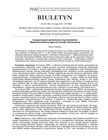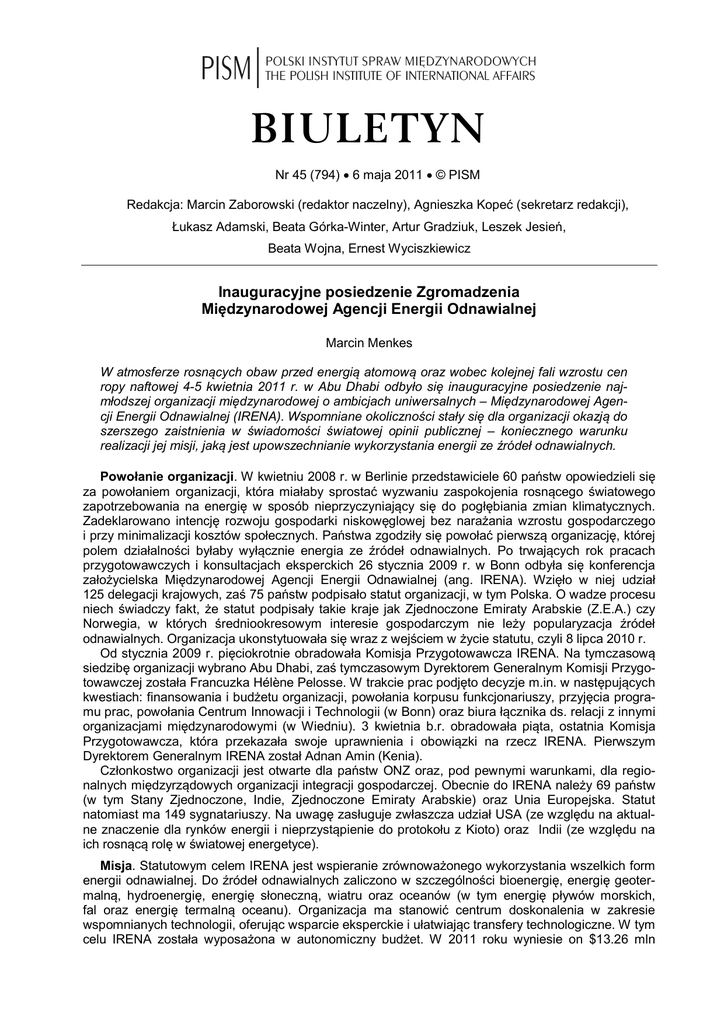 BIULETYN Nr 45 (794) 6 maja 2011 © PISM Redakcja: Marcin Zaborowski (redaktor naczelny), Agnieszka Kopeć (sekretarz redakcji), Łukasz Adamski, Beata Górka-Winter, Artur Gradziuk, Leszek Jesień, Beata Wojna, Ernest Wyciszkiewicz Inauguracyjne posiedzenie Zgromadzenia Międzynarodowej Agencji Energii Odnawialnej Marcin Menkes W atmosferze rosnących obaw przed energią atomową oraz wobec kolejnej fali wzrostu cen ropy naftowej 4-5 kwietnia 2011 r. w Abu Dhabi odbyło się inauguracyjne posiedzenie najmłodszej organizacji międzynarodowej o ambicjach uniwersalnych – Międzynarodowej Agencji Energii Odnawialnej (IRENA). Wspomniane okoliczności stały się dla organizacji okazją do szerszego zaistnienia w świadomości światowej opinii publicznej – koniecznego warunku realizacji jej misji, jaką jest upowszechnianie wykorzystania energii ze źródeł odnawialnych. Powołanie organizacji. W kwietniu 2008 r. w Berlinie przedstawiciele 60 państw opowiedzieli się za powołaniem organizacji, która miałaby sprostać wyzwaniu zaspokojenia rosnącego światowego zapotrzebowania na energię w sposób nieprzyczyniający się do pogłębiania zmian klimatycznych. Zadeklarowano intencję rozwoju gospodarki niskowęglowej bez narażania wzrostu gospodarczego i przy minimalizacji kosztów społecznych. Państwa zgodziły się powołać pierwszą organizację, której polem działalności byłaby wyłącznie energia ze źródeł odnawialnych. Po trwających rok pracach przygotowawczych i konsultacjach eksperckich 26 stycznia 2009 r. w Bonn odbyła się konferencja założycielska Międzynarodowej Agencji Energii Odnawialnej (ang. IRENA). Wzięło w niej udział 125 delegacji krajowych, zaś 75 państw podpisało statut organizacji, w tym Polska. O wadze procesu niech świadczy fakt, że statut podpisały takie kraje jak Zjednoczone Emiraty Arabskie (Z.E.A.) czy Norwegia, w których średniookresowym interesie gospodarczym nie leży popularyzacja źródeł odnawialnych. Organizacja ukonstytuowała się wraz z wejściem w życie statutu, czyli 8 lipca 2010 r. Od stycznia 2009 r. pięciokrotnie obradowała Komisja Przygotowawcza IRENA. Na tymczasową siedzibę organizacji wybrano Abu Dhabi, zaś tymczasowym Dyrektorem Generalnym Komisji Przygotowawczej została Francuzka Hélène Pelosse. W trakcie prac podjęto decyzje m.in. w następujących kwestiach: finansowania i budżetu organizacji, powołania korpusu funkcjonariuszy, przyjęcia programu prac, powołania Centrum Innowacji i Technologii (w Bonn) oraz biura łącznika ds. relacji z innymi organizacjami międzynarodowymi (w Wiedniu). 3 kwietnia b.r. obradowała piąta, ostatnia Komisja Przygotowawcza, która przekazała swoje uprawnienia i obowiązki na rzecz IRENA. Pierwszym Dyrektorem Generalnym IRENA został Adnan Amin (Kenia). Członkostwo organizacji jest otwarte dla państw ONZ oraz, pod pewnymi warunkami, dla regionalnych międzyrządowych organizacji integracji gospodarczej. Obecnie do IRENA należy 69 państw (w tym Stany Zjednoczone, Indie, Zjednoczone Emiraty Arabskie) oraz Unia Europejska. Statut natomiast ma 149 sygnatariuszy. Na uwagę zasługuje zwłaszcza udział USA (ze względu na aktualne znaczenie dla rynków energii i nieprzystąpienie do protokołu z Kioto) oraz Indii (ze względu na ich rosnącą rolę w światowej energetyce). Misja. Statutowym celem IRENA jest wspieranie zrównoważonego wykorzystania wszelkich form energii odnawialnej. Do źródeł odnawialnych zaliczono w szczególności bioenergię, energię geotermalną, hydroenergię, energię słoneczną, wiatru oraz oceanów (w tym energię pływów morskich, fal oraz energię termalną oceanu). Organizacja ma stanowić centrum doskonalenia w zakresie wspomnianych technologii, oferując wsparcie eksperckie i ułatwiając transfery technologiczne. W tym celu IRENA została wyposażona w autonomiczny budżet. W 2011 roku wyniesie on $13.26 mln 2435 Polski Instytut Spraw Międzynarodowych i będzie dodatkowo powiększony o $4,5 mln wkładu Z.E.A. na pokrycie kosztów organizacyjnych i konferencyjnych, a także o wkład Niemiec w wysokości $3.1 mln na rzecz Centrum Innowacji i Technologii oraz dobrowolne wpłaty na cele transferu kompetencji z Komisji Przygotowawczej na organizację. Dla porównania dwuletni budżet Konwencji NZ ds. zmian klimatu na lata 2008-2009 wyniósł ponad $54 mln. Współpraca z IRENA odbywa się na zasadach dobrowolności, a ze swojej działalności organizacja będzie składać państwom doroczne sprawozdania. Ukonstytuowanie organizacji. Do organów IRENA należą Zgromadzenie, Rada i Sekretariat. Posiedzenia Zgromadzenia, na których reprezentowani są wszyscy członkowie dysponujący po jednym głosie, odbywają się dorocznie. Może ono wydawać państwom (na ich wniosek) zalecenia. Decyzje w sprawach merytorycznych zasadniczo podejmowane są jednomyślnie. Pierwsze posiedzenie Zgromadzenia odbyło się w dniach 4-5 kwietnia 2011 r. Na przewodniczącego wybrano sułtana Al Jabera (Z.E.A.). Wybrano 21 członków Rady na dwuletnią kadencję (Luksemburg ustąpi swoje miejsce Szwecji po pierwszym roku). Członkiem Rady została m.in. Polska. Zwrócono jednocześnie uwagę, że w związku z przewidywaną zmianą składu Rady (wraz z ratyfikacją statutu przez kolejnych sygnatariuszy) konieczne będzie zapewnienie w jej ramach adekwatnej reprezentacji według kryteriów geograficznych oraz poziomu rozwoju gospodarczego. Zgromadzenie zadecydowało o przejęciu przez organizację aktywów i kompetencji Komisji Przygotowawczej, wybrało Abu Dhabi na stałą siedzibę organizacji, przyjęło godło i barwy organizacyjne. Podjęto również m.in. tymczasową decyzję w sprawach budżetowych, propozycję decyzji odnośnie przywilejów i immunitetów organizacji oraz plan prac na 2011 rok. Nowe otwarcie. Proces formowania organizacji napotykał na liczne trudności, począwszy od nagłej śmierci jednego z pomysłodawców IRENA – niemieck