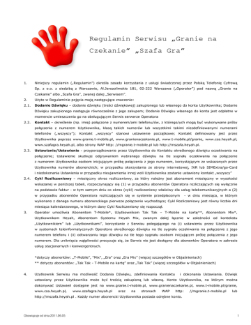Regulamin Serwisu „Granie na Czekanie” „Szafa Gra” 1. Niniejszy regulamin („Regulamin”) określa zasady korzystania z usługi świadczonej przez Polską Telefonię Cyfrową Sp. z o.o. z siedzibą z Warszawie, Al.Jerozolimskie 181, 02-222 Warszawa („Operator”) pod nazwą „Granie na Czekanie” albo „Szafa Gra”, zwanej dalej „Serwisem”. 2. 2.1. Użyte w Regulaminie pojęcia mają następujące znaczenie: Dodanie Dźwięku – dodanie dźwięku (treści dźwiękowej) zakupionego lub własnego do konta Użytkownika; Dodanie Dźwięku zakupionego następuje równocześnie z jego zakupem; Dodanie Dźwięku własnego do konta jest odpłatne w momencie umieszczenia go na obsługującym Serwis serwerze Operatora 2.2. Kontakt – określenie (np. imię) połączone z numerem/ami telefonu/ów, z którego/ych mogą być wykonywane próby połączenia z numerem Użytkownika, klasą takich numerów lub wszystkimi takimi niezdefiniowanymi numerami telefonów („wszyscy”); Kontakt „wszyscy” stanowi ustawienie początkowe; Kontakt definiowany jest przez Użytkownika poprzez www.granie.t-mobile.pl, www.granienaczekanie.pl, www.t-mobile.pl/granie, www.csa.heyah.pl, www.szafagra.heyah.pl, albo strony WAP http: //mgranie.t-mobile.pl lub http://mszafa.heyah.pl. 2.3. Ustawianie/Ustawienie - przyporządkowanie przez Użytkownika do Kontaktu określonego dźwięku oczekiwania na połączenie; Ustawienie skutkuje odgrywaniem wybranego dźwięku na tle sygnału oczekiwania na połączenie z numerem Użytkownika osobom inicjującym próbę połączenia z jego numerem, korzystającym ze wskazanych przez Użytkownika numerów abonenckich; w przypadku skorzystania ze strony internetowej, IVR lub SIMExtra/go-Card i niedokonania Ustawienia w przypadku nieujawnienia innej woli Użytkownika zostanie ustawiony kontakt „wszyscy” 2.4. Cykl Rozliczeniowy – miesięczny okres rozliczeniowy, za który należny jest abonament miesięczny w wysokości wskazanej w poniższej tabeli, rozpoczynający się (1) w przypadku abonentów Operatora rozliczających się wyłącznie na podstawie faktur - w tym samym dniu co okres (cykl) rozliczeniowy właściwy dla usług telekomunikacyjnych a (2) w przypadku abonentów Operatora rozliczających się w systemie przedpłaconym - w dniu miesiąca, w którym wykonano z danego numeru abonenckiego pierwsze połączenie wychodzące; Cykl Rozliczeniowy jest równy liczbie dni miesiąca kalendarzowego, w którym dany Cykl Rozliczeniowy się rozpoczął. 3. Operator umożliwia Abonentom T-Mobile*, Użytkownikom Tak Tak – T-Mobile na kartę**, Abonentom Mix*, Użytkownikom Heyah, Abonentom Systemu Heyah Mix, zwanym dalej łącznie w zależności od kontekstu „Użytkownikiem” lub „Użytkownikami”, korzystanie z Serwisu polegającego na (i) ustawieniu przez Użytkownika w systemach teleinformatycznych Operatora określonego dźwięku na tle sygnału oczekiwania na połączenie z jego numerem telefonu i (ii) odtwarzaniu tego dźwięku na tle tego sygnału osobom inicjującym próbę połączenia z jego numerem. Dla uniknięcia wątpliwości precyzuje się, że Serwis nie jest dostępny dla abonentów Operatora w zakresie usług stacjonarnych i konwergentnych. *dotyczy abonentów: „T-Mobile”, "Mix", „Era” oraz „Era Mix” (więcej szczegółów w Objaśnieniach) ** dotyczy abonentów: „Tak Tak - T-Mobile na kartę” oraz „Tak Tak” (więcej szczegółów w Objaśnieniach) 4. Użytkownik Serwisu ma możliwość Dodania Dźwięku, zdefiniowania Kontaktu i dokonania Ustawiania. Dźwięk ustawiany przez Użytkownika może być treścią zakupioną lub własną. Konto Użytkownika, na którym można dokonywać Ustawień dostępne jest na www.granie.t-mobile.pl, www.granienaczekanie.pl, www.t-mobile.pl/granie, www.csa.heyah.pl, www.szafagra.heyah.pl oraz na stronach WAP http: //mgranie.t-mobile.pl lub http://mszafa.heyah.pl . Każdy numer abonencki Użytkownika posiada odrębne konto. Obowiązuje od dnia 2011.06.05 1 Regulamin Serwisu „Granie na Czekanie”/„Szafa Gra” 5. Aktywacja Serwisu może być dokonana przy pierwszym Dodaniu Dźwięku za pośrednictwem SMS, SIMextra/go-Card, www.granie.t-mobile.pl, www.granienaczekanie.pl, www.szafagra.heyah.pl oraz www.t-mobile.pl/granie, www.csa.heyah.pl, na stronach WAP http: //mgranie.t-mobile.pl lub http://mszafa.heyah.pl, IVR albo w sposób automatyczny przez Operatora, jeśli tak wynika z postanowień wzorca umowy, w szczególności Warunków Oferty Promocyjnej. Aktywacja Serwisu następująca przy pierwszym Dodaniu Dźwięku jest realizowana w czasie do 24 godzin. 6. Zakup dźwięków może być dokonany za pośrednictwem SMS, www.granie.t-mobile.pl, www.granienaczekanie.pl, www.t-mobile.pl/granie, www.csa.heyah.pl, www.szafagra.heyah.pl oraz stron WAP http: //mgranie.t-mobile.pl lub http://mszafa.heyah.pl lub IVR. 7. Wprowadzanie własnych www.granie.t-mobile.pl, dźwięków oczekiwania na www.granienaczekanie.pl, połączenia może być www.t-mobile.pl/granie, dokonane za pośrednictwem www.csa.heyah.pl albo www.szafagra.heyah.pl. 8. Za korzystanie z Serwisu Operator pobiera opłatę zgodnie z poniższą tabelą. Granie na Czekanie/Szafa Gra Cena netto Cena z VAT* 1,63 zł. 2,00 zł. 0 - 8,13 zł. 0,00 – 10,00 zł. 2,03 zł. 2,50 zł. zarządzanie kontaktami bez opłaty bez opłaty ustawianie dźwięku bez opłaty bez opłaty bez opłaty bez opłaty bez opłaty bez opłaty abonament miesięczny / opłata cykliczna zakup dźwięku (aktualna cena dźwięku podawana jest w ramach informacji o pobieranym dźwięku) wgranie dźwięku własnego próbne odsłuchanie utworu na stronie internetowej Serwisu (www.t-mobile.pl/granie, www.granie.t-mobile.pl, www.granienaczekanie.pl, www.csa.heyah.pl, www.szafagra.heyah.pl) aktywacja, dezaktywacja, zawieszenie, odwieszenie Serwisu *Do cen netto doliczany jest podatek VAT w wysokości 23% 9. Użytkownik, który aktywował Serwis po raz pierwszy poprzez Do