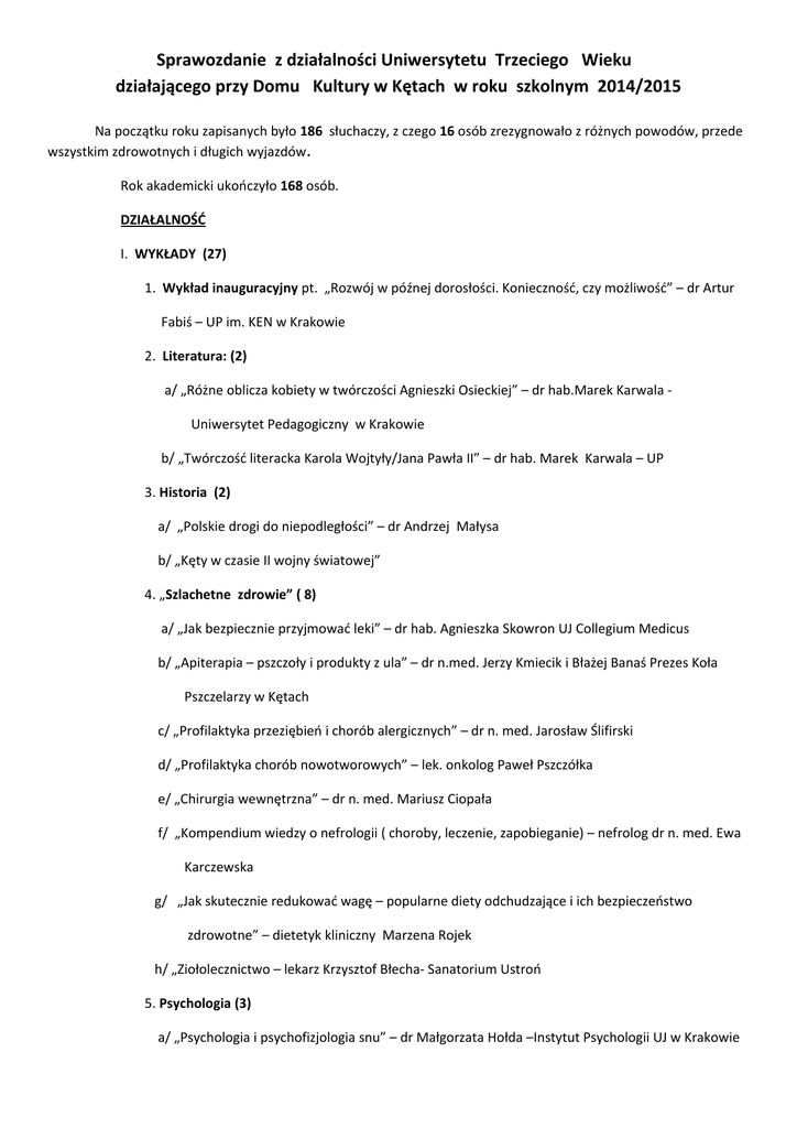 Sprawozdanie z działalności Uniwersytetu Trzeciego Wieku działającego przy Domu Kultury w Kętach w roku szkolnym 2014/2015 Na początku roku zapisanych było 186 słuchaczy, z czego 16 osób zrezygnowało z różnych powodów, przede wszystkim zdrowotnych i długich wyjazdów. Rok akademicki ukończyło 168 osób. DZIAŁALNOŚĆ I. WYKŁADY (27) 1. Wykład inauguracyjny pt. „Rozwój w późnej dorosłości. Konieczność, czy możliwość” – dr Artur Fabiś – UP im. KEN w Krakowie 2. Literatura: (2) a/ „Różne oblicza kobiety w twórczości Agnieszki Osieckiej” – dr hab.Marek Karwala Uniwersytet Pedagogiczny w Krakowie b/ „Twórczość literacka Karola Wojtyły/Jana Pawła II” – dr hab. Marek Karwala – UP 3. Historia (2) a/ „Polskie drogi do niepodległości” – dr Andrzej Małysa b/ „Kęty w czasie II wojny światowej” 4. „Szlachetne zdrowie” ( 8) a/ „Jak bezpiecznie przyjmować leki” – dr hab. Agnieszka Skowron UJ Collegium Medicus b/ „Apiterapia – pszczoły i produkty z ula” – dr n.med. Jerzy Kmiecik i Błażej Banaś Prezes Koła Pszczelarzy w Kętach c/ „Profilaktyka przeziębień i chorób alergicznych” – dr n. med. Jarosław Ślifirski d/ „Profilaktyka chorób nowotworowych” – lek. onkolog Paweł Pszczółka e/ „Chirurgia wewnętrzna” – dr n. med. Mariusz Ciopała f/ „Kompendium wiedzy o nefrologii ( choroby, leczenie, zapobieganie) – nefrolog dr n. med. Ewa Karczewska g/ „Jak skutecznie redukować wagę – popularne diety odchudzające i ich bezpieczeństwo zdrowotne” – dietetyk kliniczny Marzena Rojek h/ „Ziołolecznictwo – lekarz Krzysztof Błecha- Sanatorium Ustroń 5. Psychologia (3) a/ „Psychologia i psychofizjologia snu” – dr Małgorzata Hołda –Instytut Psychologii UJ w Krakowie b/ „Jak umysł rośnie w siłę, gdy mózg się starzeje” – dr Wanda Matras –Mastalerz – adiunkt w Instytucie Informacji i Bibliotekoznawstwa UP w Krakowie c/ „Potęga umysłu. Metody aktywizacji poprzez działanie” – dr Wanda Matras-Mastalerz – UP Kraków 6. Filozofia ( 2) a/ „Burzliwe dzieje państwa Izrael” – mgr Wiesław Pyka b/ „Nie wszystko jest takie oczywiste – czyli o podstawach myślenia filozoficznego” –mgr Wiesław Pyka 7. Kulturoznawstwo (4) a/ „Majowie-kultura i cywilizacja” – mgr Marek łasisz kulturoznawca, archeolog, podróżnik b/ „Kultura i cywilizacja Inków” – mgr Marek Łasisz c/ „Aztekowie” – mgr Marek Łasisz d/„Kultura Nasca – łowcy głów i zagadkowe linie pustyni” 8. Ochrona środowiska (2) a/ „Czym oddychamy w Małopolsce” – dr inż. Monika Wierzbińska – adiunkt w ATH Bielsko-Biała b/ „Wiatr i woda –niestrudzeni budowniczowie” – dr nauk o ziemi – Patrycja Wójcik-Tabol, UJ 9. Prawo (1) „Prawo spadkowe – co każdy wiedzieć powinien o spadkach” – sędzia Sądu Rejonowego w Bielsku-Białej 10. Wiedza praktyczna (2) a/ „Sposób na oszczędności – innowacje w banku” – mgr Monika Makuch – WBK b/ „Wizerunek w każdym wieku” – specjalistka od wizerunku Honorata Ulanecka - Gliwice 11. Filmowe Popołudnie , DKF dla seniora – „Świat komedii” ( 9) Prelegent Marcin Skorek a/ „Różne oblicza dawnej komedii filmowej” – spotkanie ze Stanisławem Janickim –krytyk filmowy b/ „Dlaczego lubimy komedie?” Film: „Stulatek, który wyskoczył przez okno i zniknął” prod. szwedzkiej c/ „Komedia francuska w walce z uprzedzeniami” – film „Nietykalni” prod. franc. d/ „Charles Chaplin –król komedii” – film „Gorączka złota” – prod. USA e/ „Czeski film. Co nas łączy, co nas dzieli. Polskie a czeskie poczucie humoru”. Film „Guzikowcy” f/ „Śmiech przez łzy…terapeutyczna moc uśmiechu”. Film „Z miłości do…” prod. niem/ang. g/ „Początki kina, początki komedii”. Film „Generał” prod. USA h/ „Absurdalny humor w słusznej sprawie” – film „Ojciec Szpiler” prod. Chorw/Serbia/Czarnog. i/ „Życie zaczyna się po 60-tce, czyli o nietypowych pasjach seniorów” – film „Optymistki” II. Koncerty a/ Adrianna Biedrzyńska b/ „Tyle słońca” – przeboje Anny Jantar – recital Anny Żebrowskiej c/ „Marsz, marsz Polonia” z udziałem Leszka Mazana i artystów scen krakowskich d/ koncert zespołu „Oversoul” e/ koncert przedsylwestrowy, operetka „Kraina uśmiechu” f/ koncert jazzowy: Charli Green, Krzysztof Puma Piasecki i 4Set g/Wiosenny koncert muzyki klasycznej – Kwintet Minus III. Spektakle (1) „Kandydatki na żony” – AGT „Antrakt” - zakończenie roku akademickiego IV. Debaty (2) a/ „Bezpieczny Senior” – org. Komisariat Policji w Kętach b/ „Reaguj na przemoc” – org. Komisariat Policji i Dom Kultury V. Warsztaty: A. Artystyczne ( 3) a/ „Jak udekorować nagrobek” - florystka Urszula Kucharska b/ „Kolorowe Boże Narodzenie” – Alicja Skrudlik-Pilch c/ „Przed Wielkanocą” – Alicja Skrudlik-Pilch B. Muzealno – historyczne ( Muzeum im. Al. Kłosińskiego w Kętach) ( 5 ) a/ „Na dworze Zygmunta Starego” – wystawa strojów średniowiecznych i renesansowych. Dr Marta TylzaJanosz b/ „Tradycje świąteczne” – mgr Alicja Skrudlik -Pilch c/ Zwiedzanie wystawy „Bohaterskie miasto” z okazji 100-lecia pobytu J. Piłsudskiego i Legionów w Kętach d/ „Wielkanoc” – Alicja Skrudlik-Pilch e/ „W pracowni witraży” –mgr Renata Bożek” 12. WYCIECZKI - 364 osoby a/ Wycieczka do Krakowa (56 os.) – Muzeum Historyczne Miasta Krakowa – podziemia Rynku, w drodze powrotnej – spacer po Lanckoronie b/ Wyjazd na VII Ogólnopolską Olimpiadę Sportową „Trzeci Wiek na Start” w Łazach ( 42 osoby) – 16.05.2015r. W olimpiadzie wystartowało 50 Uniwersytetów z całej Polski. W zawodach wzięło udział 15 słuchaczy z UTW w Kętach w 14 konkurencjach. Zdobyliśmy dwa złote medale i jeden brązowy. Generalnie UTW Kęty zajął 17 miejsce. c/ Wycieczka do G