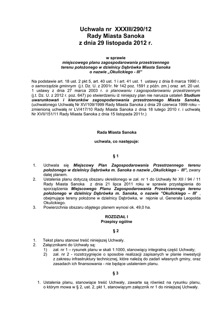 Uchwała nr XXXIII/290/12 Rady Miasta Sanoka z dnia 29 listopada 2012 r. w sprawie miejscowego planu zagospodarowania przestrzennego terenu położonego w dzielnicy Dąbrówka Miasta Sanoka o nazwie „Okulickiego - III” Na podstawie art. 18 ust. 2 pkt 5, art. 40 ust. 1 i art. 41 ust. 1 ustawy z dnia 8 marca 1990 r. o samorządzie gminnym (j.t. Dz. U. z 2001r. Nr 142 poz. 1591 z późn. zm.) oraz art. 20 ust. 1 ustawy z dnia 27 marca 2003 r. o planowaniu i zagospodarowaniu przestrzennym (j.t. Dz. U. z 2012 r. poz. 647) po stwierdzeniu iż niniejszy plan nie narusza ustaleń Studium uwarunkowań i kierunków zagospodarowania przestrzennego Miasta Sanoka, (uchwalonego Uchwałą Nr XV/109/1999 Rady Miasta Sanoka z dnia 29 czerwca 1999 roku – zmienioną uchwałą nr LV/417/10 Rady Miasta Sanoka z dnia 18 lutego 2010 r. i uchwałą Nr XVII/151/11 Rady Miasta Sanoka z dnia 15 listopada 2011r.) Rada Miasta Sanoka uchwala, co następuje: §1 1. 2. 3. Uchwala się Miejscowy Plan Zagospodarowania Przestrzennego terenu położonego w dzielnicy Dąbrówka m. Sanoka o nazwie „Okulickiego - III”, zwany dalej planem. Ustalenia planu dotyczą obszaru określonego w zał. nr 1 do Uchwały Nr XII / 94 / 11 Rady Miasta Sanoka z dnia 21 lipca 2011 roku w sprawie przystąpienia do sporządzenia Miejscowego Planu Zagospodarowania Przestrzennego terenu położonego w dzielnicy Dąbrówka m. Sanoka, o nazwie ”Okulickiego – III” , obejmujące tereny położone w dzielnicy Dąbrówka, w rejonie ul. Generała Leopolda Okulickiego. Powierzchnia obszaru objętego planem wynosi ok. 49,0 ha. ROZDZIAŁ I Przepisy ogólne §2 1. 2. Tekst planu stanowi treść niniejszej Uchwały. Załącznikami do Uchwały są: 1) zał. nr 1 – rysunek planu w skali 1:1000, stanowiący integralną część Uchwały; 2) zał. nr 2 - rozstrzygnięcie o sposobie realizacji zapisanych w planie inwestycji z zakresu infrastruktury technicznej, które należą do zadań własnych gminy, oraz zasadach ich finansowania - nie będące ustaleniem planu. §3 1. Ustalenia planu, stanowiące treść Uchwały, zawarte są również na rysunku planu, o którym mowa w § 2, ust. 2, pkt 1, stanowiącym załącznik nr 1 do niniejszej Uchwały. 2. Ustalenia planu zawarte w Uchwale oraz w części graficznej obowiązują łącznie. §4 1. 2. Obowiązujące elementy ustaleń planu, wyznaczone na rysunku planu stanowiącym załącznik Nr 1 do niniejszej Uchwały: 1) granice obszaru objętego planem; 2) linie rozgraniczające tereny - wyznaczające tereny o różnym przeznaczeniu lub różnych zasadach zagospodarowania; 3) nieprzekraczalne linie zabudowy - wyznaczone na rysunku planu i obowiązujące w odniesieniu do budynków planowanych oraz przebudowywanych; 4) tereny o różnym przeznaczeniu podstawowym i dopuszczalnym, wydzielone liniami rozgraniczającymi i oznaczone następującymi symbolami identyfikacyjnymi: a) tereny obiektów produkcyjnych, składów i magazynów, 1.P – 6.P b) tereny zabudowy usługowej, U c) tereny dróg publicznych – droga główna ruchu KDGP przyspieszonego, d) tereny dróg publicznych – drogi lokalne, 1.KDL – 2.KDL e) tereny dróg publicznych – drogi dojazdowe, 1.KDD – 4.KDD f) tereny dróg wewnętrznych, KDW g) tereny zieleni nieurządzonej. 1.Z – 2.Z Informacyjne elementy planu wynikające z przepisów odrębnych oraz dokumentów polityki przestrzennej przyjętych dla obszaru Miasta, oznaczone na rysunku planu: 1) stanowiska archeologiczne; 2) linie elektroenergetyczne wysokiego napięcia wraz ze strefami technicznymi; 3) orientacyjne linie rozgraniczające dróg publicznych, ilustrujące fragmenty układu komunikacyjnego poza obszarem objętym planem – nie będące ustaleniami niniejszego planu; 4) nazwy ulic. §5 1. Ilekroć w uchwale jest mowa o: 1) Uchwale – należy przez to rozumieć niniejszą Uchwałę, o ile z treści przepisu nie wynika inaczej; 2) planie - należy przez to rozumieć tekst planu oraz rysunek planu; 3) rysunku planu - należy przez to rozumieć graficzną część planu wykonaną w skali 1 : 1000 na kopii mapy zasadniczej, stanowiącą załącznik Nr 1 do niniejszej Uchwały; 4) linii rozgraniczającej tereny – należy przez to rozumieć linię, która rozgranicza tereny o różnym przeznaczeniu podstawowym i dopuszczalnym lub różnych zasadach zagospodarowania; 5) nieprzekraczalnej linii zabudowy – należy przez to rozumieć linię wrysowaną na rysunku planu, poza którą nie mogą wykraczać rzuty poziome budynków, za wyjątkiem balkonu lub daszku nad wejściem, a także takich części budynku jak galeria, taras, schody zewnętrzne, pochylnia lub rampa - nie więcej jednak niż 1,5 m; 6) przeznaczeniu podstawowym - należy przez to rozumieć rodzaj przeznaczenia, ustalonego w tekście planu na danym terenie, wyznaczonym liniami rozgraniczającymi na rysunku planu; 7) przeznaczeniu dopuszczalnym - należy przez to rozumieć inny rodzaj przeznaczenia niż przeznaczenie podstawowe, dopuszczone na danym terenie jako uzupełnienie przeznaczenia podstawowego; 2 8) 2. terenie - należy przez to rozumieć teren wyznaczony i ograniczony na rysunku planu liniami rozgraniczającymi, oznaczony numerem porządkującym i przypisanym symbolem, na którym obowiązują te same ustalenia, jeśli z treści Uchwały nie wynika inaczej; 9) terenie inwestycji - należy przez to rozumieć teren objęty wnioskiem o pozwolenie na budowę i granicami projektu zagospodarowania w rozumieniu przepisów odrębnych; 10) działce budowlanej – należy przez to rozumieć nieruchomość gruntową lub działkę gruntu, której wielkość, cechy geometryczne, dostęp do drogi publicznej oraz wyposażenie w urządzenia infrastruktury technicznej spełniają wymogi realizacji obiektów budowlanych wynikające z odrębnych przepisów – według definicji zawartej w ustawie o planowaniu i zagospodarowaniu przestrzennym; 11) powierzchni zabudowy - należy przez to rozumieć sumę powierzchni zabudo