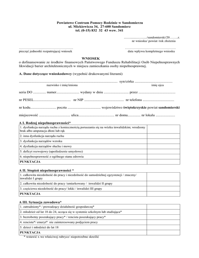 Powiatowe Centrum Pomocy Rodzinie w Sandomierzu ul. Mickiewicza 34, 27-600 Sandomierz tel. (0-15) 832 32 43 wew. 341 .........................../sandomierski/20……..r. nr wniosku/ powiat /rok złożenia …………………………………………. pieczęć jednostki rozpatrującej wniosek ………………………………………. data wpływu kompletnego wniosku WNIOSEK o dofinansowanie ze środków finansowych Państwowego Funduszu Rehabilitacji Osób Niepełnosprawnych likwidacji barier architektonicznych w miejscu zamieszkania osoby niepełnosprawnej. A. Dane dotyczące wnioskodawcy (wypełnić drukowanymi literami) ........................................................................................................... syn/córka ......................................... nazwisko i imię/imiona imię ojca seria DO .............. numer......................... wydany w dniu ........................... przez ........................................ nr PESEL........................................ nr NIP ........................................... nr telefonu .................................. nr kodu............................ poczta .................................... województwo świętokrzyskie powiat sandomierski miejscowość .................................. ulica....................................... nr domu.............. nr lokalu ..................... A I. Rodzaj niepełnosprawności* 1. dysfunkcja narządu ruchu z koniecznością poruszania się na wózku inwalidzkim; wrodzony brak albo amputacja dłoni lub rąk 2. inna dysfunkcja narządu ruchu 3. dysfunkcja narządów wzroku 4. dysfunkcja narządów słuchu i mowy 5. deficyt rozwojowy (upośledzenie umysłowe) 6. niepełnosprawność z ogólnego stanu zdrowia PUNKTACJA A II. Stopień niepełnosprawności * 1. całkowita niezdolność do pracy i niezdolność do samodzielnej egzystencji / znaczny/ inwalidzi I grupy 2. całkowita niezdolność do pracy /umiarkowany / inwalidzi II grupy 3. częściowa niezdolność do pracy/ lekki / inwalidzi III grupy PUNKTACJA A III. Sytuacja zawodowa* 1. zatrudniony* / prowadzący działalność gospodarczą* 2. młodzież od lat 18 do 24, ucząca się w systemie szkolnym lub studiująca* 3. bezrobotny poszukujący pracy* / rencista poszukujący pracy* 4. rencista*/ emeryt* nie zainteresowany podjęciem pracy 5. dzieci i młodzież do lat 18 PUNKTACJA * wstawić x we właściwej rubryce/ niepotrzebne skreślić A IV. Sytuacja mieszkaniowa – warunki mieszkaniowe (wypełnia pracownik PCPR) 1) złe 2) przeciętne 3) dobre 4) bardzo dobre PUNKTACJA A V. Sytuacja mieszkaniowa – opis budynku lub mieszkania 1)dom jednorodzinny*, wielorodzinny prywatny*, wielorodzinny komunalny*, wielorodzinny spółdzielczy*, inne*............................................................................................................................................. 2) budynek parterowy*, piętrowy*, mieszkanie na ........................................................... podać kondygnacje) 3) przybliżony wiek budynku lub rok budowy................................................................................................... 4) opis mieszkania: pokoje......................(podać liczbę), z kuchnią*, bez kuchni*, z łazienką*, bez łazienki*, z wc*, bez wc*, 5) łazienka wyposażona jest w : wannę*, brodzik*, kabinę prysznicową*, umywalkę*, 6) w mieszkaniu jest: instalacja wody zimnej*, ciepłej*, kanalizacja*, centralne ogrzewanie*, prąd*, gaz*, 7) inne informacje o warunkach mieszkaniowych .......................................................................................... .............................................................................................................................................................................. .............................................................................................................................................................................. ......................................................................................................................................................... A VI. Sytuacja mieszkaniowa - zamieszkiwanie* 1) samotnie 2) z rodziną 3) z osobami nie spokrewnionymi PUNKTACJA A VII. Osoby pozostające we wspólnym gospodarstwie domowym z wnioskodawcą: Stopień pokrewieństwa z Wnioskodawcą Dane dotyczące Wnioskodawcy: 1 Lp. Imię i Nazwisko Wiek Czy pobiera naukę (tak/nie) Stopień i rodzaj niepełnosprawności Pozostali członkowie wspólnego gospodarstwa domowego: 2 3 4 5 6 7 RAZEM Liczba punktów ………….. (wypełnia PCPR) Przeciętny* miesięczny dochód (netto) A VIII. Średni dochód miesięczny na osobę w gospodarstwie domowym wnioskodawcy* 1) do 100,00 zł. 2) 101,00 – 200,00 zł. 3) 201,00 – 300,00 zł. 4) 301,00 – 400,00 zł. 5) 401,00 – 500,00 zł. 6) 501,00 – 600,00 zł. 7) 601,00 – 700,00 zł. 8) 701,00 – 800,00 zł. 9) powyżej 800,00 zł. PUNKTACJA przeciętny miesięczny dochód rodziny w rozumieniu przepisów o świadczeniach rodzinnych, podzielony przez liczbę osób we wspólnym gospodarstwie domowym, obliczony za kwartał poprzedzający miesiąc złożenia wniosku. wstawić x we właściwej rubryce/ niepotrzebne skreślić. A IX. Informacja o korzystaniu ze środków PFRON* 1. korzystał...................... (proszę wypełnić tabelę) Nr i data zawarcia Kwota przyznana Cel(nazwa programu i/lub umowy 2. Nie korzystał……………* Termin rozliczenia Stan rozliczenia zadania ustawowego w ramach którego została przyznana pomoc) Razem Źródło PFRON/ PCPR Razem kwota rozliczona A X. Cel likwidacji barier architektonicznych i miejsce realizacji zadania: ............................................................................................................................................................................................... .......................................................................