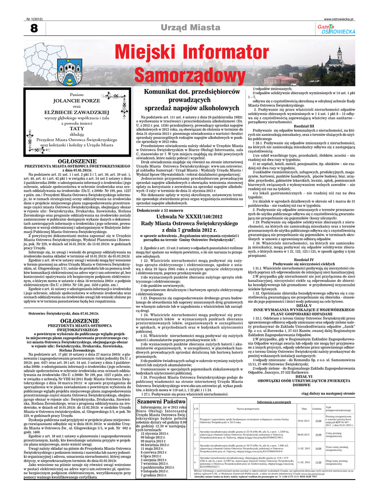 Nr 1(3012) www.ostrowiecka.pl 8 Urząd Miasta Miejski Informator Samorządowy Paniom JOLANCIE PORZE oraz ELŻBIECIE ZAWADZKIEJ wyrazy głębokiego współczucia i żalu z powodu śmierci TATY składają Prezydent Miasta Ostrowca Świętokrzyskiego oraz koleżanki i koledzy z Urzędu Miasta OGŁOSZENIE PREZYDENTA MIASTA OSTROWCA ŚWIETOKRZYSKIEGO z dnia 07.01.2013r. Na podstawie art. 21 ust. 1 i ust. 2 pkt 2 i 7, art. 30, art. 39 ust. 1, art. 40, art. 41 i art. 42 pkt 1 w związku z art. 54 ust 2 ustawy z dnia 3 października 2008r. o udostępnianiu informacji o środowisku i jego ochronie, udziale społeczeństwa w ochronie środowiska oraz ocenach oddziaływania na środowisko (Dz.U. z 2008r. Nr 199, poz. 1227 z późn. zm.) Prezydent Miasta Ostrowca Świętokrzyskiego informuje, że w ramach strategicznej oceny oddziaływania na środowisko dane o projekcie miejscowego planu zagospodarowania przestrzennego części miasta Ostrowca Świętokrzyskiego, obejmujący obszar w rejonie ulic: Świętokrzyska, Drukarska, Szewieńska, Stefana Żeromskiego oraz prognozie oddziaływania na środowisko zostały zamieszczone w publicznie dostępnym wykazie danych o dokumentach zawierających informacje o środowisku i jego ochronie, prowadzonym w wersji elektronicznej i udostępnionym w Biuletynie Informacji Publicznej Miasta Ostrowca Świętokrzyskiego. Z powyższymi dokumentami można zapoznać się w Urzędzie Miasta Ostrowca Świętokrzyskiego, Wydział Planowania i Rozwoju, pok. Nr 229, w dniach od 16.01.2013r. do 13.02.2013r. w godzinach pracy Urzędu. Informuje się, że uwagi i wnioski do prognozy oddziaływania na środowisko można składać w terminie od 16.01.2013r. do 05.03.2013r. Zgodnie z art. 40 w/w ustawy uwagi i wnioski mogą być wnoszone w formie pisemnej na adres Urzędu Miasta w Ostrowcu Świętokrzyskim, ul. Głogowskiego 3/5), ustnie do protokołu lub za pomocą środków komunikacji elektronicznej na adres [email protected], bez konieczności opatrywania ich bezpiecznym podpisem elektronicznym, o którym mowa w ustawie z dnia 18 września 2001r. o podpisie elektronicznym (Dz.U. z 2001r. Nr 130, poz. 1450 z późn. zm.). Zgodnie z art. 41 ustawy o udostępnianiu informacji o środowisku i jego ochronie, udziale społeczeństwa w ochronie środowiska oraz ocenach oddziaływania na środowisko uwagi lub wnioski złożone po upływie w/w terminu pozostawione będą bez rozpatrzenia. Ostrowiec Świętokrzyski, dnia 07.01.2013r. OGŁOSZENIE PREZYDENTA MIASTA OSTROWCA ŚWIĘTOKRZYSKIEGO o powtórnym wyłożeniu do publicznego wglądu projektu miejscowego planu zagospodarowania przestrzennego części miasta Ostrowca Świętokrzyskiego, obejmującego obszar w rejonie ulic: Świętokrzyska, Drukarska, Szewieńska, Stefana Żeromskiego. Na podstawie art. 17 pkt 10 ustawy z dnia 27 marca 2003r. o planowaniu i zagospodarowaniu przestrzennym (tekst jednolity Dz.U. z 2012r. poz. 647) oraz art. 30 i art. 54 ust. 3 ustawy z dnia 3 października 2008r. o udostępnianiu informacji o środowisku i jego ochronie, udziale społeczeństwa w ochronie środowiska oraz ocenach oddziaływania na środowisko (Dz.U. z 2008r. Nr 199, poz. 1227 z późn. zm.) w związku z uchwałą Nr VIII/44/2011 Rady Miasta Ostrowca Świętokrzyskiego z dnia 30 marca 2011r. w sprawie przystąpienia do sporządzenia w/w planu zawiadamiam o powtórnym wyłożeniu do publicznego wglądu projektu miejscowego planu zagospodarowania przestrzennego części miasta Ostrowca Świętokrzyskiego, obejmującego obszar w rejonie ulic: Świętokrzyska, Drukarska, Szewieńska, Stefana Żeromskiego, wraz z prognozą oddziaływania na środowisko, w dniach od 16.01.2013r. do 13.02.2013r. w siedzibie Urzędu Miasta w Ostrowcu świętokrzyskim, ul. Głogowskiego 3/5, w pok. Nr 229, w godzinach pracy Urzędu. Dyskusja publiczna nad przyjętymi w projekcie planu miejscowego rozwiązaniami odbędzie się w dniu 28.01.2013r. w siedzibie Urzędu Miasta w Ostrowcu Św., ul. Głogowskiego 3/5, w pok. Nr 002 o godz. 1400. Zgodnie z art. 18 ust.1 ustawy o planowaniu i zagospodarowaniu przestrzennym, każdy, kto kwestionuje ustalenia przyjęte w projekcie planu miejscowego, może wnieść uwagi. Uwagi należy składać na piśmie do Prezydenta Miasta Ostrowca Świętokrzyskiego z podaniem imienia i nazwiska lub nazwy jednostki organizacyjnej i adresu, oznaczenia nieruchomości, której uwaga dotyczy, w nieprzekraczalnym terminie do dnia 05.03.2013r. Jako wniesione na piśmie uznaje się również uwagi wniesione w postaci elektronicznej na adres [email protected], opatrzone bezpiecznym podpisem elektronicznym, weryfikowanym przy pomocy ważnego kwalifikowanego certyfikatu. Komunikat dot. przedsiębiorców prowadzących sprzedaż napojów alkoholowych Na podstawie art. 111 ust. 4 ustawy z dnia 26 października 1982r. o wychowaniu w trzeźwości i przeciwdziałaniu alkoholizmowi (Dz. U. z 2012 r. poz. 1356) przedsiębiorcy, prowadzący sprzedaż napojów alkoholowych w 2012 roku, są obowiązani do złożenia w terminie do dnia 31 stycznia 2013 r. pisemnego oświadczenia o wartości (brutto) sprzedaży poszczególnych rodzajów napojów alkoholowych w punkcie sprzedaży w 2012 roku. Przedmiotowe oświadczenia należy składać w Urzędzie Miasta w Ostrowcu Świętokrzyskim w Biurze Obsługi Interesanta, sala C, stanowisko nr 7. W tym miejscu znajdują się druki powyższych oświadczeń, które należy pobrać i wypełnić. Druk oświadczenia znajduje się również na stronie internetowej Urzędu Miasta Ostrowca Świętokrzyskiego: www.um.ostrowiec. pl zakładka Samorząd / Urząd Miasta / Wydziały Urzędu Miasta / Wydział Spraw Obywatelskich / referat działalności gospodarczej/. Jednocześnie przypominamy przedsiębiorcom prowadzącym sprzedaż napojów alkoholowych o obowiązku wniesienia stosownej opłaty za korzystanie z zezwolenia na sprzedaż napojów alkoholowych (I raty) w terminie do dnia 31 stycznia 2013 r. Nie dokonanie opłaty w wy