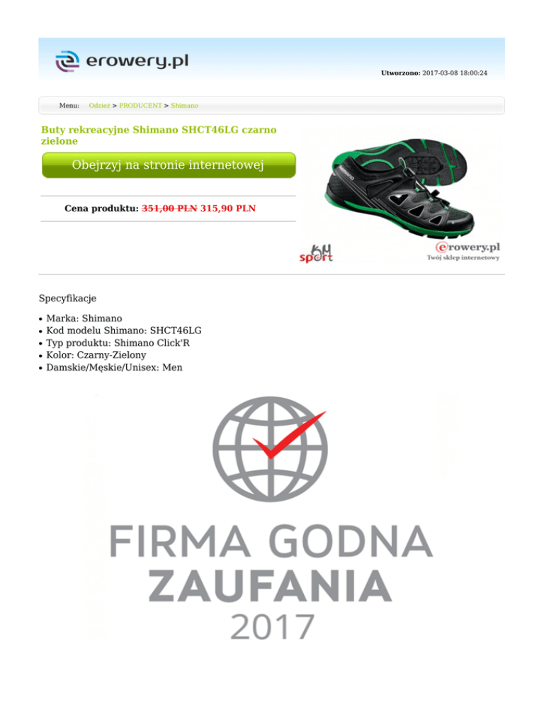 Utworzono: 2017-03-08 18:00:24 Menu: Odzież > PRODUCENT > Shimano Buty rekreacyjne Shimano SHCT46LG czarno zielone Obejrzyj na stronie internetowej Cena produktu: 351,00 PLN 315,90 PLN Specyfikacje ● ● ● ● ● Marka: Shimano Kod modelu Shimano: SHCT46LG Typ produktu: Shimano Click'R Kolor: Czarny-Zielony Damskie/Męskie/Unisex: Men Przeznaczenie Marka Podeszwa Rekreacyjne Shimano Tworzywo sztuczne, Guma Mimo dołożenia wszelkich starań nie gwarantujemy, że publikowane opisy i specyfikacje techniczne niezawierają uchybień lub błędów, które nie mogą jednak być podstawą do roszczeń. W przypadku jakichkolwiek wątpliwości, przed podjęciem decyzji prosimy o kontakt. Adres: www.erowery.pl Telefon: 605 515 185, 34 361 16 71 Email: [email protected]