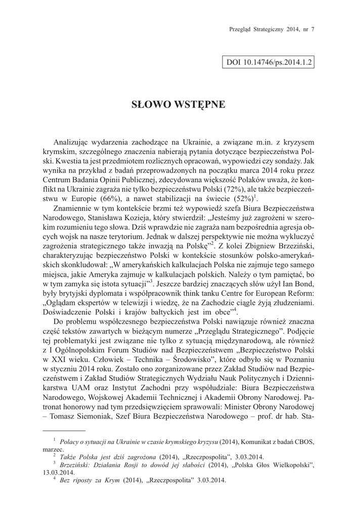 Przegl¹d Strategiczny 2014, nr 7 DOI 10.14746/ps.2014.1.2 S£OWO WSTÊPNE Analizuj¹c wydarzenia zachodz¹ce na Ukrainie, a zwi¹zane m.in. z kryzysem krymskim, szczególnego znaczenia nabieraj¹ pytania dotycz¹ce bezpieczeñstwa Polski. Kwestia ta jest przedmiotem rozlicznych opracowañ, wypowiedzi czy sonda¿y. Jak wynika na przyk³ad z badañ przeprowadzonych na pocz¹tku marca 2014 roku przez Centrum Badania Opinii Publicznej, zdecydowana wiêkszoœæ Polaków uwa¿a, ¿e konflikt na Ukrainie zagra¿a nie tylko bezpieczeñstwu Polski (72%), ale tak¿e bezpieczeñstwu w Europie (66%), a nawet stabilizacji na œwiecie (52%)1. Znamiennie w tym kontekœcie brzmi te¿ wypowiedŸ szefa Biura Bezpieczeñstwa Narodowego, Stanis³awa Kozieja, który stwierdzi³: „Jesteœmy ju¿ zagro¿eni w szerokim rozumieniu tego s³owa. Dziœ wprawdzie nie zagra¿a nam bezpoœrednia agresja obcych wojsk na nasze terytorium. Jednak w dalszej perspektywie nie mo¿na wykluczyæ zagro¿enia strategicznego tak¿e inwazj¹ na Polskê”2. Z kolei Zbigniew Brzeziñski, charakteryzuj¹c bezpieczeñstwo Polski w kontekœcie stosunków polsko-amerykañskich skonkludowa³: „W amerykañskich kalkulacjach Polska nie zajmuje tego samego miejsca, jakie Ameryka zajmuje w kalkulacjach polskich. Nale¿y o tym pamiêtaæ, bo w tym zamyka siê istota sytuacji”3. Jeszcze bardziej znacz¹cych s³ów u¿y³ Ian Bond, by³y brytyjski dyplomata i wspó³pracownik think tanku Centre for European Reform: „Ogl¹dam ekspertów w telewizji i wiedzê, ¿e na Zachodzie ci¹gle ¿yj¹ z³udzeniami. Doœwiadczenie Polski i krajów ba³tyckich jest im obce”4. Do problemu wspó³czesnego bezpieczeñstwa Polski nawi¹zuje równie¿ znaczna czêœæ tekstów zawartych w bie¿¹cym numerze „Przegl¹du Strategicznego”. Podjêcie tej problematyki jest zwi¹zane nie tylko z sytuacj¹ miêdzynarodow¹, ale równie¿ z I Ogólnopolskim Forum Studiów nad Bezpieczeñstwem „Bezpieczeñstwo Polski w XXI wieku. Cz³owiek – Technika – Œrodowisko”, które odby³o siê w Poznaniu w styczniu 2014 roku. Zosta³o ono zorganizowane przez Zak³ad Studiów nad Bezpieczeñstwem i Zak³ad Studiów Strategicznych Wydzia³u Nauk Politycznych i Dziennikarstwa UAM oraz Instytut Zachodni przy wspó³udziale: Biura Bezpieczeñstwa Narodowego, Wojskowej Akademii Technicznej i Akademii Obrony Narodowej. Patronat honorowy nad tym przedsiêwziêciem sprawowali: Minister Obrony Narodowej – Tomasz Siemoniak, Szef Biura Bezpieczeñstwa Narodowego – prof. dr hab. Sta1 Polacy o sytuacji na Ukrainie w czasie krymskiego kryzysu (2014), Komunikat z badañ CBOS, marzec. 2 Tak¿e Polska jest dziœ zagro¿ona (2014), „Rzeczpospolita”, 3.03.2014. 3 Brzeziñski: Dzia³ania Rosji to dowód jej s³aboœci (2014), „Polska G³os Wielkopolski”, 13.03.2014. 4 Bez riposty za Krym (2014), „Rzeczpospolita” 3.03.2014. 14 S³owo wstêpne nis³aw Koziej, JM Rektor Uniwersytetu im. A. Mickiewicza w Poznaniu – prof. dr hab. Bronis³aw Marciniak, JM Rektor-Komendant Wojskowej Akademii Technicznej – gen. bryg. prof. dr hab. in¿. Zygmunt Mierczyk, JM Rektor-Komendant Akademii Obrony Narodowej – gen. dyw. prof. dr hab. Bogus³aw Pacek, JM Rektor Uniwersytetu M. Kopernika w Toruniu ds. Collegium Medicum im. L. Rydygiera w Bydgoszczy – prof. dr hab. Andrzej Tretyn. Jednym z elementów Forum by³a konferencja naukowa pt. „Wyzwania dla bezpieczeñstwa Polski”. Jej g³ówne cele dotyczy³y: oceny stanu bezpieczeñstwa Polski w XXI wieku (z uwzglêdnieniem wybranych sektorów np.: miêdzynarodowy, militarny, ekonomiczno-spo³eczny, instytucjonalny itp.), wskazania kluczowych zagro¿eñ dla bezpieczeñstwa Polski oraz sposobów ich przezwyciê¿ania, a tak¿e omówienia wniosków zawartych w Bia³ej Ksiêdze Bezpieczeñstwa Narodowego Rzeczypospolitej Polskiej5. *** Ceniony specjalista z zakresu bezpieczeñstwa Paul Williams proponuje, aby badania dotycz¹ce tej problematyki oprzeæ na czterech kluczowych pytaniach, takich jak: Czym jest bezpieczeñstwo?, O czyje bezpieczeñstwo chodzi?, Co zalicza siê do zagadnieñ bezpieczeñstwa?, Jak mo¿na zapewniæ bezpieczeñstwo?6 Nasuwa siê jednak w¹tpliwoœæ czy zakres przytoczonych pytañ jest wystarczaj¹cy dla ukazania istoty bezpieczeñstwa. Czy nie brakuje tutaj odniesienia do kilku bardzo wa¿nych kwestii zwi¹zanych na przyk³ad z wyzwaniami – zagro¿eniami dla bezpieczeñstwa? Bez tego elementu trudno przecie¿ analizowaæ zjawisko bezpieczeñstwa. Jest to szczególnie wa¿ne w sytuacji, kiedy zale¿y nam nie tylko na podjêciu teoretycznych rozwa¿añ, ale tak¿e na przedstawieniu mo¿liwoœci ich praktycznego wykorzystania. Rozszerzeniem formu³y zaproponowanej przez P. Williamsa mo¿e byæ na przyk³ad piêciosk³adnikowy model badañ nad bezpieczeñstwem oparty na nastêpuj¹cych pytaniach: 1) Czym jest bezpieczeñstwo? 2) O czyje bezpieczeñstwo chodzi? 3) Co zalicza siê do zagadnieñ bezpieczeñstwa? 4) Jak mo¿na zapewniæ bezpieczeñstwo? 5) Jakie s¹ wyzwania/zagro¿enia dla bezpieczeñstwa? Powy¿szy model oraz towarzysz¹ce jemu pytania uczyniono punktem odniesienia dla projektu badawczego dotycz¹cego bezpieczeñstwa Polski na pocz¹tku XXI wieku. Do tej pory w ramach projektu opublikowano trzy ksi¹¿ki: Poland’s Security. Contemporary Domestic and International Issues 7, Kluczowe determinanty bezpieczeñstwa Polski na pocz¹tku XXI wieku8 i Bezpieczeñstwo Polski – wspó³czesne 5 Bia³a Ksiêga Bezpieczeñstwa Narodowego Rzeczypospolitej Polskiej (2013), Warszawa. Security Studies an Introduction (2013), (ed.) P. Williams, London–New York. 7 Bezpieczeñstwo Polski – wspó³czesne wyzwania (2014), (red.) S. Wojciechowski, A. Potyra³a, Warszawa. 8 Kluczowe determinanty bezpieczeñstwa Polski na pocz¹tku XXI wieku (2013), (red.) S. Wojciechowski, A. Wejkszner, Warszawa. 6 S³owo wstêpne 15 wyzwania9. Elementy modelu zastosowano ponadto w niektórych tekstach zamieszczonych w 