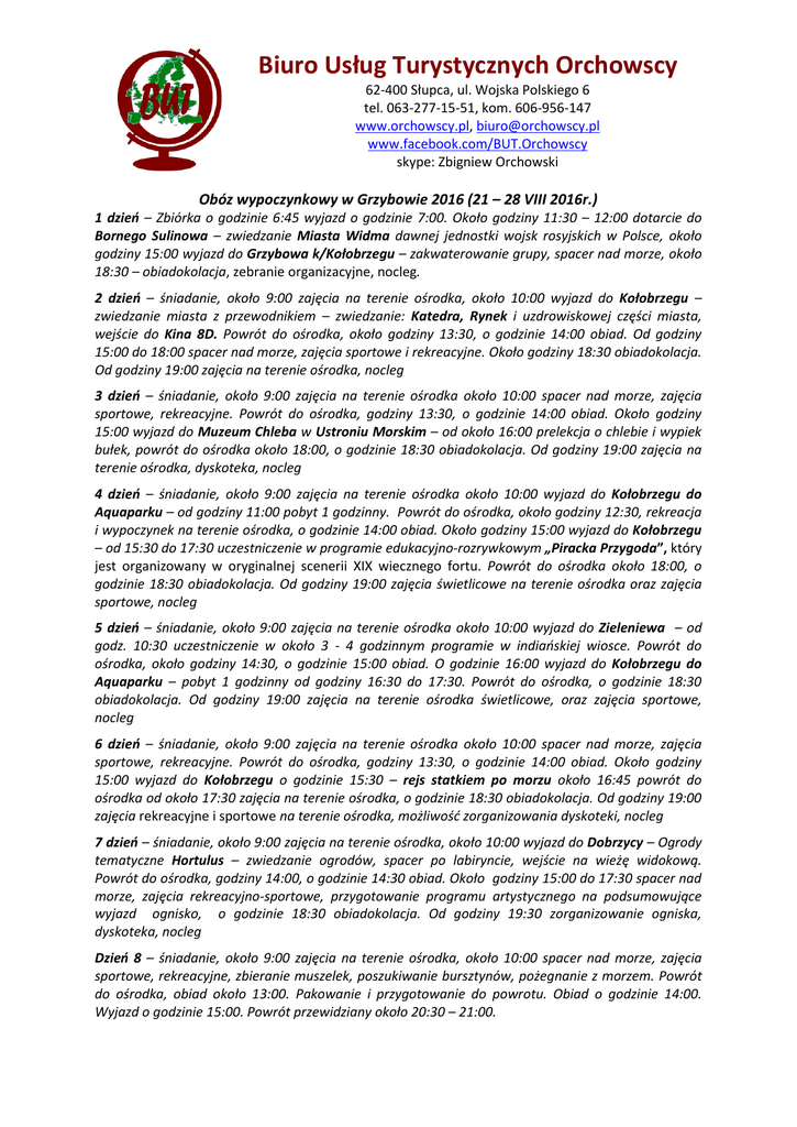 Biuro Usług Turystycznych Orchowscy 62-400 Słupca, ul. Wojska Polskiego 6 tel. 063-277-15-51, kom. 606-956-147 www.orchowscy.pl, [email protected] www.facebook.com/BUT.Orchowscy skype: Zbigniew Orchowski Obóz wypoczynkowy w Grzybowie 2016 (21 – 28 VIII 2016r.) 1 dzień – Zbiórka o godzinie 6:45 wyjazd o godzinie 7:00. Około godziny 11:30 – 12:00 dotarcie do Bornego Sulinowa – zwiedzanie Miasta Widma dawnej jednostki wojsk rosyjskich w Polsce, około godziny 15:00 wyjazd do Grzybowa k/Kołobrzegu – zakwaterowanie grupy, spacer nad morze, około 18:30 – obiadokolacja, zebranie organizacyjne, nocleg. 2 dzień – śniadanie, około 9:00 zajęcia na terenie ośrodka, około 10:00 wyjazd do Kołobrzegu – zwiedzanie miasta z przewodnikiem – zwiedzanie: Katedra, Rynek i uzdrowiskowej części miasta, wejście do Kina 8D. Powrót do ośrodka, około godziny 13:30, o godzinie 14:00 obiad. Od godziny 15:00 do 18:00 spacer nad morze, zajęcia sportowe i rekreacyjne. Około godziny 18:30 obiadokolacja. Od godziny 19:00 zajęcia na terenie ośrodka, nocleg 3 dzień – śniadanie, około 9:00 zajęcia na terenie ośrodka około 10:00 spacer nad morze, zajęcia sportowe, rekreacyjne. Powrót do ośrodka, godziny 13:30, o godzinie 14:00 obiad. Około godziny 15:00 wyjazd do Muzeum Chleba w Ustroniu Morskim – od około 16:00 prelekcja o chlebie i wypiek bułek, powrót do ośrodka około 18:00, o godzinie 18:30 obiadokolacja. Od godziny 19:00 zajęcia na terenie ośrodka, dyskoteka, nocleg 4 dzień – śniadanie, około 9:00 zajęcia na terenie ośrodka około 10:00 wyjazd do Kołobrzegu do Aquaparku – od godziny 11:00 pobyt 1 godzinny. Powrót do ośrodka, około godziny 12:30, rekreacja i wypoczynek na terenie ośrodka, o godzinie 14:00 obiad. Około godziny 15:00 wyjazd do Kołobrzegu – od 15:30 do 17:30 uczestniczenie w programie edukacyjno-rozrywkowym „Piracka Przygoda”, który jest organizowany w oryginalnej scenerii XIX wiecznego fortu. Powrót do ośrodka około 18:00, o godzinie 18:30 obiadokolacja. Od godziny 19:00 zajęcia świetlicowe na terenie ośrodka oraz zajęcia sportowe, nocleg 5 dzień – śniadanie, około 9:00 zajęcia na terenie ośrodka około 10:00 wyjazd do Zieleniewa – od godz. 10:30 uczestniczenie w około 3 - 4 godzinnym programie w indiańskiej wiosce. Powrót do ośrodka, około godziny 14:30, o godzinie 15:00 obiad. O godzinie 16:00 wyjazd do Kołobrzegu do Aquaparku – pobyt 1 godzinny od godziny 16:30 do 17:30. Powrót do ośrodka, o godzinie 18:30 obiadokolacja. Od godziny 19:00 zajęcia na terenie ośrodka świetlicowe, oraz zajęcia sportowe, nocleg 6 dzień – śniadanie, około 9:00 zajęcia na terenie ośrodka około 10:00 spacer nad morze, zajęcia sportowe, rekreacyjne. Powrót do ośrodka, godziny 13:30, o godzinie 14:00 obiad. Około godziny 15:00 wyjazd do Kołobrzegu o godzinie 15:30 – rejs statkiem po morzu około 16:45 powrót do ośrodka od około 17:30 zajęcia na terenie ośrodka, o godzinie 18:30 obiadokolacja. Od godziny 19:00 zajęcia rekreacyjne i sportowe na terenie ośrodka, możliwość zorganizowania dyskoteki, nocleg 7 dzień – śniadanie, około 9:00 zajęcia na terenie ośrodka, około 10:00 wyjazd do Dobrzycy – Ogrody tematyczne Hortulus – zwiedzanie ogrodów, spacer po labiryncie, wejście na wieżę widokową. Powrót do ośrodka, godziny 14:00, o godzinie 14:30 obiad. Około godziny 15:00 do 17:30 spacer nad morze, zajęcia rekreacyjno-sportowe, przygotowanie programu artystycznego na podsumowujące wyjazd ognisko, o godzinie 18:30 obiadokolacja. Od godziny 19:30 zorganizowanie ogniska, dyskoteka, nocleg Dzień 8 – śniadanie, około 9:00 zajęcia na terenie ośrodka, około 10:00 spacer nad morze, zajęcia sportowe, rekreacyjne, zbieranie muszelek, poszukiwanie bursztynów, pożegnanie z morzem. Powrót do ośrodka, obiad około 13:00. Pakowanie i przygotowanie do powrotu. Obiad o godzinie 14:00. Wyjazd o godzinie 15:00. Powrót przewidziany około 20:30 – 21:00. Biuro Usług Turystycznych Orchowscy 62-400 Słupca, ul. Wojska Polskiego 6 tel. 063-277-15-51, kom. 606-956-147 www.orchowscy.pl, [email protected] www.facebook.com/BUT.Orchowscy skype: Zbigniew Orchowski Świadczenia: 1. 7 noclegów w ośrodku wypoczynkowym w Grzybowie, pokoje 3, 4, 5 osobowe z łazienkami. 2. Wyżywieni: 1 dzień obiadokolacja, 2 - 7 dzień śniadanie obiad, kolacja, 8 dzień śniadanie i obiad. 3. Ubezpieczenie NW 4. Opieka pilota, usługi przewodnickie i bilety wstępu do zwiedzanych obiektów.(Borne Sulinowo zwiedzanie Miasta Widmo, zwiedzanie Kołobrzegu, Kino 8d, Ustronie Morskie - Skansen Chleba, „Piracka Przygoda” - zajęcia terenowe o charakterze rywalizacji i zabawy, Kołobrzeg Aquapark w Kołobrzegu 2 wyjazdy po 1 godzinie, , Zieleniewo – indiańska wioska, rejs statkiem po morzu, ogrody tematyczne Hortulus) Kolejność zwiedzanych obiektów może ulec zmianie Koszt wycieczki 8 dniowej: Ilość uczestników 49 Koszt na osobę 890 zł Borne Sulinowo – Miasto Widmo Skansen Chleba Indiańska wioska Molo w Kołobrzegu Plaża w Kołobrzegu Kołobrzeg – ratusz Rejs statkiem Piracka przygoda Ogrody Hortulus