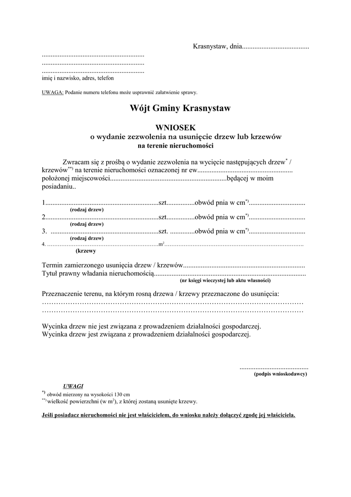 Krasnystaw, dnia...................................... .......................................................... .......................................................... .......................................................... imię i nazwisko, adres, telefon UWAGA: Podanie numeru telefonu może usprawnić załatwienie sprawy. Wójt Gminy Krasnystaw WNIOSEK o wydanie zezwolenia na usunięcie drzew lub krzewów na terenie nieruchomości Zwracam się z prośbą o wydanie zezwolenia na wycięcie następujących drzew* / krzewów**) na terenie nieruchomości oznaczonej nr ew...................................................... położonej miejscowości..................................................................będącej w moim posiadaniu.. 1................................................................szt................obwód pnia w cm*)................................ (rodzaj drzew) 2................................................................szt................obwód pnia w cm*)................................ (rodzaj drzew) 3. .............................................................szt. ..............obwód pnia w cm*)................................ (rodzaj drzew) 4. ………………………………………………………m2……………………………………………………………………. (krzewy Termin zamierzonego usunięcia drzew / krzewów..................................................................... Tytuł prawny władania nieruchomością...................................................................................... (nr księgi wieczystej lub aktu własności) Przeznaczenie terenu, na którym rosną drzewa / krzewy przeznaczone do usunięcia: ………………………………………………………………………………………………… ………………………………………………………………………………………………… Wycinka drzew nie jest związana z prowadzeniem działalności gospodarczej. Wycinka drzew jest związana z prowadzeniem działalności gospodarczej. ....................................... (podpis wnioskodawcy) UWAGI *) **) obwód mierzony na wysokości 130 cm wielkość powierzchni (w m2), z której zostaną usunięte krzewy. Jeśli posiadacz nieruchomości nie jest właścicielem, do wniosku należy dołączyć zgodę jej właściciela. Procedura usuwania drzew lub krzewów z terenu nieruchomości: 1.Podstawa prawna: Ustawa z dnia 16 kwietnia 2004 r. Dz. U. Nr Nr 151, poz. 1220, z późn. zmian. Art. 83 ust. 1 w/w ustawy: Usunięcie drzew lub krzewów z terenu nieruchomości może nastąpić po uzyskaniu zezwolenia wydanego przez wójta, burmistrza albo prezydenta miasta na wniosek posiadacza nieruchomości. Jeżeli posiadacz nieruchomości nie jest właścicielem lub użytkownikiem wieczystym, do wniosku dołącza się zgodę jej właściciela. 2.Przepisów wyżej wymienionej ustawy nie stosuje się do drzew lub krzewów rosnących: - w lasach, - na plantacjach drzew i krzewów, - owocowych, - których wiek nie przekracza 10 lat. 3.Opłaty: W przypadku osób fizycznych nie pobiera się opłat za wydane zezwolenie. Również nie pobiera się opłat za usuwanie drzew zagrażających bezpieczeństwu ludzi oraz mienia w istniejących obiektach budowlanych, stanowiących zagrożenie dla ruchu drogowego i kolejowego, w związku z przebudową dróg i linii kolejowych, związanych z prowadzeniem zabiegów pielęgnacyjnych i porządkowych itp. 4.Formularz wniosku o wydanie zezwolenia dostępny jest na stronie internetowej „Ochrona Środowiska” zakładka „Poradnik Interesanta” oraz w pokoju 209 Urzędu Gminy Krasnystaw.