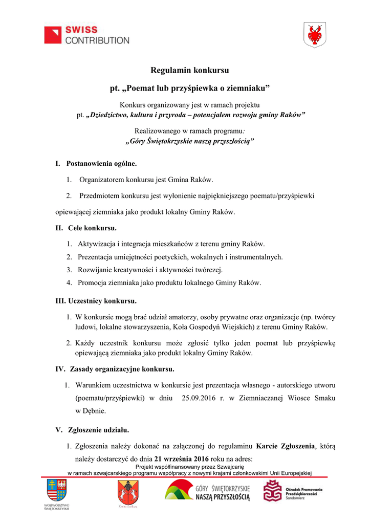 Regulamin konkursu pt. „Poemat lub przyśpiewka o ziemniaku” Konkurs organizowany jest w ramach projektu pt. „Dziedzictwo, kultura i przyroda – potencjałem rozwoju gminy Raków” Realizowanego w ramach programu: „Góry Świętokrzyskie naszą przyszłością” I. Postanowienia ogólne. 1. Organizatorem konkursu jest Gmina Raków. 2. Przedmiotem konkursu jest wyłonienie najpiękniejszego poematu/przyśpiewki opiewającej ziemniaka jako produkt lokalny Gminy Raków. II. Cele konkursu. 1. Aktywizacja i integracja mieszkańców z terenu gminy Raków. 2. Prezentacja umiejętności poetyckich, wokalnych i instrumentalnych. 3. Rozwijanie kreatywności i aktywności twórczej. 4. Promocja ziemniaka jako produktu lokalnego Gminy Raków. III. Uczestnicy konkursu. 1. W konkursie mogą brać udział amatorzy, osoby prywatne oraz organizacje (np. twórcy ludowi, lokalne stowarzyszenia, Koła Gospodyń Wiejskich) z terenu Gminy Raków. 2. Każdy uczestnik konkursu może zgłosić tylko jeden poemat lub przyśpiewkę opiewającą ziemniaka jako produkt lokalny Gminy Raków. IV. Zasady organizacyjne konkursu. 1. Warunkiem uczestnictwa w konkursie jest prezentacja własnego - autorskiego utworu (poematu/przyśpiewki) w dniu 25.09.2016 r. w Ziemniaczanej Wiosce Smaku w Dębnie. V. Zgłoszenie udziału. 1. Zgłoszenia należy dokonać na załączonej do regulaminu Karcie Zgłoszenia, którą należy dostarczyć do dnia 21 września 2016 roku na adres: Projekt współfinansowany przez Szwajcarię w ramach szwajcarskiego programu współpracy z nowymi krajami członkowskimi Unii Europejskiej Gmina Raków ul. Ogrodowa 1, 26-035 Raków VI. Komisja Konkursowa. 1. Komisja Konkursowa powołana przez Organizatora będzie obradować w dniu 25 września 2016 roku w Ziemniaczanej Wiosce Smaku w Dębnie. 2. Komisja konkursowa wyłoni laureatów, biorąc pod uwagę następujące kryteria: Dobór repertuaru w skali od 1 do 10. Zachowanie ludowego charakteru i związek z regionem od 1 do 10 punktów. Czystość gwary i poprawna dykcja od 1 do 10 punktów. Interpretacja i wyraz artystyczny od 1 do 10 punktów. Maksymalnie można otrzymać 40 punktów. 3. Z posiedzenia komisji konkursowej zostanie sporządzony protokół. 4. Komisja przyzna nagrody (bony towarowe) za: I miejsce – bon towarowy o wartości 350,00 zł II miejsce – bon towarowy o wartości 200,00 zł III miejsce – bon towarowy o wartości 150,00 zł oraz 1 wyróżnienie - bon wartości 100,00 zł Komisja przyzna nagrody o łącznej wartości 800,00 zł. 5. Decyzja komisji jest ostateczna i nie przysługuje od niej odwołanie. VII. Rozstrzygnięcie konkursu i rozdanie nagród. 1. Rozstrzygnięcie do godz. 19.00. konkursu i rozdanie nagród odbędzie się 25.09.2016 2. Po ogłoszeniu wyników przez Komisję Konkursową nastąpi wręczenie nagród. 3. Nagrody nie podlegają zamianie na ich równowartość pieniężną. Projekt współfinansowany przez Szwajcarię w ramach szwajcarskiego programu współpracy z nowymi krajami członkowskimi Unii Europejskiej r. VIII. Postanowienia Końcowe. 1. Postanowienia niniejszego regulaminu są wyłączną podstawą prowadzenia konkursu, a ich wykładnia i interpretacja należy wyłącznie do Organizatora konkursu. 2. Uczestnicy Konkursu oddając Organizatorowi Kartę Zgłoszenia, wyrażają zgodę na przetwarzanie przez Organizatora danych osobowych w celu przeprowadzenia niniejszego Konkursu. 3. Biorąc udział w konkursie uczestnicy akceptują jego regulamin. 4. Kwestie nie unormowane niniejszym regulaminem, a dotyczące konkursu rozstrzyga Organizator konkursu. IX. Kontakt. Wszelkich informacji udzielają pracownicy Urzędu Gminy w Rakowie pod numerem telefonu 41/3535 018, 600 330 476 – Paulina Szewczyk, 661 923 863 - Halina Łukasik. Projekt współfinansowany przez Szwajcarię w ramach szwajcarskiego programu współpracy z nowymi krajami członkowskimi Unii Europejskiej