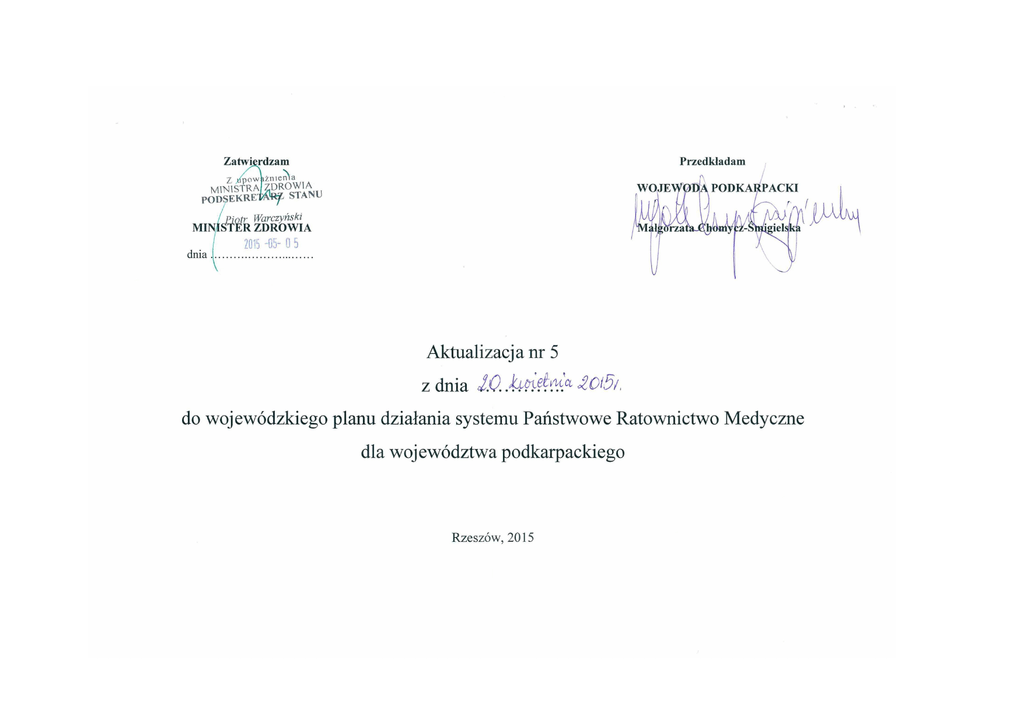 Spis treści ROZDZIAŁ I 1. CHARAKTERYSTYKA POTENCJALNYCH ZAGROŻEŃ DLA ŻYCIA I ZDROWIA LUDZI 1.5. Liczba wyjazdów zespołów ratownictwa medycznego ………………..………………………………………………………..…… 4 TABELA 1 –Wyjazdy zespołów ratownictwa medycznego w roku 2014 TABELA 2- Wyjazdy zespołów ratownictwa medycznego w roku 2014 1.6. Liczba wylotów lotniczego zespołu ratownictwa medycznego …...…………………...……………………………….………......... 14 TABELA 3 - Wyloty lotniczych zespołów ratownictwa medycznego w roku 2014 TABELA 4 - Wyloty lotniczych zespołów ratownictwa medycznego w roku 2014 1.7. Hospitalizacja osób w stanach nagłego zagrożenia zdrowotnego ……………………………………………………….………........ 16 TABELA 5 – Liczba przyjęć pacjentów w szpitalnym oddziale ratunkowym w roku 2014 TABELA 6 – Liczba przyjęć pacjentów w izbie przyjęć w roku 2014 ROZDZIAŁ II INFORMACJE O LICZBIE I ROZMIESZCZENIU NA OBSZARZE WOJEWÓDZTWA JEDNOSTEK SYSTEMU, CENTRUM URAZOWEGO JEDNOSTEK ORGANIZACYJNYCH SZPITALI WYSPECJALIZOWANYCH W ZAKRESIE UDZIELANIA ŚWIADCZEŃ ZDROWOTNYCH NIEZBĘDNYCH DLA RATOWNICTWA MEDYCZNEGO 2.1. Zespoły ratownictwa medycznego …………………………………………………………………………………............................ TABELA 7 - rejony operacyjne i miejsca stacjonowania zespołów ratownictwa medycznego- stan na 31 grudnia 2014r. 23 TABELA 8 - zespoły ratownictwa medycznego włączone do systemu Państwowe Ratownictwo Medyczne - stan na 31 grudnia 2014r. TABELA 9– dodatkowe zespoły ratownictwa medycznego – stan na dzień 31.12. 2014r. 2.2. Szpitalne oddziały ratunkowe ……………………………………………………………………………………………………..…. 40 TABELA 10 – Szpitalne oddziały ratunkowe – stan na dzień 31.12.2014 r. Strona 2 z 58 2.3. Centrum urazowe ………………………………………………………………………………………………………………..…… 43 TABELA 11 – centrum urazowe – za rok 2014 2.4. Jednostki organizacyjne szpitali wyspecjalizowane w zakresie udzielania świadczeń zdrowotnych niezbędnych dla ratownictwa medycznego ………………………………………………………………………………………………………………………....… 44 TABELA 12 –jednostki organizacyjne szpitala wyspecjalizowane w zakresie udzielania świadczeń zdrowotnych niezbędnych dla ratownictwa medycznego stan na dzień 31.12.2014 r. 2.11. Informacja na temat personelu pracującego w jednostkach systemu …………………………………………………..………...…. 55 TABELA 14 – Personel zatrudniony w jednostkach systemu (SOR – szpitalne oddziały Ratunkowe, ZRM – zespoły ratownictwa medycznego) - stan na dzień 31.12.2014r. Strona 3 z 58 1.5. Liczba wyjazdów zespołów ratownictwa medycznego TABELA 1 – Wyjazdy zespołów ratownictwa medycznego w roku 2014 1. 2. bieszczadzki 4b 4d 4e 0-18 lat >18 lat 4c 1S Ustrzyki Dolne 29 484 1 UA 3 15 0 0 2 0 1P Ustrzyki Dolne 80 1 111 3 UA,2AF, 1GB,1EE 48 212 1 42 90 1P Lutowiska 17 390 2UA, 1D 10 88 1 9 1P Ustrzyki Górne SEZONOWA 6 66 0 3 19 0 RAZEM 132 2 051 11 64 334 1S Brzozów 86 1 015 3 UA, 1 I 49 1P Brzozów 146 2 556 0 1P Nozdrzec 2 96 234 3 667 0-18 lat >18 lat 5a 4f 5b 0-18 lat >18 lat 5c 6a 0-18 lat 6b 7 Liczba pacjentów przewiezionych przez zespół ratownictwa medycznego do szpitala 4a cudzoziemcy (kraj pochodzenia) Liczba, rodzaj oraz miejsce stacjonowania zespołów ratownictwa medycznego Wyjazdy zespołów ratownictwa medycznego 4 5 6 wyjazdy do stanu nagłego zagrożenia zdrowotnego zgony przed podjęciem wyjazdy niezwiązane ze w tym : albo trakcie wykonywania stanem nagłego medycznych czynności zagrożenia zdrowotnego ratunkowych pacjenci obywatele urazowi Rzeczypospolitej obywatele obywatele obywatele Polskiej Rzeczypospolitej Rzeczypospolitej Rzeczypospolite Polskiej Polskiej j Polskiej cudzoziemcy (kraj pochodzenia) Powiat 3 cudzoziemcy (kraj pochodzenia) Lp 2 cudzoziemcy (kraj pochodzenia) 1 >18 lat 6c 1 27 2 UA 308 1 UA 0 2 0 912 15 0 0 4 1 UA 298 4 3 0 0 0 0 51 2 55 110 1 1 33 3 1 569 313 3 UA 0 0 0 0 46 0 628 18 108 0 0 0 0 0 17 0 596 0 4 35 0 0 0 0 0 8 0 50 4 71 456 3 0 0 0 0 71 0 1 274 brzozowski RAZEM Strona 4 z 58 3. 4. 5 6 2S Dębica 184 2 485 0 19 138 0 0 0 0 1 121 0 1 838 2P Dębica 181 3 395 1UA 110 778 1 UA 0 0 0 0 2 0 2 761 1P Strzegocice 87 1 094 2 UA 31 145 0 0 0 0 0 11 0 1 012 RAZEM 452 6 974 3 160 1 061 1 0 0 0 1 134 0 5 611 1S Jasło 91 989 0 28 143 0 3 30 0 0 118 0 908 1S Nowy Żmigród 47 924 0 12 98 0 1 29 0 1 23 0 801 1P Jasło 103 2 222 0 39 302 0 4 68 0 0 4 0 2 145 1P Jasło 111 2 168 0 34 301 0 3 67 0 0 7 0 2 107 RAZEM 352 6 303 0 113 844 0 11 194 0 1 152 0 5 961 1S Jarosław 99 1 764 5 UA, 1 I 37 202 0 27 285 1 UA 0 87 0 1 582 1P Jaroslaw 146 2 640 4 UA 32 505 0 35 695 1 UA 0 23 0 2 609 1S Radymno 73 1 372 7 UA 46 225 8 UA 14 78 2 UA 0 42 0 1 022 1P Pruchnik 55 1 284 1 UA 24 194 0 6 237 0 0 28 0 1 193 RAZEM 373 7 060 18 139 1 126 8 82 1 295 4 0 180 0 6 406 1S Kolbuszowa 59 956 13 ( 2 F, 6I, 1USA,4D) 20 263 7 (1F, 2 I, 4D) 46 32 0 0 82 0 892 1P Kolbuszowa 66 1 381 14 (1F ,7I, 4I, 2RO) 27 389 7 (3I, 2D, 2RO) 22 64 0 0 0 0 1 246 RAZEM 125 2 337 27 47 652 14 68 96 0 0 82 0 2 138 dębicki jasielski jarosławski kolbuszowski Strona 5 z 58 7 8 9 10 M. Krosno krośnieński leżajski lubaczowski leski 1S Krosno 1 472 2SK 1 SK 0 0 0 0 0 1S M. Piastowe 1 057 2RO 2 RO 0 0 0 0 0 1P Krosno 2 899 0 0 0 0 0 0 0 2 710 0 0 0 0 0 0 0 1P Dukla 1 530 1RO, 1UA 1 RO, 1 UA 0 0 0 0 0 1P Jedlicze 1 820 0 0 0 0 0 0 0 1P Rymanów 1 596 0 0 0 0 0 0 0 6 18 (5 GB, 4 SE, 1CH, 2 B, 2F, 2D, 1 I, 1 IE) 294 1 525 5 0 0 0 207 0 0 8 893 72 561 5 (1 CH, 2 F, 1 B, 1 GB) 0 0 0 0 166 0 3 158 1P Krosno 585 294 1 525 207 8 893 RAZEM 585 12 499 1S L