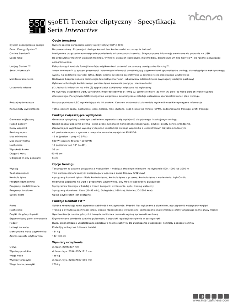 550ETi Trenażer eliptyczny - Specyfikacja Seria Interactive Opcje trenażera System oszczędzania energii System spełnia europejskie normy wg Dyrektywy ErP z 2013 Smart Energy System™ Bezprzewodowy. Aktywacja i obsługa konsoli bez konieczności rozpoczęcia ćwiczeń On-line Service™ Inteligentne urządzenie automatycznie powiadamia o konieczności serwisu. Diagnostyczne informacje serwisowe do pobrania na USB Łącze USB Do przesyłania własnych ustawień treningu, wyników, ustawień osobistych, multimediów, diagnostyki On-line Service™, do ręcznej aktualizacji oprogramowania Uni-jog Control ™ Pełny dostęp i kontrola funkcji interfejsu użytkownika i ustawień za pomocą przełącznika Uni-Jog™. Smart W orkrate™ Smart W orkrate™ to system prezentacji kolorowych informacji umożliwiający użytkownikowi optymalizację treningu dla osiągnięcia maksymalnego wyniku na podstawie wartości tętna, dzięki czemu ćwiczenia są efektywne w zakresie tętna docelowego użytkownika Monitorowanie tętna Kodowana bezprzewodowa technologia telemetryczna Polar - wbudowany odbiornik tętna (wymagany nadajnik paskowy) Cyfrowa technologia kontaktowego pomiaru tętna zapewnia precyzję i niezawodność Ustawienia własne (1) Jednostki miary km lub mile (2) sygnalizator dźwiękowy: włączony lub wyłączony Po wykryciu urządzenia USB, użytkownik może dostosować (1) imię (2) jednostki miary (3) wiek (4) płeć (5) masę ciała (6) opcje sygnału dźwiękowego. Po wykryciu USB inteligentne urządzenie automatycznie załaduje ustawienia spersonalizowane i plan treningu. Rodzaj wyświetlacza Matryca punktowa LED wyświetlająca do 18 znaków. Centrum wiadomości z łatwością wyświetli wszelkie wymagane informacje Komunikaty wyświetlacza Tętno, poziom oporu, nachylenie, czas, kalorie, moc, dystans, ilość kroków na minutę (SPM), podsumowanie treningu, profil treningu Funkcje zwiększające wydajność Generator trójfazowy Generator hybrydowy z własnym zasilaniem zapewnia stałą wydajność dla płynnego i spokojnego treningu Napęd pasowy Napęd pasowy zapewnia płynną i cichą pracę. Minimalna konieczność konserwacji. Szybki i prosty serwis urządzenia. Dolny wspornik Zapewniająca wyjątkowo wysoką wydajność konstrukcja dolnego wspornika z uszczelnionym łożyskiem kulkowym Poziomy oporu 40 poziomów oporu - zgodnie z nowymi normami europejskimi EN957-9 Moc minimalna 15 W (poziom 1 przy 40 SPM) Moc maksymalna 630 W (poziom 40 przy 150 SPM) Nachylenie 16 poziomów (od 13° do 40°) Wysokość kroku 35 cm Długość kroku 52-55 cm Odległość m-dzy pedałami 6 cm Opcje treningu Wyścig Ten program to zabawa połączona z wyzwaniem - wyścig z aktualnym mistrzem na dystansie 500, 1000 lub 2000 m Test sprawności Test określa poziom kondycji ćwiczącego w oparciu o pułap tlenowy (V02 max) Kontrola tętna 4 programy kontroli tętna - Stała kontrola tętna, kontrola tętna z przerwą, kontrola tętna - wzniesienia, tryb Cardio Program użytkownika Możliwość zapisania na USB 7 programów użytkownika, aby móc je stosować w przyszłości Programy predefiniowane 5 programów treningu w każdej z trzech kategorii: wzniesienie, opór, trening wsteczny Programy docelowe 3 programy docelowe: Czas (10-99 min), Odległość (1-99 km), Kalorie (10-2500 kcal) Szybki Start Opcja Szybki Start jest dostępna. Funkcje Comfort Fit™ Rama Solidna konstrukcja ramy zapewnia stabilność i wytrzymałość. Przedni filar wykonano z aluminium, aby zapewnić estetyczny wygląd Nachylenie Trening z symulacją pochyłości terenu dodaje różnorodności ćwiczeniom i jednocześnie maksymalizuje efekty angażując różne grupy mięśni Drążki dla górnych partii Synchronizacja ruchów górnych i dolnych partii ciała poprawia ogólną sprawność ruchową Ergonomiczny panel sterowania Ergonomiczne położenie czujnika pulsometru i przyciski regulacji nachylenia w zasięgu ręki Pedały Duże, ergonomicznie ukształtowane podstawy i miękkie uchwyty dla zwiększenia stabilności i komfortu podczas treningu Uchwyt na wodę Podwójny uchwyt na 1-litrowe butelki Maksymalna masa użytkownika 181 kg Zakres wzrostu użytkownika 147-193 cm Wymiary urządzenia Obrys dł./szer. 2094x837 mm Wymiary produktu dł./szer./wys. 2094x837x1716 mm Waga netto 188 kg Wymiary przesyłki dł./szer./wys. 2200x780x1000 mm Waga brutto przesyłki 270 kg