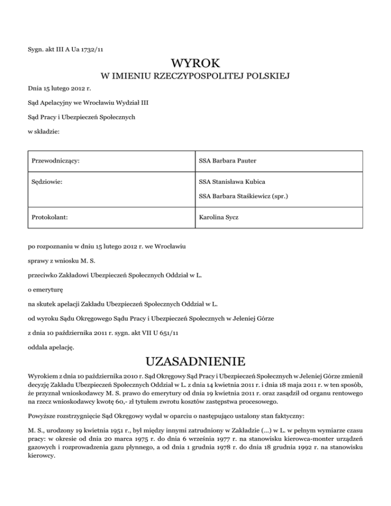 Sygn. akt III A Ua 1732/11 WYROK W IMIENIU RZECZYPOSPOLITEJ POLSKIEJ Dnia 15 lutego 2012 r. Sąd Apelacyjny we Wrocławiu Wydział III Sąd Pracy i Ubezpieczeń Społecznych w składzie: Przewodniczący: SSA Barbara Pauter Sędziowie: SSA Stanisława Kubica SSA Barbara Staśkiewicz (spr.) Protokolant: Karolina Sycz po rozpoznaniu w dniu 15 lutego 2012 r. we Wrocławiu sprawy z wniosku M. S. przeciwko Zakładowi Ubezpieczeń Społecznych Oddział w L. o emeryturę na skutek apelacji Zakładu Ubezpieczeń Społecznych Oddział w L. od wyroku Sądu Okręgowego Sądu Pracy i Ubezpieczeń Społecznych w Jeleniej Górze z dnia 10 października 2011 r. sygn. akt VII U 651/11 oddala apelację. UZASADNIENIE Wyrokiem z dnia 10 października 2010 r. Sąd Okręgowy Sąd Pracy i Ubezpieczeń Społecznych w Jeleniej Górze zmienił decyzję Zakładu Ubezpieczeń Społecznych Oddział w L. z dnia 14 kwietnia 2011 r. i dnia 18 maja 2011 r. w ten sposób, że przyznał wnioskodawcy M. S. prawo do emerytury od dnia 19 kwietnia 2011 r. oraz zasądził od organu rentowego na rzecz wnioskodawcy kwotę 60,- zł tytułem zwrotu kosztów zastępstwa procesowego. Powyższe rozstrzygnięcie Sąd Okręgowy wydał w oparciu o następująco ustalony stan faktyczny: M. S., urodzony 19 kwietnia 1951 r., był między innymi zatrudniony w Zakładzie (...) w L. w pełnym wymiarze czasu pracy: w okresie od dnia 20 marca 1975 r. do dnia 6 września 1977 r. na stanowisku kierowca-monter urządzeń gazowych i rozprowadzenia gazu płynnego, a od dnia 1 grudnia 1978 r. do dnia 18 grudnia 1992 r. na stanowisku kierowcy. W okresie zatrudnienia w w/w zakładzie pracy wnioskodawca był kierowcą specjalistycznego samochodu dostawczego marki Żuk, przystosowanego do przewozu materiałów niebezpiecznych, to jest butli z gazem propan butan. Do obowiązków wnioskodawcy należał załadunek butli z gazem na samochód, dowiezienie jej i wniesienie do klienta, a następnie zastąpienie pustej butli przez zamontowanie pełnej. Ciężar butli wynosił od 22 do 27 kg. W razie potrzeby wnioskodawca zajmował się także montażem kuchenek gazowych u klientów. Od 1987 r. wnioskodawca prowadził samochody ciężarowe o dopuszczalnym ciężarze całkowitym powyżej 3,5 tony, przeznaczone między innymi do przewozu gazu. Organ rentowy w decyzjach z dnia 14 kwietnia 2011 r. i dnia 18 maja 2011 r. nie uznał wnioskodawcy powyższego okresu zatrudnienia do okresów pracy w szczególnych warunkach i z uwagi na brak wymaganych 15 lat pracy w szczególnych warunkach odmówił mu przyznania prawa do wcześniejszej emerytury. Na podstawie powyższych ustaleń Sąd Okręgowy uznał, że odwołanie wnioskodawcy jest zasadne. Sąd Okręgowy wskazał, że akta osobowe wnioskodawcy oraz zeznania świadków wykazały, iż wnioskodawca podczas zatrudnienia w Zakładzie (...) w L. pracował stale i w pełnym wymiarze w szczególnych warunkach. W ocenie Sądu pierwszej instancji wnioskodawca początkowo wykonywał pracę określoną w wykazie A dziale IV poz. 40 stanowiącego załącznik do rozporządzenia Rady Ministrów z dnia 7 lutego 1983 r. w sprawie wieku emerytalnego pracowników zatrudnionych w szczególnych warunkach lub w szczególnym charakterze (Dz. U. Nr 8, poz. 43 ze zm.), czyli pracę załadunkową, rozładunkową i transportem materiału wybuchowego (gazu) i następnie pracował jako kierowca samochodów ciężarowych (wykazie A Dział VIII poz. 2). W tych okolicznościach Sąd pierwszej instancji uznał, że cały okres w/w zatrudnienia podlega uwzględnieniu do okresów prac w szczególnych warunkach i konsekwencji przyznał wnioskodawcy prawo do emerytury. Odnośnie początku nabycia emerytury przez wnioskodawcę Sąd Okręgowy w świetle art. 129 ustawy z dnia 17 grudnia 1998 r. o emeryturach i rentach z Funduszu Ubezpieczeń Społecznych (Dz. U. z 2009 r. Nr 153, poz. 1227) przyznał to świadczenie od dnia 19 kwietnia 1951 r., czyli od dnia ukończenia przez wnioskodawcę 60 roku życia. Orzeczenie o kosztach Sąd pierwszej instancji oparł na art. 98 kpc oraz rozporządzeniu Ministra Sprawiedliwości z dnia 28 września 2002 r. w sprawie opłat za czynności radców prawnych oraz ponoszenia przez Skarb Państwa kosztów pomocy prawnej udzielonej przez radcę prawnego ustanowionego z urzędu (Dz. U. z 2005 r. nr 11, poz. 15). Organ rentowy zaskarżył powyższy wyrok w całości, zarzucając mu naruszenie art. 184 w/w ustawy przez przyznanie wnioskodawcy prawa do emerytury, w sytuacji gdy nie wykazał on, że stale i w pełnym wymiarze wykonywał pracę w szczególnych warunkach. Nadto zarzucił dowolna ocenę dowodów przez uznanie, iż wnioskodawca, kierując samochodem dostawczym „Żuk”, wykonywał pracę kierowcy samochodu ciężarowego. Wskazując na powyższe wniósł o zmianę zaskarżonego wyroku przez oddalenie odwołania wnioskodawcy, ewentualnie o jego uchylenie i przekazanie sprawy Sądowi pierwszej instancji do ponownego rozpoznania. Sąd Apelacyjny zważył, co następuje: Apelacja organu rentowego jest bezzasadna. Zgodnie z art. 184 ust. 1 ustawy o emeryturach i rentach z Funduszu Ubezpieczeń Społecznych ubezpieczonym urodzonym po dniu 31 grudnia 1948 r. przysługuje emerytura po osiągnięciu wieku przewidzianego w art. 32, jeżeli w dniu wejścia w życie ustawy, czyli 1 stycznia 1999 r., osiągnęli: okres zatrudnienia w szczególnych warunkach wymaganym w przepisach dotychczasowych do nabycia prawa do emerytury w wieku niższym niż 65 lat - dla mężczyzn ( pkt. 1) oraz okres składkowy i nieskładkowy, o którym mowa w art. 27 ( pkt. 2). Z kolei po myśli ust. 2 tego przepisu emerytura, o której mowa w ust. 1, przysługuje pod warunkiem nieprzystąpienia do otwartego funduszu emerytalnego oraz rozwiązania stosunku pracy - w przypadku ubezpieczonego będącego pracownikiem. Z kolei po myśli art. 32 w/w ustawy w związku z § 4 rozporządzeniem Rady Ministrów z dnia 7 lutego 1983 r. w sprawie wieku emerytalne