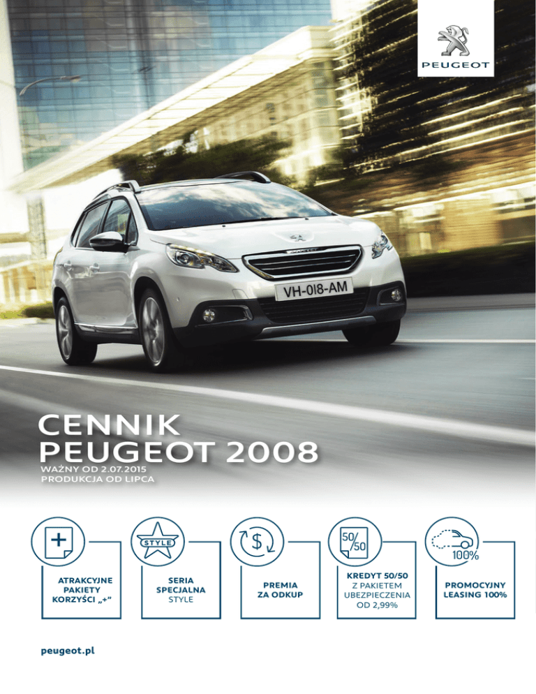 + $ odkup style CENNIK PEUGEOT 2008 WAŻNY OD 2.07.2015 PRODUKCJA OD LIPCA k re d y t PAKIETY KORZYŚCI „+” u b e z pp oiadekkciuzeeptny i e PREMIA SPECJALNA k o m u n i k a c y j n e s t y l eSERIA STYLE ZA ODKUP kredyt kkrreeddyytt 3x 33% style k re d y t + 100 sKREDYT tfo y lret 50/50 kom Z k r e dPAKIETEM yt UBEZPIECZENIA OD 2,99% 3x 33% 3x 33% peugeot.pl kredyt odkup kredyt +$ +$ ue p poadkkiATRAKCYJNE ty $ pakiety aski n i egt y l epaPROMOCYJNY kredyt LEASING 100% 3x 33% ubezpieczenie r ei kdayct y j n e k o m uk n ko k rme fo d yrtt CENY CROSSOVER SKRZYNIA BIEGÓW ACCESS ACTIVE STYLE ALLURE 1,2 PureTech 82 KM M5 55 300 zł 62 000 zł 64 500 zł – 1,2 PureTech 110 KM M5 S&S – 68 500 zł 71 000 zł 75 000 zł 1,2 PureTech 130 KM M6 S&S – – – 78 500 zł 1,6 BlueHDi 75 KM M5 – 70 700 zł – – 1,6 BlueHDi 100 KM M5 S&S – 76 000 zł 78 500 zł 82 500 zł 1,6 BlueHDi 120 KM M6 S&S – – – 86 700 zł M5 – manualna skrzynia biegów o 5 przełożeniach. M6 – manualna skrzynia biegów o 6 przełożeniach. S&S – system Stop & Start. PAKIETY WYPOSAŻENIA CENA 4100 ZŁ 1690 ZŁ ACTIVE+ NAWIGACJA AUTOMATYCZNA KLIMATYZACJA DWUSTREFOWA PAKIET MIEJSKI Dla silników 1,2 PureTech 82 KM, 1,2 PureTech 110 KM, 1,6 BlueHDi 100 KM. STYLE+ NAWIGACJA CENA 3800 ZŁ 1490 ZŁ AUTOMATYCZNA KLIMATYZACJA DWUSTREFOWA ALARM Dla silników 1,2 PureTech 82 KM, 1,2 PureTech 110 KM, 1,6 BlueHDi 100 KM. ALLURE+ NAWIGACJA CENA 4600 ZŁ 1990 ZŁ SZKLANY DACH PANORAMICZNY ALARM Dla silnika 1,2 PureTech 110 KM. 2 WYPOSAŻENIE BEZPIECZEŃSTWO I ZABEZPIECZENIA ANTYKRADZIEŻOWE ACCESS ACTIVE STYLE ALLURE ABS ze wspomaganiem hamowania awaryjnego (AFU) S S S S ESP – system stabilizacji toru jazdy S S S S Hill Assist – system wspomagający pokonywanie podjazdów (niedostępny dla silników 1,2 PureTech 82 KM oraz 1,6 BlueHDi 75 KM) – S S S Poduszki czołowe dla kierowcy i pasażera (dla pasażera z możliwością dezaktywacji) S S S S Poduszki boczne w pierwszym rzędzie foteli S S S S Poduszki kurtynowe dla pierwszego i drugiego rzędu foteli S S S S Pasy bezpieczeństwa w pierwszym rzędzie: – regulacja wysokości położenia – napinacze bezpieczeństwa – ograniczniki siły napięcia S S S S Pasy bezpieczeństwa w drugim rzędzie (3-punktowe dla wszystkich siedzeń) S S S S Kontrolki niezapiętych pasów z przodu z funkcją ostrzegania o wypięciu pasów S S S S Mocowania fotelika dziecięcego Isofix (x 2) w drugim rzędzie siedzeń S S S S Reflektory przednie halogenowe (soczewkowe) + światła do jazdy dziennej LED S S S S Reflektory przednie przeciwmgielne z chromowanym wykończeniem – S S – Reflektory przednie przeciwmgielne z chromowanym wykończeniem i funkcją doświetlania zakrętów – – – S System tylnego oświetlenia z funkcją ostrzegania innych użytkowników drogi przy nagłym hamowaniu pojazdu S S S S Centralny zamek sterowany pilotem: – jeden pilot zdalnego sterowania – blokowanie drzwi podczas ruszania S S S S Mechaniczna blokada otwarcia tylnych drzwi przez dzieci S S S S Immobiliser S S S S 700 zł 700 zł 700 zł 700 zł Wspomaganie kierownicy elektryczne S S S S Regulacja kolumny kierownicy manualna w dwóch płaszczyznach S S S S Regulator i ogranicznik prędkości ze sterowaniem z kolumny kierownicy S S S S Przednia szyba akustyczna (tylko dla silnika 1,6 BlueHDi 120 KM) – – – S Elektrycznie sterowane szyby boczne przednie (po stronie kierowcy sterowanie sekwencyjne z blokadą przycięcia) S S S S Elektrycznie sterowane szyby boczne tylne: – sterowanie sekwencyjne z blokadą przycięcia wszystkich szyb – domykanie okien przy zamykaniu samochodu – elektryczna blokada otwarcia tylnych drzwi i okien przez dzieci – lusterka boczne składane elektrycznie – 400 zł 400 zł S Lusterka boczne sterowane i podgrzewane elektrycznie + zintegrowane migacze S S S S Lusterko wewnętrzne elektrochromatyczne (dla Active i Style element opcji Pakiet Widoczność) – P P S Schowki otwarte: – w desce rozdzielczej nad wylotami powietrza (brak przy obecności radia) – w konsoli środkowej pod sterowaniem klimatyzacji – w konsoli środkowej przy dźwigni hamulca ręcznego (brak przy wyborze opcji Pakiet Grip Control) S S S S Schowek w desce rozdzielczej przed pasażerem, zamykany i podświetlany S S S S Schowek w konsoli środkowej, zamykany roletą S S S S Gniazda 12 V: – w dolnej części deski rozdzielczej – w tylnej części konsoli środkowej S S S S Uchwyty na napoje w konsoli środkowej – dwa dla osób w pierwszym rzędzie – – – S Kieszenie w drzwiach bocznych z przodu i z tyłu S S S S Osłony przeciwsłoneczne z lusterkami dla kierowcy i pasażera S S S S Alarm (zawiera 2 piloty zdalnego sterowania) KOMFORT 3 OŚWIETLENIE WNĘTRZA ACCESS ACTIVE STYLE ALLURE Oświetlenie wnętrza: – 1 lampka w konsoli sufitowej z przodu – 1 lampka w konsoli sufitowej w drugim rzędzie foteli – oświetlenie bagażnika S S S – Oświetlenie wnętrza (dla Active i Style z opcją Szklany dach panoramiczny Cielo): – 1 lampka LED główna + 2 lampki LED do czytania w konsoli sufitowej z przodu – 1 lampka LED główna + 2 lampki LED do czytania w konsoli sufitowej w drugim rzędzie foteli – oświetlenie bagażnika – P P S Podświetlenie ambiente: – podświetlenie dachu (brak przy obecności opcji Szklany dach panoramiczny Cielo) – podświetlenie obramowań zegarów – podświetlenie pod tablicą zegarów – podświetlenie miejsca na nogi z przodu – – – S Klimatyzacja manualna jednostrefowa: – filtr przeciwpyłkowy – klimatyzowany schowek przed pasażerem 3000 zł S S – Klimatyzacja automatyczna dwustrefowa: – funkcje Soft Auto, Auto, Fast Auto – filtr przeciwpyłkowy z węglem aktywnym – klimatyzowany schowek przed pasażerem – 1000 zł 1000 zł S Tylna szyba ogrzewana + wycieraczka S S S S Fotele przednie: – manualna regulacja wzdłużna foteli – manualna regulacja pochylenia oparć foteli – manualna regulac
