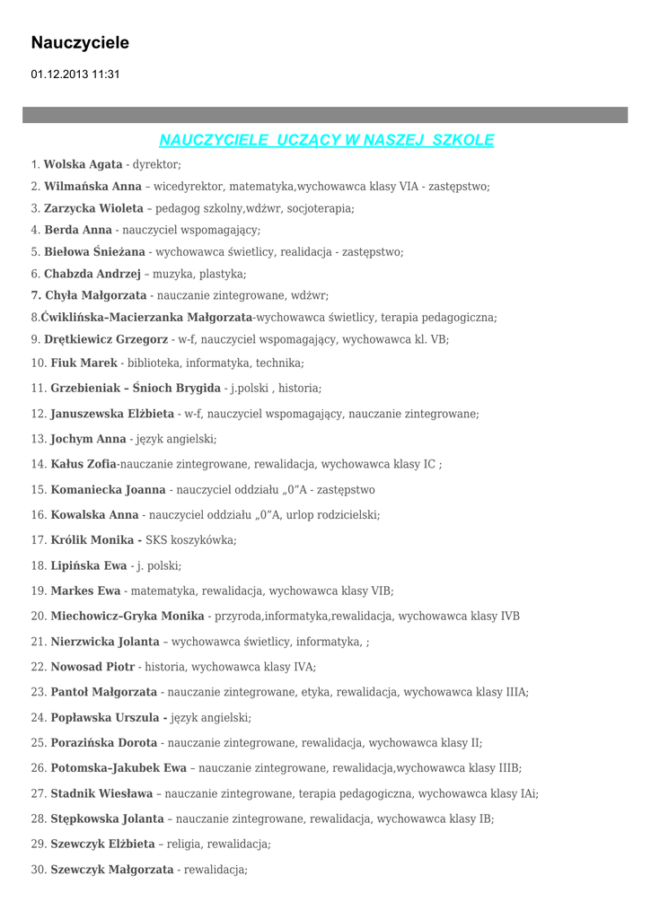 Nauczyciele 01.12.2013 11:31 NAUCZYCIELE UCZĄCY W NASZEJ SZKOLE 1. Wolska Agata - dyrektor; 2. Wilmańska Anna – wicedyrektor, matematyka,wychowawca klasy VIA - zastępstwo; 3. Zarzycka Wioleta – pedagog szkolny,wdżwr, socjoterapia; 4. Berda Anna - nauczyciel wspomagający; 5. Biełowa Śnieżana - wychowawca świetlicy, realidacja - zastępstwo; 6. Chabzda Andrzej – muzyka, plastyka; 7. Chyła Małgorzata - nauczanie zintegrowane, wdżwr; 8.Ćwiklińska–Macierzanka Małgorzata-wychowawca świetlicy, terapia pedagogiczna; 9. Drętkiewicz Grzegorz - w-f, nauczyciel wspomagający, wychowawca kl. VB; 10. Fiuk Marek - biblioteka, informatyka, technika; 11. Grzebieniak – Śnioch Brygida - j.polski , historia; 12. Januszewska Elżbieta - w-f, nauczyciel wspomagający, nauczanie zintegrowane; 13. Jochym Anna - język angielski; 14. Kałus Zofia-nauczanie zintegrowane, rewalidacja, wychowawca klasy IC ; 15. Komaniecka Joanna - nauczyciel oddziału „0”A - zastępstwo 16. Kowalska Anna - nauczyciel oddziału „0”A, urlop rodzicielski; 17. Królik Monika - SKS koszykówka; 18. Lipińska Ewa - j. polski; 19. Markes Ewa - matematyka, rewalidacja, wychowawca klasy VIB; 20. Miechowicz–Gryka Monika - przyroda,informatyka,rewalidacja, wychowawca klasy IVB 21. Nierzwicka Jolanta – wychowawca świetlicy, informatyka, ; 22. Nowosad Piotr - historia, wychowawca klasy IVA; 23. Pantoł Małgorzata - nauczanie zintegrowane, etyka, rewalidacja, wychowawca klasy IIIA; 24. Popławska Urszula - język angielski; 25. Porazińska Dorota - nauczanie zintegrowane, rewalidacja, wychowawca klasy II; 26. Potomska–Jakubek Ewa – nauczanie zintegrowane, rewalidacja,wychowawca klasy IIIB; 27. Stadnik Wiesława – nauczanie zintegrowane, terapia pedagogiczna, wychowawca klasy IAi; 28. Stępkowska Jolanta – nauczanie zintegrowane, rewalidacja, wychowawca klasy IB; 29. Szewczyk Elżbieta – religia, rewalidacja; 30. Szewczyk Małgorzata - rewalidacja; 31. Szwałkiewicz Karolina - j. polski, wychowawca kl. VA- zastępstwo; 32. Sztuba Adrianna - rewalidacja - zastępstwo; 33. Tokarzewicz Marta - nauczyciel wspomagający, ; 34. Zdanowicz Sławomir - technika, informatyka.