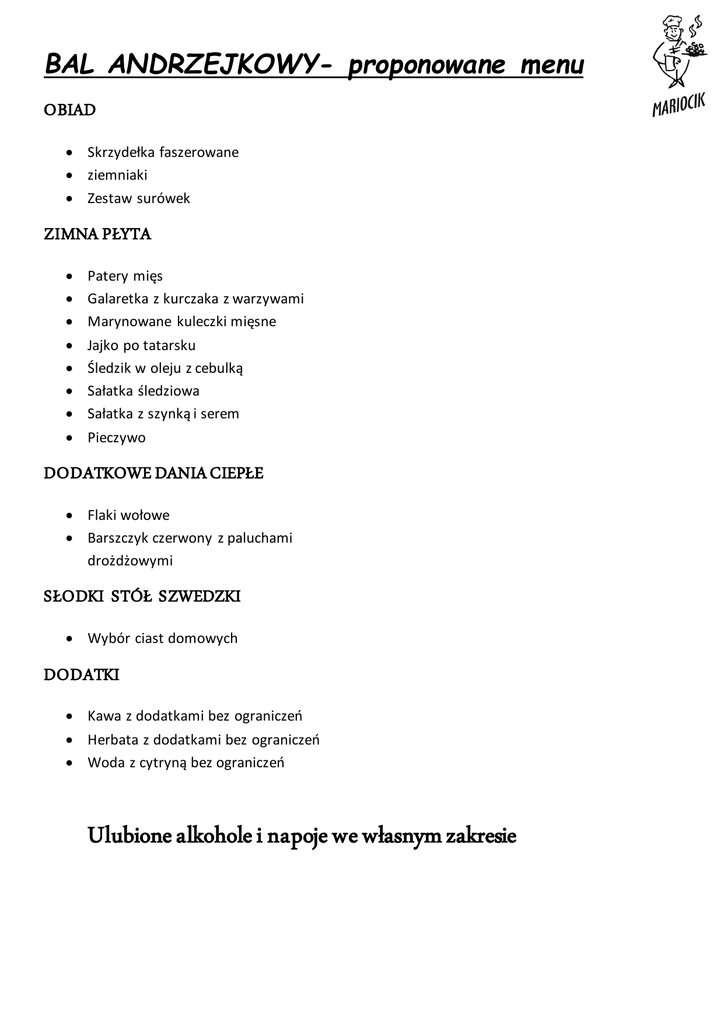 BAL ANDRZEJKOWY- proponowane menu OBIAD Skrzydełka faszerowane ziemniaki Zestaw surówek ZIMNA PŁYTA Patery mięs Galaretka z kurczaka z warzywami Marynowane kuleczki mięsne Jajko po tatarsku Śledzik w oleju z cebulką Sałatka śledziowa Sałatka z szynką i serem Pieczywo DODATKOWE DANIA CIEPŁE Flaki wołowe Barszczyk czerwony z paluchami drożdżowymi SŁODKI STÓŁ SZWEDZKI Wybór ciast domowych DODATKI Kawa z dodatkami bez ograniczeń Herbata z dodatkami bez ograniczeń Woda z cytryną bez ograniczeń Ulubione alkohole i napoje we własnym zakresie BAL ANDRZEJKOWY- proponowane menu OBIAD Skrzydełka faszerowane ziemniaki Zestaw surówek ZIMNA PŁYTA Patery mięs Galaretka z kurczaka z warzywami Marynowane kuleczki mięsne Jajko po tatarsku Śledzik w oleju z cebulką Sałatka śledziowa Sałatka z szynką i serem Pieczywo DODATKOWE DANIA CIEPŁE Flaki wołowe Barszczyk czerwony z paluchami drożdżowymi SŁODKI STÓŁ SZWEDZKI Wybór ciast domowych DODATKI Kawa z dodatkami bez ograniczeń Herbata z dodatkami bez ograniczeń Woda z cytryną bez ograniczeń Ulubione alkohole i napoje we własnym zakresie BAL ANDRZEJKOWY- proponowane menu OBIAD Skrzydełka faszerowane ziemniaki Zestaw surówek ZIMNA PŁYTA Patery mięs Galaretka z kurczaka z warzywami Marynowane kuleczki mięsne Jajko po tatarsku Śledzik w oleju z cebulką Sałatka śledziowa Sałatka z szynką i serem Pieczywo DODATKOWE DANIA CIEPŁE Flaki wołowe Barszczyk czerwony z paluchami drożdżowymi SŁODKI STÓŁ SZWEDZKI Wybór ciast domowych DODATKI Kawa z dodatkami bez ograniczeń Herbata z dodatkami bez ograniczeń Woda z cytryną bez ograniczeń Ulubione alkohole i napoje we własnym zakresie BAL ANDRZEJKOWY- proponowane menu OBIAD Skrzydełka faszerowane ziemniaki Zestaw surówek ZIMNA PŁYTA Patery mięs Galaretka z kurczaka z warzywami Marynowane kuleczki mięsne Jajko po tatarsku Śledzik w oleju z cebulką Sałatka śledziowa Sałatka z szynką i serem Pieczywo DODATKOWE DANIA CIEPŁE Flaki wołowe Barszczyk czerwony z paluchami drożdżowymi SŁODKI STÓŁ SZWEDZKI Wybór ciast domowych DODATKI Kawa z dodatkami bez ograniczeń Herbata z dodatkami bez ograniczeń Woda z cytryną bez ograniczeń Ulubione alkohole i napoje we własnym zakresie