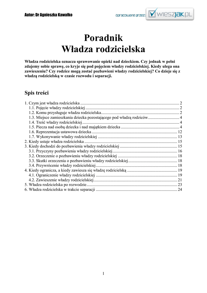 Autor: Dr Agnieszka Kawałko Poradnik Władza rodzicielska Władza rodzicielska oznacza sprawowanie opieki nad dzieckiem. Czy jednak w pełni zdajemy sobie sprawę, co kryje się pod pojęciem władzy rodzicielskiej. Kiedy ulega ona zawieszeniu? Czy rodzice mogą zostać pozbawieni władzy rodzicielskiej? Co dzieje się z władzą rodzicielską w czasie rozwodu i separacji. Spis treści 1. Czym jest władza rodzicielska ............................................................................................... 2 1.1. Pojęcie władzy rodzicielskiej .......................................................................................... 2 1.2. Komu przysługuje władza rodzicielska........................................................................... 2 1.3. Miejsce zamieszkania dziecka pozostającego pod władzą rodziców .............................. 4 1.4. Treść władzy rodzicielskiej ............................................................................................. 4 1.5. Piecza nad osobą dziecka i nad majątkiem dziecka ........................................................ 4 1.6. Reprezentacja ustawowa dziecka .................................................................................. 12 1.7. Wykonywanie władzy rodzicielskiej ............................................................................ 13 2. Kiedy ustaje władza rodzicielska ......................................................................................... 15 3. Kiedy dochodzi do pozbawienia władzy rodzicielskiej ....................................................... 15 3.1. Przyczyny pozbawienia władzy rodzicielskiej .............................................................. 16 3.2. Orzeczenie o pozbawieniu władzy rodzicielskiej ......................................................... 18 3.3. Skutki orzeczenia o pozbawieniu władzy rodzicielskiej ............................................... 18 3.4. Przywrócenie władzy rodzicielskiej .............................................................................. 18 4. Kiedy ogranicza, a kiedy zawiesza się władzę rodzicielską ................................................ 19 4.1. Ograniczenie władzy rodzicielskiej .............................................................................. 19 4.2. Zawieszenie władzy rodzicielskiej ................................................................................ 21 5. Władza rodzicielska po rozwodzie ....................................................................................... 23 6. Władza rodzicielska w trakcie separacji .............................................................................. 24 1 1. Czym jest władza rodzicielska 1.1. Pojęcie władzy rodzicielskiej Władza rodzicielska stanowi ogół obowiązków i praw względem dziecka, mających na celu zapewnienie mu należytej pieczy i strzeżenie jego interesów. Rodzice mają także względem dziecka prawa i obowiązki nie objęte władzą rodzicielską, nie stanowiące jej elementu, jak np. prawo do osobistej styczności z dzieckiem. Wykonywanie władzy rodzicielskiej nie sprowadza się jedynie do stosunków między rodzicami i dziećmi. Obejmuje również relacje jakie zachodzą pomiędzy rodzicami i osobami trzecimi, a także między rodzicami i państwem. Podstawowym celem wykonywania władzy rodzicielskiej jest zapewnienie dziecku jak najlepszych warunków życia i rozwoju, a także strzeżenie jego praw. 1.2. Komu przysługuje władza rodzicielska Władza rodzicielska rodziców powstaje najczęściej z mocy prawa na skutek urodzenia dziecka. Jednakże powstanie władzy rodzicielskiej może być następstwem orzeczenia sądu; tak jest w przypadku orzeczenia przez sąd przysposobienia. Na skutek orzeczenia o przysposobieniu władzę rodzicielską wobec dziecka przysposabianego nabywa lub nabywają przysposabiający oraz w przypadku sądowego ustalenia ojcostwa - ojciec, jeżeli sąd w wyroku ustalającym ojcostwo przyzna ojcu dziecka władzę rodzicielską. Władza rodzicielska może być przyznana ojcu dziecka przez sąd także po ustaleniu ojcostwa (art. 93 § 1 Kodeks rodzinny i opiekuńczy, dalej KRO). Władza rodzicielska może powstać również na skutek czynności prawnej; tj. w sytuacji, gdy mężczyzna niebędący mężem matki dokona uznania dziecka przed kierownikiem urzędu stanu cywilnego lub przed sądem opiekuńczym, a w przypadku uznawania za granicą – przed polskim konsulem lub osobą wyznaczoną do wykonywania funkcji konsula, o ile uznanie dotyczy dziecka, którego rodzice są obywatelami polskimi. W przypadku niebezpieczeństwa grożącego bezpośrednio życiu ojca lub dziecka możliwe jest dokonanie uznania dziecka przed notariuszem (art. 79 KRO). Dopuszczalne jest uznanie dziecka nawet nie urodzonego, jeżeli już zostało poczęte (art. 75 KRO). Jednakże w takiej sytuacji władza rodzicielska nie powstaje z chwila uznania dziecka, a dopiero z chwilą jego urodzenia. Zgodnie z art. 93 § 1 KRO co do zasady władza rodzicielska przysługuje obojgu rodzicom i to w takim samym zakresie niezależnie od tego, czy rodzice pozostają w związku małżeńskim. Jeżeli rodzice nie pozostają w związku małżeńskim każdemu z nich przysługuje władza rodzicielska w takim samym zakresie. Wyjątkowo, w przypadku sądowego ustalenia ojcostwa władza rodzicielska przysługuje ojcu dziecka tylko wtedy, gdy przyzna mu ją sąd w wyroku ustalającym ojcostwo. Sąd opiekuńczy może przyznać ojcu dziecka władzę rodzicielską także po ustaleniu ojcostwa. Przyjąć należy, że sąd może tego dokonać aż do chwili uzyskania przez dziecko pełnoletniości, gdyż ustawa nie określa terminu w ciągu którego powinno to nastąpić. Powierzenie władzy rodzicielskiej ojcu jest uzależnione od stwierdzenia przez sąd, że władza ta będzie wykonywana przez ojca dziecka tak, jak wymaga tego dobro dziecka i interes społeczny (wyrok SN z dnia 8 czerwca 2000 r., V 