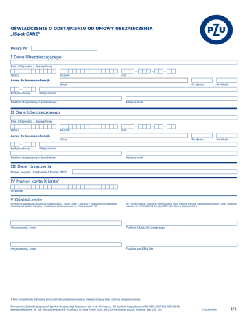 OŚWIADCZENIE O ODSTĄPIENIU OD UMOWY UBEZPIECZENIA „iSpot CARE” Polisa Nr I Dane Ubezpieczającego Imię i Nazwisko / Nazwa firmy – PESEL REGON – – NIP Adres do korespondencji: Ulica Nr domu Nr lokalu Nr domu Nr lokalu – Kod pocztowy Miejscowość Telefon stacjonarny / komórkowy Adres e-mail II Dane Ubezpieczonego Imię i Nazwisko / Nazwa firmy – PESEL REGON – – NIP Adres do korespondencji: Ulica – Kod pocztowy Miejscowość Telefon stacjonarny / komórkowy Adres e-mail III Dane Urządzenia Numer seryjny Urządzenia / Numer IMEI IV Numer konta Klienta 1 Nr konta V Oświadczenie Niniejszym odstępuję od Umowy ubezpieczenia „iSpot CARE”, zawartą z Powszechnym Zakładem Ubezpieczeń Spółką Akcyjną z siedzibą w Warszawie przy al. Jana Pawła II 24 , 00-133 Warszawa, do której zastosowanie mają Ogólne warunki ubezpieczenia iSpot CARE, ustalone uchwałą nr UZ/224/2014 Zarządu PZU SA z dnia 6 sierpnia 2014 r. Miejscowość, data Podpis Ubezpieczającego Miejscowość, data Podpis za PZU SA 1 Pole niezbędne do dokonania zwrotu składki ubezpieczeniowej za niewykorzystany okres ochrony ubezpieczeniowej . Powszechny Zakład Ubezpieczeń Spółka Akcyjna, Sąd Rejonowy dla m.st. Warszawy, XII Wydział Gospodarczy, KRS 9831, NIP 526-025-10-49, kapitał zakładowy: 86 352 300,00 zł wpłacony w całości, al. Jana Pawła II 24, 00-133 Warszawa, pzu.pl, infolinia: 801 102 102 PZU SA 9A41 1/1