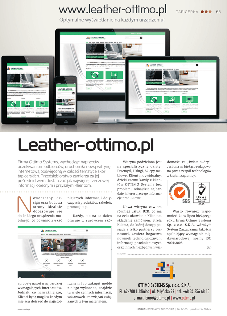 65 TA P ICERK A Leather-ottimo.pl Firma Ottimo Systems, wychodząc naprzeciw oczekiwaniom odbiorców, uruchomiła nową witrynę internetową poświęconą w całości tematyce skór tapicerskich. Przedsiębiorstwo zamierza za jej pośrednictwem dostarczać jak najwięcej rzeczowej informacji obecnym i przyszłym Klientom. owoczesny design oraz budowa strony idealnie dopasowuje się do każdego urządzenia mobilnego, co powinno zyskać N niejszych informacji dotyczących produktów, szkoleń, promocji itp. Każdy, kto na co dzień pracuje z surowcem skó- Witryna podzielona jest na specjalistyczne działy: Przemysł, Usługi, Sklepy meblowe, Klient indywidualny, dzięki czemu każdy z klientów OTTIMO Systems bez problemu odnajdzie najbardziej interesujące go informacje produktowe. Nowa witryna zawiera również usługi B2B, co ma na celu ułatwienie Klientom składanie zamówień. Strefa Klienta, do której dostęp posiadają tylko partnerzy biznesowi, zawiera bogactwo nowinek technologicznych, informacji poszkoleniowych oraz innych niezbędnych wia- domości ze „świata skóry”. Jest ona na bieżąco redagowana przez zespół technologów z kraju i zagranicy. Warto również wspomnieć, że w lipcu bieżącego roku firma Ottimo Systems Sp. z o.o. S.K.A. wdrożyła System Zarządzania Jakością spełniający wymagania międzynarodowej normy ISO 9001:2008. (łg) REKL AMA aprobatę nawet u najbardziej wymagających internautów. Jednak, co najważniejsze, Klienci będą mogli w każdym miejscu dotrzeć do najistotwww.mmia.pl rzanym lub zakupił meble z niego wykonane, znajdzie tu wiele cennych informacji, wskazówek i rozwiązań związanych z tym materiałem. OTTIMO SYSTEMS Sp. z o.o. S.K.A. PL 42-700 Lubliniec |ôSJô+ŨWŪQI?ôô| tel. +48 34 356 48 15 CK?GJô@GSPMMRRGKMNJô| www.MRRGKMNJ MEBLE MATERIAŁY I AKCESORIA | Nr 9/163 | październik 2014 r.