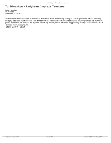 radio Toksyna FM - radio internetowe Tu Sthrashyn - Radykalna Impreza Taneczna Autor: szpalak 21.06.2012. Zmieniony 21.06.2012. Tu Polskie Radio Toksyna. Komunikat Redakcji Punk Rockowej. Uwaga! Dziś o godzinie 22:00 nadamy kolejny odcinek słuchowiska Tu S'thrash'yn pt. Radykalna impreza taneczna. W programie: od punka'77 przez hardcore do crusta, bo z punk rocka się nie wyrasta. Słuchać najgłośniej.Kiedy: 21 czerwiec 2012 Gdzie: www.toksyna.fm Start: 22:00 - 01:00 http://www.toksyna.fm Kreator PDF Utworzono 8 March, 2017, 17:00