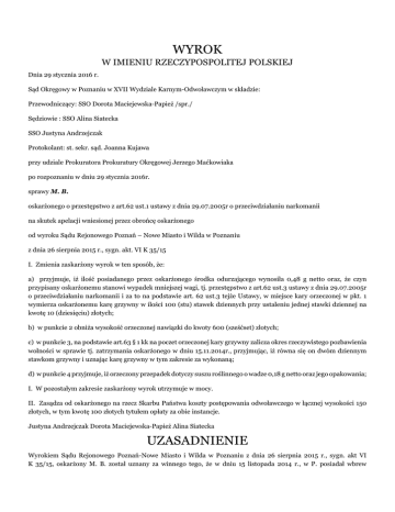 WYROK W IMIENIU RZECZYPOSPOLITEJ POLSKIEJ Dnia 29 stycznia 2016 r. Sąd Okręgowy w Poznaniu w XVII Wydziale Karnym-Odwoławczym w składzie: Przewodniczący: SSO Dorota Maciejewska-Papież /spr./ Sędziowie : SSO Alina Siatecka SSO Justyna Andrzejczak Protokolant: st. sekr. sąd. Joanna Kujawa przy udziale Prokuratora Prokuratury Okręgowej Jerzego Maćkowiaka po rozpoznaniu w dniu 29 stycznia 2016r. sprawy M. B. oskarżonego o przestępstwo z art.62 ust.1 ustawy z dnia 29.07.2005r o przeciwdziałaniu narkomanii na skutek apelacji wniesionej przez obrońcę oskarżonego od wyroku Sądu Rejonowego Poznań – Nowe Miasto i Wilda w Poznaniu z dnia 26 sierpnia 2015 r., sygn. akt. VI K 35/15 I. Zmienia zaskarżony wyrok w ten sposób, że: a) przyjmuje, iż ilość posiadanego przez oskarżonego środka odurzającego wynosiła 0,48 g netto oraz, że czyn przypisany oskarżonemu stanowi wypadek mniejszej wagi, tj. przestępstwo z art.62 ust.3 ustawy z dnia 29.07.2005r o przeciwdziałaniu narkomanii i za to na podstawie art. 62 ust.3 tejże Ustawy, w miejsce kary orzeczonej w pkt. 1 wymierza oskarżonemu karę grzywny w ilości 100 (stu) stawek dziennych przy ustaleniu jednej stawki dziennej na kwotę 10 (dziesięciu) złotych; b) w punkcie 2 obniża wysokość orzeczonej nawiązki do kwoty 600 (sześćset) złotych; c) w punkcie 3, na podstawie art.63 § 1 kk na poczet orzeczonej kary grzywny zalicza okres rzeczywistego pozbawienia wolności w sprawie tj. zatrzymania oskarżonego w dniu 15.11.2014r., przyjmując, iż równa się on dwóm dziennym stawkom grzywny i uznając karę grzywny w tym zakresie za wykonaną; d) w punkcie 4 przyjmuje, iż orzeczony przepadek dotyczy suszu roślinnego o wadze 0,18 g netto oraz jego opakowania; I. W pozostałym zakresie zaskarżony wyrok utrzymuje w mocy. II. Zasądza od oskarżonego na rzecz Skarbu Państwa koszty postępowania odwoławczego w łącznej wysokości 150 złotych, w tym kwotę 100 złotych tytułem opłaty za obie instancje. Justyna Andrzejczak Dorota Maciejewska-Papież Alina Siatecka UZASADNIENIE Wyrokiem Sądu Rejonowego Poznań-Nowe Miasto i Wilda w Poznaniu z dnia 26 sierpnia 2015 r., sygn. akt VI K 35/15, oskarżony M. B. został uznany za winnego tego, że w dniu 15 listopada 2014 r., w P. posiadał wbrew przepisom ustawy o przeciwdziałaniu narkomanii środek odurzający w postaci suszu roślinnego koloru brunatnozielonego (marihuany) o masie 0,76 g brutto, tj. popełnienia przestępstwa z art. 62 ust. 1 ustawy z dnia 29 lipca 2005 r. o przeciwdziałaniu narkomanii i za to orzeczono wobec niego karę 10 miesięcy pozbawienia wolności, zaś na poczet orzeczonej kary pozbawienia wolności zaliczono okres rzeczywistego pozbawienia wolności w sprawie tj. zatrzymania oskarżonego dnia 15 listopada 2014 r., zaokrąglając do pełnego dnia, przy czym przyjmując, że jeden dzień rzeczywistego pozbawienia wolności równa się jednemu dniowi kary pozbawienia wolności i w tym zakresie karę pozbawienia wolności uznano za wykonaną. Ponadto orzeczono wobec oskarżonego nawiązkę w wysokości 1000 zł na rzecz Stowarzyszenia (...) w P.. Tym samym wyrokiem orzeczono wobec oskarżonego przepadek zwitka papierowego z zawartością suszu roślinnego o wadze 0,76 grama brutto i zarządzono jego zniszczenie. O kosztach postępowania orzeczono w punkcie 5 wyroku (k. 153-154). Powyższe rozstrzygnięcie zostało w całości zaskarżone przez obrońcę oskarżonego M. B. (k. 178-181). Apelujący wniósł o zmianę zaskarżonego wyroku i wymierzenie oskarżonemu kary grzywny w wysokości 60 stawek dziennych po 10 zł każda. Sąd Okręgowy zważył co następuje: Apelacja obrońcy oskarżonego M. B. w dużej mierze zasługiwała na uwzględnienie. W pierwszej kolejności należy wskazać, iż nie budziła przede wszystkim wątpliwości prawidłowość poczynionych w niniejszej sprawie przez Sąd I instancji ustaleń faktycznych dotyczących postępowania oskarżonego – ustalenia te nie były (co do zasady) kwestionowane przez żadną ze stron. Jednakże jednocześnie Sąd I instancji nie dokonał starannej, zgodnej z wymaganiami art. 7 kpk oceny niektórych dowodów, mających istotne znaczenie dla rozstrzygnięcia. W związku z powyższym wątpliwości budzi zasadność wniosków wyprowadzonych przez Sąd Rejonowy ze zgromadzonego materiału dowodowego, w szczególności w zakresie ilości posiadanego przez M. B. środka odurzającego oraz oceny prawnej działania oskarżonego. W pierwszej kolejności należy wskazać iż Sąd Rejonowy dopuścił się pewnego błędu mającego wpływ na treść zaskarżonego orzeczenia. Bezspornym jest, że oskarżony posiadał środek odurzający w postaci suszu roślinnego koloru brunatno – zielonego (marihuany) o masie 0,76 g brutto. Okoliczność ta nie była kwestionowana również przez apelującego. Słusznie jednak obrońca podniósł, iż określenie ilości posiadanego przez oskarzonego narkotyku wartością wagi brutto było niewłaściwe. Waga opakowania, w którym znajduje się środek odurzający nie może być brana od uwagę, prowadziłoby to bowiem do wypaczeń (w zakresie rzeczywistej ilości narkotyku), co łatwo sobie wyobrazić w przypadku, gdy waga samego opakowania znacząco przewyższałaby wagę środka odurzającego. Jak wynika z analizy opinii biegłego – sprawozdania z badania chemiczno-toksykologicznego (k. 145-146) waga suszu roślinnego, który posiadał M. B. w rzeczywistości wynosiła 0,48 g netto, na co jednak nie zwrócił uwagi Sąd I instancji. Należy zważyć, że również sam oskarżony w swoich wyjaśnieniach kierował zastrzeżenia co do przyjętej w zarzucie wagi narkotyku, wskazujac, iż 0,76 g brutto obejmuje również opakowanie środka odurzajacego (k. 113, 148). Jako trafne należało również uznać zarzuty obrońcy oskarżonego kierowane wobec dokonanej przez Sąd I instancji oceny prawnej zachowania oskarżonego. Nie sposób podzielić stanowiska Sądu 