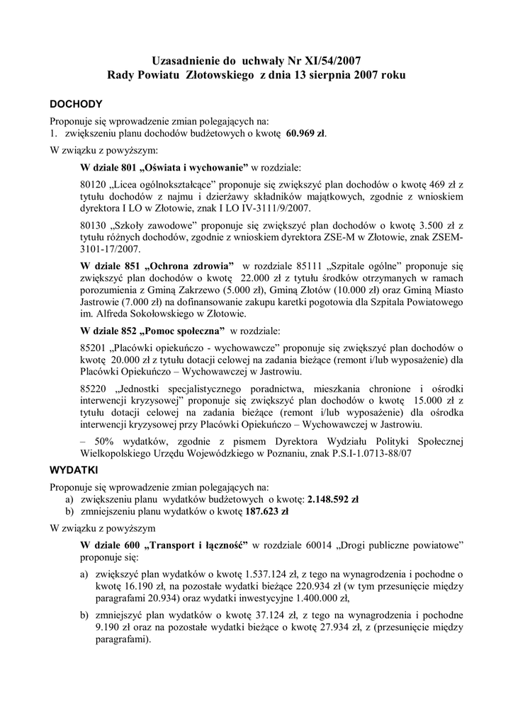 Uzasadnienie do uchwały Nr XI/54/2007 Rady Powiatu Złotowskiego z dnia 13 sierpnia 2007 roku DOCHODY Proponuje się wprowadzenie zmian polegających na: 1. zwiększeniu planu dochodów budżetowych o kwotę 60.969 zł. W związku z powyższym: W dziale 801 „Oświata i wychowanie” w rozdziale: 80120 „Licea ogólnokształcące” proponuje się zwiększyć plan dochodów o kwotę 469 zł z tytułu dochodów z najmu i dzierżawy składników majątkowych, zgodnie z wnioskiem dyrektora I LO w Złotowie, znak I LO IV-3111/9/2007. 80130 „Szkoły zawodowe” proponuje się zwiększyć plan dochodów o kwotę 3.500 zł z tytułu różnych dochodów, zgodnie z wnioskiem dyrektora ZSE-M w Złotowie, znak ZSEM3101-17/2007. W dziale 851 „Ochrona zdrowia” w rozdziale 85111 „Szpitale ogólne” proponuje się zwiększyć plan dochodów o kwotę 22.000 zł z tytułu środków otrzymanych w ramach porozumienia z Gminą Zakrzewo (5.000 zł), Gminą Złotów (10.000 zł) oraz Gminą Miasto Jastrowie (7.000 zł) na dofinansowanie zakupu karetki pogotowia dla Szpitala Powiatowego im. Alfreda Sokołowskiego w Złotowie. W dziale 852 „Pomoc społeczna” w rozdziale: 85201 „Placówki opiekuńczo - wychowawcze” proponuje się zwiększyć plan dochodów o kwotę 20.000 zł z tytułu dotacji celowej na zadania bieżące (remont i/lub wyposażenie) dla Placówki Opiekuńczo – Wychowawczej w Jastrowiu. 85220 „Jednostki specjalistycznego poradnictwa, mieszkania chronione i ośrodki interwencji kryzysowej” proponuje się zwiększyć plan dochodów o kwotę 15.000 zł z tytułu dotacji celowej na zadania bieżące (remont i/lub wyposażenie) dla ośrodka interwencji kryzysowej przy Placówki Opiekuńczo – Wychowawczej w Jastrowiu. – 50% wydatków, zgodnie z pismem Dyrektora Wydziału Polityki Społecznej Wielkopolskiego Urzędu Wojewódzkiego w Poznaniu, znak P.S.I-1.0713-88/07 WYDATKI Proponuje się wprowadzenie zmian polegających na: a) zwiększeniu planu wydatków budżetowych o kwotę: 2.148.592 zł b) zmniejszeniu planu wydatków o kwotę 187.623 zł W związku z powyższym W dziale 600 „Transport i łączność” w rozdziale 60014 „Drogi publiczne powiatowe” proponuje się: a) zwiększyć plan wydatków o kwotę 1.537.124 zł, z tego na wynagrodzenia i pochodne o kwotę 16.190 zł, na pozostałe wydatki bieżące 220.934 zł (w tym przesunięcie między paragrafami 20.934) oraz wydatki inwestycyjne 1.400.000 zł, b) zmniejszyć plan wydatków o kwotę 37.124 zł, z tego na wynagrodzenia i pochodne 9.190 zł oraz na pozostałe wydatki bieżące o kwotę 27.934 zł, z (przesunięcie między paragrafami). Zmiany wynikają z przesunięć środków między paragrafami wydatków na wniosek dyrektora Powiatowego Zarządu Dróg w Złotowie, znak PZD 3101/3P/535/2007 oraz ze zmian w planie wydatków majątkowych i bieżących. W dziale 750 „Administracja publiczna” w rozdziale: 75019 „Rady powiatów” proponuje się zmniejszyć plan wydatków bieżących o kwotę 6.000 zł (przesunięcie do rozdziału 75020) – zgodnie z wnioskiem Zarządu Powiatu, 75020 „Starostwa powiatowe” proponuje się zwiększyć plan wydatków o kwotę 23.000 zł, z tego 17.000 zł na wynagrodzenia i pochodne oraz 6.000 zł z przeznaczeniem na pozostałe wydatki. W dziale 754 „Bezpieczeństwo publiczne i ochrona przeciwpożarowa” w rozdziale 7504 „Komendy powiatowe Policji” proponuje się zmniejszyć plan wydatków bieżących o kwotę 5.000 zł (przesunięcie z rozdziału 75818) – na nagrodę dla odchodzącego Komendanta Powiatowego Policji. W dziale 758 „Różne rozliczenia” w rozdziale 75818 „Rezerwy ogólne i celowe” proponuje się zmniejszyć rezerwy celową o kwotę 59.444 zł z tego: z tytułu rezerwy na zabezpieczenie kredytu dla Szpitala Powiatowego 19.444 zł – spłata kredytu następuje zgodnie z harmonogramem oraz z rezerwy ogólnej 40.000 zł na zabezpieczenie wydatków Placówki Opiekuńczo – Wychowawczej w Jastrowiu (50% wkład własny – 35.000 zł) oraz na nagrodę dla odchodzącego Komendanta Powiatowego Policji (5.000 zł). W dziale 801 „Oświata i wychowanie” w rozdziale: 80102 „Szkoły podstawowe specjalne” proponuje się zmniejszyć plan wydatków bieżących o kwotę 1.336 zł (przesunięcie do rozdziału 85403) – zgodnie z wnioskiem Dyrektora Specjalnego Ośrodka Szkolno-Wychowawczego, 80111 „Gimnazja specjalne” proponuje się zmniejszyć plan wydatków bieżących o kwotę 1.267 zł (przesunięcie do rozdziału 85403) – zgodnie z wnioskiem Dyrektora Specjalnego Ośrodka Szkolno-Wychowawczego, 80120 „Licea ogólnokształcące” proponuje się: a) zwiększyć plan wydatków bieżących o kwotę 4.469 zł (zwiększenie – 469 przesunięcie między paragrafami – 4.000 zł), zł, b) zmniejszyć plan wydatków bieżących o kwotę 4.000 zł, z (przesunięcie między paragrafami). Zmiany wynikają z przesunięć środków między paragrafami wydatków oraz ze zwiększonych dochodów własnych – zgodnie z wnioskami dyrektora I LO w Złotowie, znak I LO IV-3111/9/2007, I LO IV-3111/10/2007, I LO IV-3111/11/2007. 80130 „Szkoły zawodowe” proponuje się: a) zwiększyć plan wydatków bieżących o kwotę 4.869 zł (zwiększenie – 3.500 przesunięcie między paragrafami – 1.369 zł), zł, b) zmniejszyć plan wydatków bieżących o kwotę 1.369 zł, z (przesunięcie między paragrafami). Zmiany wynikają ze zwiększonych dochodów oraz przesunięć środków między paragrafami wydatków na wniosek dyrektora ZSE-M w Złotowie, znak ZSEM-3101-16/2007 i ZSEM3101-17/2007. 2 80134 „Szkoły zawodowe specjalne” proponuje się zmniejszyć plan wydatków bieżących o kwotę 454 zł (przesunięcie do rozdziału 85403) – zgodnie z wnioskiem Dyrektora Specjalnego Ośrodka Szkolno-Wychowawczego, W dziale 851 „Ochrona zdrowia” w rozdziale 85111 „Szpitale ogólne” proponuje się zwiększyć plan wydatków o kwotę 22.000 zł z 