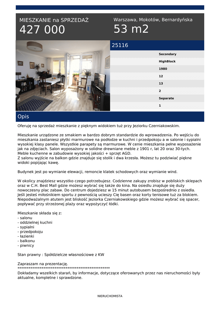 Warszawa, Mokotów, Bernardyńska MIESZKANIE na SPRZEDAŻ 53 m2 427 000 25116 Secondary HighBlock 1980 12 13 2 Separate 1 Opis Oferuję na sprzedaż mieszkanie z pięknym widokiem tuż przy Jeziorku Czerniakowskim. Mieszkanie urządzone ze smakiem w bardzo dobrym standardzie do wprowadzenia. Po wejściu do mieszkania zastaniesz płytki marmurowe na podłodze w kuchni i przedpokoju a w salonie i sypialni wysokiej klasy panele. Wszystkie parapety są marmurowe. W cenie mieszkania pełne wyposażenie jak na zdjęciach. Salon wyposażony w solidne drewniane meble z 1901 r, lat 20 oraz 30-tych. Meble kuchenne w zabudowie wysokiej jakości + sprzęt AGD. Z salonu wyjście na balkon gdzie znajduje się stolik i dwa krzesła. Możesz tu podziwiać piękne widoki popijając kawę. Budynek jest po wymianie elewacji, remoncie klatek schodowych oraz wymianie wind. W okolicy znajdziesz wszystko czego potrzebujesz. Codzienne zakupy zrobisz w pobliskich sklepach oraz w C.H. Best Mall gdzie możesz wybrać się także do kina. Na osiedlu znajduje się duży nowoczesny plac zabaw. Do centrum dojedziesz w 15 minut autobusem bezpośrednio z osiedla. Jeśli jesteś miłośnikiem sportu z pewnością ucieszy Cię basen oraz korty tenisowe tuż za blokiem. Niepodważalnym atutem jest bliskość Jeziorka Czerniakowskiego gdzie możesz wybrać się spacer, popływać przy strzeżonej plaży oraz wypożyczyć łódki. Mieszkanie składa się z: - salonu - oddzielnej kuchni - sypialni - przedpokoju - łazienki - balkonu - piwnicy Stan prawny : Spółdzielcze własnościowe z KW Zapraszam na prezentację. ************************************************** Dokładamy wszelkich starań, by informacje, dotyczące oferowanych przez nas nieruchomości były aktualne, kompletne i sprawdzone. NIERUCHOMISTA Więcej informacji na stronie: http://www.nieruchomista.waw.pl Nasza firma oferuje kompleksową obsługę transakcji i nieruchomości: - pomoc w uzyskaniu kredytu hipotecznego - pomoc przy finalizacji transakcji u dobrego notariusza - profesjonalny protokół zdawczo-odbiorczy - profesjonalne doradztwo w sprawach aranżacji wnętrz - bezpłatną wycenę kosztów remontu - promocyjne ceny remontów i przeprowadzek Prezentowane przez nas oferty nie stanowią oferty w rozumieniu Kodeksu Cywilnego. Treść oferty wraz ze zdjęciami objęta ochroną praw autorskich i pokrewnych na podstawie Ustawy z dnia 4 lutego 1994 (Dz. U. z 1994 r. Nr 24, poz. 83). Kopiowanie treści i zdjęć bez zgody ich twórcy podlega karze, określonej w art. 78 Ustawy. Mirosława Borowy tel. +48 602 736 555 email: [email protected] NIERUCHOMISTA Powered by TCPDF (www.tcpdf.org)
