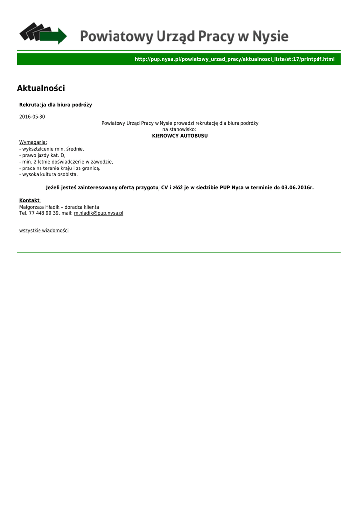 http://pup.nysa.pl/powiatowy_urzad_pracy/aktualnosci_lista/st:17/printpdf.html Aktualności Rekrutacja dla biura podróży 2016-05-30 Powiatowy Urząd Pracy w Nysie prowadzi rekrutację dla biura podróży na stanowisko: KIEROWCY AUTOBUSU Wymagania: - wykształcenie min. średnie, - prawo jazdy kat. D, - min. 2 letnie doświadczenie w zawodzie, - praca na terenie kraju i za granicą, - wysoka kultura osobista. Jeżeli jesteś zainteresowany ofertą przygotuj CV i złóż je w siedzibie PUP Nysa w terminie do 03.06.2016r. Kontakt: Małgorzata Hładik – doradca klienta Tel. 77 448 99 39, mail: [email protected] wszystkie wiadomości