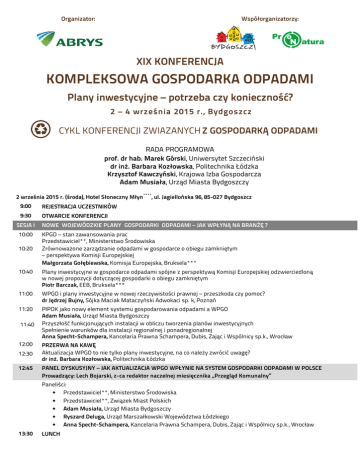 Organizator: Współorganizatorzy: XIX KONFERENCJA KOMPLEKSOWA GOSPODARKA ODPADAMI Plany inwestycyjne – potrzeba czy konieczność? 2 – 4 września 2015 r., Bydgoszcz CYKL KONFERENCJI ZWIAZANYCH Z GOSPODARKĄ ODPADAMI RADA PROGRAMOWA prof. dr hab. Marek Górski, Uniwersytet Szczeciński dr inż. Barbara Kozłowska, Politechnika Łódzka Krzysztof Kawczyński, Krajowa Izba Gospodarcza Adam Musiała, Urząd Miasta Bydgoszczy 2 września 2015 r. (środa), Hotel Słoneczny Młyn 9:00 REJESTRACJA UCZESTNIKÓW 9:30 OTWARCIE KONFERENCJI SESJA I 10:00 10:20 **** , ul. Jagiellońska 96, 85-027 Bydgoszcz NOWE WOJEWÓDZKIE PLANY GOSPODARKI ODPADAMI – JAK WPŁYNĄ NA BRANŻĘ ? KPGO – stan zawansowania prac Przedstawiciel**, Ministerstwo Środowiska Zrównoważone zarządzanie odpadami w gospodarce o obiegu zamkniętym – perspektywa Komisji Europejskiej Małgorzata Gołębiewska, Komisja Europejska, Bruksela*** 10:40 Plany inwestycyjne w gospodarce odpadami spójne z perspektywą Komisji Europejskiej odzwierciedloną w nowej propozycji dotyczącej gospodarki o obiegu zamkniętym Piotr Barczak, EEB, Bruksela*** 11:00 WPGO i plany inwestycyjne w nowej rzeczywistości prawnej – przeszkoda czy pomoc? dr Jędrzej Bujny, Sójka Maciak Mataczyński Adwokaci sp. k, Poznań 11:20 PIPOK jako nowy element systemu gospodarowania odpadami a WPGO Adam Musiała, Urząd Miasta Bydgoszczy Przyszłość funkcjonujących instalacji w obliczu tworzenia planów inwestycyjnych Spełnienie warunków dla instalacji regionalnej i ponadregionalnej Anna Specht-Schampera, Kancelaria Prawna Schampera, Dubis, Zając i Wspólnicy sp.k., Wrocław 11:40 12:00 12:30 12:45 PRZERWA NA KAWĘ Aktualizacja WPGO to nie tylko plany inwestycyjne, na co należy zwrócić uwagę? dr inż. Barbara Kozłowska, Politechnika Łódzka PANEL DYSKUSYJNY – JAK AKTUALIZACJA WPGO WPŁYNIE NA SYSTEM GOSPODARKI ODPADAMI W POLSCE Prowadzący: Lech Bojarski, z-ca redaktor naczelnej miesięcznika „Przegląd Komunalny” Paneliści: • Przedstawiciel**, Ministerstwo Środowiska • Przedstawiciel**, Związek Miast Polskich • Adam Musiała, Urząd Miasta Bydgoszczy • Ryszard Deluga, Urząd Marszałkowski Województwa Łódzkiego • Anna Specht-Schampera, Kancelaria Prawna Schampera, Dubis, Zając i Wspólnicy sp.k., Wrocław 13:30 LUNCH SESJA II 14:20 14:40 15:00 15:15 15:35 15:50 RYNEK NA ZAKRĘCIE? PRZETWARZAĆ, SPALAĆ, A MOŻE… Zakład Termicznego Przekształcania Odpadów Komunalnych – znaczenie dla regionalnej gospodarki odpadami Tomasz Gulczewski, Międzygminny Kompleks Unieszkodliwiania Odpadów ProNatura Sp. z o.o., Bydgoszcz Zrównoważone gospodarowanie odpadami – istniejące przepisy prawne a realia i ekonomia Agnieszka Spodzieja, EQUIPO Sp. z o. o., Łódź Recykling i odzysk tworzyw sztucznych w świetle "Circular Economy" Kazimierz Borkowski, PlasticsEurope Polska, Warszawa Proces fermentacji odpadów biodegradowalnych selektywnie zbieranych oraz odpadów zielonych Waldemar Witkowski, Eggersmann Anlagenbau Kompoferm Polska Sp. z o.o., Wągrowiec Naprawa szkody w środowisku na podstawie wybranych decyzji RDOŚ Paweł Holnicki-Szulc, AIG Environmental Liability Europe, Warszawa Zasada „close loop” – nowy trend w Europie Hanna Marlière, Envi-Pro, Poznań 16:10 Pytania i dyskusja 16:20 PRZERWA NA KAWĘ SESJA III JAK ZWIĘKSZYĆ EFEKTYWNOŚĆ RIPOK? Doświadczenia w zakresie biologicznego przetwarzania odpadów komunalnych w RZUOK w Machnaczu 16:45 – wprowadzenie do wyjazdu technicznego Violetta Sartanowicz, Przedsiębiorstwo Gospodarki Komunalnej „SANIKO”, Włocławek 17:05 Pierwszy krok w procesie efektywnej obróbki odpadów na przykładzie ZUOK Olsztyn Łukasz Birecki, Agrex-Eco Sp. z o.o., Warszawa 17:15 System unieszkodliwiania odpadów dla gmin objętych Porozumieniem wraz z budową Zakładu Zagospodarowania Odpadów w Lulkowie Edmund Młodzikowski, URBIS Spółka z o.o., Gniezno Prowadzenie procesu biostabilizacji lub kompostowania w różnych wariantach technologicznych na przykładzie wybranych instalacji Przedstawiciel, AK Nova, Poznań 17:35 17:45 Rozbudowa instalacji MBP o moduł fermentacji metanowej – wyzwania i szanse Jacek Chrząstek, STRABAG Umwelttechnik GmbH, Drezno 17:55 Rozbudowa i modernizacja Zakładu Unieszkodliwiania Odpadów Komunalnych w Puławach Tomasz Wadas, Zakład Usług Komunalnych Sp. z o.o., Puławy 18:15 Pytania i dyskusja. Podsumowanie dnia 20:00 KOLACJA BIESIADNA W DWORZE HULANKA Dwór przenosi swoich Gości w bajkowy świat, a niewiasty i panów wielce smakowitą kuchnią kusi. Jak okoliczna wieść niesie odbywają się tutaj biesiady, na których króluje tradycyjna polska kuchnia, a strawy nigdy nie zabraknie. 3 września 2015 r. (czwartek) SESJA IV 9:30 9:50 10:00 10:20 10:30 JAK ZWIĘKSZYĆ EFEKTYWNOŚĆ RIPOK ? – CD Narzędzia informatyczne wspomagające system zarządzania odpadami Ewelina Nartowska, Urząd Miasta Kielce Zintegrowany system informatyczny dla zakładów gospodarki odpadami – efektywne zarządzanie zasobami Wojciech Stefaniak, Unisoft Sp. z o.o., Gdynia Optymalny system zarządzania gospodarką odpadami komunalnymi – na podstawie dwuletnich doświadczeń Adam Rogaliński, Urząd Miasta Kielce Przegląd doświadczeń austriackiej firmy w obszarze kompleksowej gospodarki odpadami – prezentacja sprawdzonych i skutecznych rozwiązań wykorzystanych w urządzeniach produkowanych przez IFE Jarosław Dąbrowski, IFE Aufbereitungstechnik GmbH, Wągrowiec Neutralizacja substancji szkodliwych i złowonnych Marek Szatkowski, WESTRAND Sp. J., Warszawa 10:40 Pytania i dyskusja 10:55 PRZERWA NA KAWĘ SESJA V NOWY BAT I BREF – JAKI BĘDĄ MIAŁY WPŁYW NA FUNKCJOMUJĄCE ZAKŁADY I PLANOWANE INWESTYCJE 11:20 11:40 12:00 System planowania w gospodarowaniu odpadami w ustawodawstwie polskim prof. dr hab. Marek Górski, Uniwersytet Szczeciński Rewizja dokumentów referencyjnych BAT (NDT) dla przetwarzania i termicznego przekształcania odpadów – prace