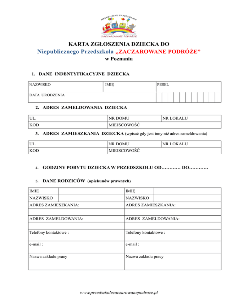 karta zgłoszeniowa - Niepubliczne Przedszkole Zaczarowane Podróże