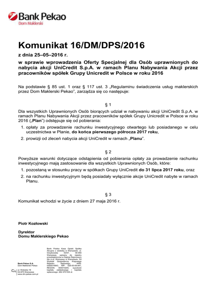 Komunikat 16/DM/DPS/2016 z dnia 25–05–2016 r. w sprawie wprowadzenia Oferty Specjalnej dla Osób uprawnionych do nabycia akcji UniCredit S.p.A. w ramach Planu Nabywania Akcji przez pracowników spółek Grupy Unicredit w Polsce w roku 2016 Na podstawie § 85 ust. 1 oraz § 117 ust. 3 „Regulaminu świadczenia usług maklerskich przez Dom Maklerski Pekao”, zarządza się co następuje: §1 Dla wszystkich Uprawnionych Osób biorących udział w nabywaniu akcji UniCredit S.p.A. w ramach Planu Nabywania Akcji przez pracowników spółek Grupy Unicredit w Polsce w roku 2016 („Plan”) odstępuje się od pobierania: 1. opłaty za prowadzenie rachunku inwestycyjnego otwartego lub posiadanego w celu uczestnictwa w Planie, do końca pierwszego półrocza 2017 roku, 2. prowizji od zleceń nabycia akcji UniCredit w ramach „Planu”. §2 Powyższe warunki dotyczące odstąpienia od pobierania opłaty za prowadzenie rachunku inwestycyjnego mają zastosowanie dla wszystkich Uprawnionych Osób, które: 1. pozostaną w stosunku pracy w spółkach Grupy UniCredit do 31 lipca 2017 roku, oraz 2. na rachunku inwestycyjnym będą posiadały wyłącznie akcje UniCredit nabyte w ramach Planu. §3 Komunikat wchodzi w życie z dniem 27 maja 2016 r. Piotr Kozłowski Dyrektor Domu Maklerskiego Pekao Bank Pekao S.A. Dom Maklerski Pekao ul. Wołoska 18 02-675 Warszawa www.dm.pekao.com.pl Bank Polska Kasa Opieki Spółka Akcyjna z siedzibą w Warszawie, ul. Grzybowska 53/57, 00-950 Warszawa, wpisany do rejestru przedsiębiorców w Sądzie Rejonowym dla m.st. Warszawy w Warszawie, XII Wydział Gospodarczy Krajowego Rejestru Sądowego, KRS: 0000014843, NIP: 526-00-06-841, REGON: 000010205, wysokość kapitału zakładowego i kapitału wpłaconego: 262 470 034 zł.