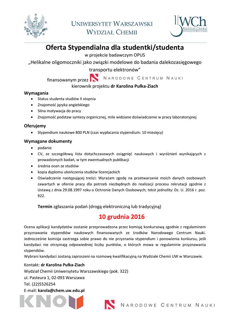 Oferta Stypendialna dla studentki/studenta w projekcie badawczym OPUS „Helikalne oligomoczniki jako związki modelowe do badania dalekozasięgowego transportu elektronów” finansowanym przez kierownik projektu dr Karolina Pułka-Ziach Wymagania     Status studenta studiów II stopnia Znajomość języka angielskiego Silna motywacja do pracy Znajomość podstaw syntezy organicznej, mile widziane doświadczenie w pracy laboratoryjnej Oferujemy  Stypendium naukowe 800 PLN (czas wypłacania stypendium: 10 miesięcy) Wymagane dokumenty      podanie CV, ze szczegółową lista dotychczasowych osiągnięć naukowych i wyróżnień wynikających z prowadzonych badań, w tym ewentualnych publikacji średnia ocen ze studiów kopia dyplomu ukończenia studiów licencjackich Oświadczenie następującej treści: Wyrażam zgodę na przetwarzanie moich danych osobowych zawartych w ofercie pracy dla potrzeb niezbędnych do realizacji procesu rekrutacji zgodnie z Ustawą z dnia 29.08.1997 roku o Ochronie Danych Osobowych; tekst jednolity: Dz. U. 2016 r. poz. 922. Termin zgłaszania podań (drogą elektroniczną lub tradycyjną) 10 grudnia 2016 Ocena aplikacji kandydatów zostanie przeprowadzona przez komisję konkursową zgodnie z regulaminem przyznawania stypendiów naukowych finansowanych ze środków Narodowego Centrum Nauki. Jednocześnie komisja zastrzega sobie prawo do nie przyznania stypendium i ponowienia konkursu, jeśli kandydaci nie otrzymają odpowiedniej liczby punktów, o których mowa w regulaminie przyznawania stypendiów. Wybrani kandydaci zostaną zaproszeni na rozmowę kwalifikacyjną na Wydziale Chemii UW w Warszawie. Kontakt: dr Karolina Pułka-Ziach Wydział Chemii Uniwersytetu Warszawskiego (pok. 322) ul. Pasteura 1, 02-093 Warszawa Tel. (22)5526254 E-mail: [email protected]