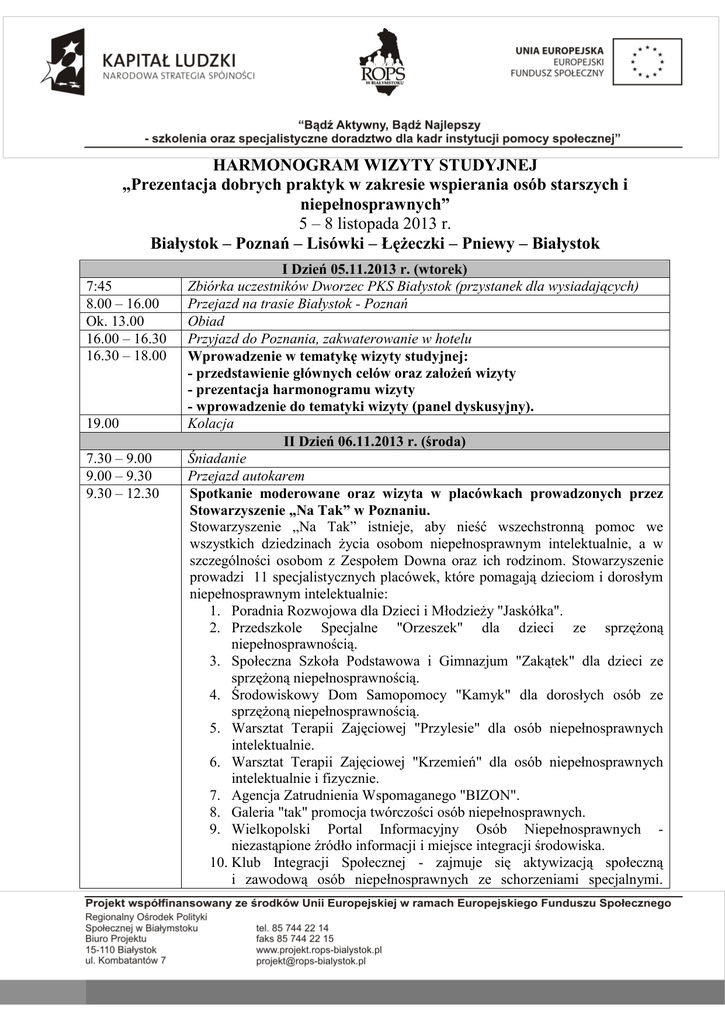 HARMONOGRAM WIZYTY STUDYJNEJ „Prezentacja dobrych praktyk w zakresie wspierania osób starszych i niepełnosprawnych” 5 – 8 listopada 2013 r. Białystok – Poznań – Lisówki – Łężeczki – Pniewy – Białystok 7:45 8.00 – 16.00 Ok. 13.00 16.00 – 16.30 16.30 – 18.00 19.00 7.30 – 9.00 9.00 – 9.30 9.30 – 12.30 I Dzień 05.11.2013 r. (wtorek) Zbiórka uczestników Dworzec PKS Białystok (przystanek dla wysiadających) Przejazd na trasie Białystok - Poznań Obiad Przyjazd do Poznania, zakwaterowanie w hotelu Wprowadzenie w tematykę wizyty studyjnej: - przedstawienie głównych celów oraz założeń wizyty - prezentacja harmonogramu wizyty - wprowadzenie do tematyki wizyty (panel dyskusyjny). Kolacja II Dzień 06.11.2013 r. (środa) Śniadanie Przejazd autokarem Spotkanie moderowane oraz wizyta w placówkach prowadzonych przez Stowarzyszenie „Na Tak” w Poznaniu. Stowarzyszenie „Na Tak” istnieje, aby nieść wszechstronną pomoc we wszystkich dziedzinach życia osobom niepełnosprawnym intelektualnie, a w szczególności osobom z Zespołem Downa oraz ich rodzinom. Stowarzyszenie prowadzi 11 specjalistycznych placówek, które pomagają dzieciom i dorosłym niepełnosprawnym intelektualnie: 1. Poradnia Rozwojowa dla Dzieci i Młodzieży "Jaskółka". 2. Przedszkole Specjalne "Orzeszek" dla dzieci ze sprzężoną niepełnosprawnością. 3. Społeczna Szkoła Podstawowa i Gimnazjum "Zakątek" dla dzieci ze sprzężoną niepełnosprawnością. 4. Środowiskowy Dom Samopomocy "Kamyk" dla dorosłych osób ze sprzężoną niepełnosprawnością. 5. Warsztat Terapii Zajęciowej "Przylesie" dla osób niepełnosprawnych intelektualnie. 6. Warsztat Terapii Zajęciowej "Krzemień" dla osób niepełnosprawnych intelektualnie i fizycznie. 7. Agencja Zatrudnienia Wspomaganego "BIZON". 8. Galeria "tak" promocja twórczości osób niepełnosprawnych. 9. Wielkopolski Portal Informacyjny Osób Niepełnosprawnych niezastąpione źródło informacji i miejsce integracji środowiska. 10. Klub Integracji Społecznej - zajmuje się aktywizacją społeczną i zawodową osób niepełnosprawnych ze schorzeniami specjalnymi. Zespół składa się z wykwalifikowanych specjalistów zajmujących się rozwojem osobistym, zawodowym oraz odnajdywaniem rozwiązań w sytuacjach trudnych. 11. Dom Krótkiego Pobytu (w budowie) - pewnego rodzaju hotel, w którym będzie można na jakiś określony czas – np. max 1 miesiąca, umieścić osobę niepełnosprawną, zapewniając jej fachową opiekę, dostosowaną do stopnia i rodzaju jej niepełnosprawności. Ośrodek będzie oferował opiekę w sytuacjach nagłych (np. pobyt opiekuna w szpitalu) jak i planowych (np. wyjazd rodziny na wakacje z pozostałymi dziećmi). Prezentacja poszczególnych placówek. 12.30 – 13.30 13.30 – 14.30 14.30 – 15.00 15.00 - 18.00 18.00 – 18.30 19:00 7.30 – 9.00 9.00 – 9.30 9.30 – 12.30 12.30 – 13.15 13.15 – 14.30 14.30 – 14.45 14.45 – 15.45 15.45 - 16.00 16.00 – 19.00 Przejazd autokarem Obiad Przejazd autokarem Ciąg dalszy spotkania moderowanego w Stowarzyszeniu „Na Tak” w Poznaniu. Prezentacja placówek. Panel dyskusyjny. Powrót do hotelu Kolacja III Dzień 07.11.2013 r. (czwartek) Śniadanie Przejazd autokarem Wizyta w Domu Pomocy Społecznej w Lisówkach. Dom Pomocy Społecznej w Lisówkach jako placówka o zasięgu ponadlokalnym, spełniająca standard określony w przepisach Ministerstwa Pracy i Polityki Społecznej przeznaczony jest dla 100 osób w podeszłym wieku. Prezentacja placówki. Panel dyskusyjny. Przejazd autokarem Wizyta w Domu Pomocy Społecznej w Łężeczkach Dom Pomocy Społecznej w Łężeczkach jest jednostką organizacyjną samorządu terytorialnego podległą Starostwu Powiatowemu w Międzychodzie. Istnieje od grudnia 1996r. i przeznaczony jest dla 135 mieszkańców, zarówno kobiet jak i mężczyzn. Służy osobom starszym, które z powodów zdrowotnych, socjalnych bądź bytowych nie mogą przebywać w środowisku. Prezentacja placówki. Panel dyskusyjny. Przejazd autokarem Obiad Przejazd autokarem Wizyta w Ośrodku Pomocy Społecznej w Pniewach. Ośrodek od 20 lat prowadzi Dzienny Dom Seniora, który realizuje szereg działań na rzecz osób starszych. Dom jest prowadzony w dniach tygodnia od poniedziałku do piątku w godzinach od 10.00 do 18.00. Seniorzy Domu są uczestnikami i współorganizatorami wielu licznych imprez okolicznościowych, np. Powitanie Lata, Dnia Dziecka, Dnia Matki. Prezentacja działalności Ośrodka w zakresie wspierania osób starszych i niepełnosprawnych. Panel dyskusyjny. 19.00 – 19.30 Powrót do hotelu 20.00 Kolacja IV Dzień 08.11.2013 r. (piątek) 7:30 – 9.00 Śniadanie, wykwaterowanie z hotelu 9.00 – 17.00 Przejazd na trasie Poznań - Białystok Ok. 13.00 Obiad 17.00/17.30 Przyjazd do Białegostoku Dworzec PKS Białystok (przystanek dla wysiadających) W trakcie wizyty harmonogram może ulec zmianie!!!