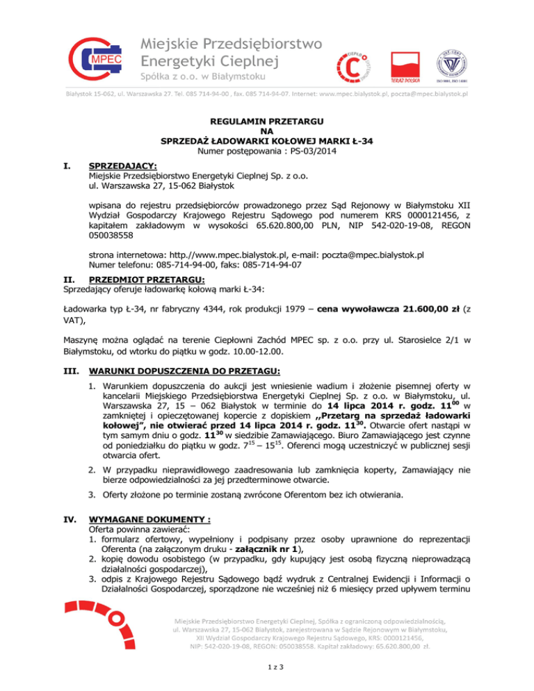 REGULAMIN PRZETARGU NA SPRZEDAŻ ŁADOWARKI KOŁOWEJ MARKI Ł-34 Numer postępowania : PS-03/2014 I. SPRZEDAJACY: Miejskie Przedsiębiorstwo Energetyki Cieplnej Sp. z o.o. ul. Warszawska 27, 15-062 Białystok wpisana do rejestru przedsiębiorców prowadzonego przez Sąd Rejonowy w Białymstoku XII Wydział Gospodarczy Krajowego Rejestru Sądowego pod numerem KRS 0000121456, z kapitałem zakładowym w wysokości 65.620.800,00 PLN, NIP 542-020-19-08, REGON 050038558 strona internetowa: http.//www.mpec.bialystok.pl, e-mail: [email protected] Numer telefonu: 085-714-94-00, faks: 085-714-94-07 II. PRZEDMIOT PRZETARGU: Sprzedający oferuje ładowarkę kołową marki Ł-34: Ładowarka typ Ł-34, nr fabryczny 4344, rok produkcji 1979 – cena wywoławcza 21.600,00 zł (z VAT), Maszynę można oglądać na terenie Ciepłowni Zachód MPEC sp. z o.o. przy ul. Starosielce 2/1 w Białymstoku, od wtorku do piątku w godz. 10.00-12.00. III. WARUNKI DOPUSZCZENIA DO PRZETAGU: 1. Warunkiem dopuszczenia do aukcji jest wniesienie wadium i złożenie pisemnej oferty w kancelarii Miejskiego Przedsiębiorstwa Energetyki Cieplnej Sp. z o.o. w Białymstoku, ul. Warszawska 27, 15 – 062 Białystok w terminie do 14 lipca 2014 r. godz. 1100 w zamkniętej i opieczętowanej kopercie z dopiskiem ,,Przetarg na sprzedaż ładowarki kołowej”, nie otwierać przed 14 lipca 2014 r. godz. 1130. Otwarcie ofert nastąpi w tym samym dniu o godz. 1130 w siedzibie Zamawiającego. Biuro Zamawiającego jest czynne od poniedziałku do piątku w godz. 715 – 1515. Oferenci mogą uczestniczyć w publicznej sesji otwarcia ofert. 2. W przypadku nieprawidłowego zaadresowania lub zamknięcia koperty, Zamawiający nie bierze odpowiedzialności za jej przedterminowe otwarcie. 3. Oferty złożone po terminie zostaną zwrócone Oferentom bez ich otwierania. IV. WYMAGANE DOKUMENTY : Oferta powinna zawierać: 1. formularz ofertowy, wypełniony i podpisany przez osoby uprawnione do reprezentacji Oferenta (na załączonym druku - załącznik nr 1), 2. kopię dowodu osobistego (w przypadku, gdy kupujący jest osobą fizyczną nieprowadzącą działalności gospodarczej), 3. odpis z Krajowego Rejestru Sądowego bądź wydruk z Centralnej Ewidencji i Informacji o Działalności Gospodarczej, sporządzone nie wcześniej niż 6 miesięcy przed upływem terminu 1z3 do składania ofert (w przypadku, gdy kupujący jest przedsiębiorcą bądź innym podmiotem wpisanym do Krajowego Rejestru Sądowego), 4. dowód wniesienia wadium. V. OPIS SPOSOBU PRZYGOTOWYWANIA OFERT: 1. Kupujący ma prawo złożyć tylko jedną ofertę. Złożenie większej liczby ofert lub złożenie oferty zawierającej propozycje alternatywne spowoduje odrzucenie wszystkich ofert złożonych przez Kupującego. 2. Kupujący przedstawiają ofertę zgodnie z wymogami określonymi w niniejszym Regulaminie, na Formularzu ofertowym stanowiącym załącznik nr 1. 3. W przypadku złożenia przez Kupującego oferty kształtującej się poniżej wymaganej ceny minimalnej, zostanie ona odrzucona. 4. Cenę należy podać w polskich złotych z dokładnością do dwóch miejsc po przecinku. 5. Ofertę należy złożyć w zamkniętej kopercie, zapieczętowanej w sposób gwarantujący zachowanie w poufności jej treści oraz zabezpieczającej jej nienaruszalność do terminu otwarcia ofert. 6. Termin związania ofertą wynosi 30 dni licząc od upływu terminu składania ofert. VI. WADIUM 1. Składana oferta musi być zabezpieczona wadium w wysokości 3 000,00 zł. 2. Wadium w formie pieniężnej należy wnieść na rachunek bankowy sprzedającego BNP Paribas Bank Polska SA nr 06 1600 1462 1846 1604 9000 0001 z dopiskiem: ,,Oferta na zakup ładowarki kołowej”. Wymagane jest dołączenie do oferty kserokopii dowodu przelewu. 3. Wniesienie wadium w pieniądzu będzie skuteczne, jeżeli najpóźniej na dzień przed otwarciem ofert, środki pieniężne znajdą się na rachunku bankowym MPEC Sp. z o.o. 4. Oferent, który nie wniesie wadium lub nie zabezpieczy oferty akceptowalną formą wadium, zostanie wykluczony z postępowania, a jego oferta zostanie uznana za odrzuconą. 5. Wadium wniesione w pieniądzu przez uczestnika przetargu, który wygrał przetarg, zostanie naliczone na poczet ceny. 6. Oferent traci wadium, gdy: a) odmówił podpisania umowy na warunkach określonych w ofercie, b) zawarcie umowy stało się niemożliwe z przyczyn leżących po stronie Oferenta. 7. Sprzedający zwraca wadium niezwłocznie, jeżeli: a) upłynął termin związania ofertą, b) zawarto umowę z innym Oferentem, c) przetarg został odwołany przez Sprzedającego, 8. Wadium zwraca się niezwłocznie na wniosek Oferenta: a) który wycofał ofertę przed upływem terminu składania ofert, b) który został wykluczony z przetargu, c) którego oferta została odrzucona. VII. ROZPATRZENIE OFERT I WYBÓR OFERENTA: 1. Otwarcie ofert ma charakter jawny. 2. W trakcie otwarcia ofert odczytywana jest: nazwa/nazwisko kupującego, oferowana cena. 3. Komisja przetargowa prowadzi postępowanie w następujący sposób: 2z3 przedstawia skład osobowy Komisji, okazuje otrzymane oferty i stwierdza fakt ich nienaruszenia, otwiera koperty z ofertami, dokonuje szczegółowej analizy i oceny ofert, wybiera ofertę, która posiada najwyższą cenę, sporządza protokół z przebiegu przetargu, który podlega zatwierdzeniu przez Zarząd Spółki. 4. Jedynym kryterium wyboru oferty jest zaproponowana cena. 5. W przypadku, gdy wpłyną dwie lub więcej ofert na tę samą cenę, Sprzedający wzywa Kupujących, którzy złożyli te oferty, do złożenia w wyznaczonym terminie ofert dodatkowych. 6. Niezwłocznie po zakończeniu postępowania, Zamawiający powiadomi Oferenta, który złożył najkorzystniejszą ofertę. VIII. POSTANOWIENIA KOŃCOWE 1. Zamawiający zastrzega sobie prawo odwołania przetargu bez podania przyczyn a następnie podjęcia rozmów z jednym Kupującym, jak również zmiany treści ogłoszenia o przetargu oraz nini