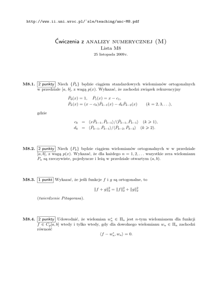 M8.2. 2 punkty Niech {Pk } będzie ciągiem wielomianów ortogonalnych w w przedziale