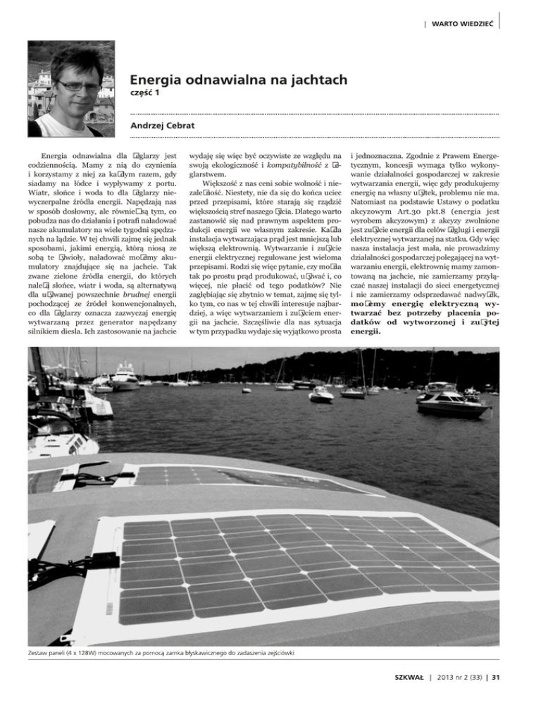 Energia odnawialna dla żeglarzy jest codziennością. Mamy z nią do czynienia i korzystamy z niej za każdym razem, gdy siadamy na łódce i wypływamy z portu. Wiatr, słońce i woda to dla żeglarzy niewyczerpalne źródła energii. Napędzają nas w sposób dosłowny, ale również są tym, co pobudza nas do działania i potrafi naładować nasze akumulatory na wiele tygodni spędzanych na lądzie. W tej chwili zajmę się jednak sposobami, jakimi energią, którą niosą ze sobą te żywioły, naładować możemy akumulatory znajdujące się na jachcie. Tak zwane zielone źródła energii, do których należą słońce, wiatr i woda, są alternatywą dla używanej powszechnie brudnej energii pochodzącej ze źródeł konwencjonalnych, co dla żeglarzy oznacza zazwyczaj energię wytwarzaną przez generator napędzany silnikiem diesla. Ich zastosowanie na jachcie wydaję się więc być oczywiste ze względu na swoją ekologiczność i kompatybilność z żeglarstwem. Większość z nas ceni sobie wolność i niezależność. Niestety, nie da się do końca uciec przed przepisami, które starają się rządzić większością stref naszego życia. Dlatego warto zastanowić się nad prawnym aspektem produkcji energii we własnym zakresie. Każda instalacja wytwarzająca prąd jest mniejszą lub większą elektrownią. Wytwarzanie i zużycie energii elektrycznej regulowane jest wieloma przepisami. Rodzi się więc pytanie, czy można tak po prostu prąd produkować, używać i, co więcej, nie płacić od tego podatków? Nie zagłębiając się zbytnio w temat, zajmę się tylko tym, co nas w tej chwili interesuje najbardziej, a więc wytwarzaniem i zużyciem energii na jachcie. Szczęśliwie dla nas sytuacja w tym przypadku wydaje się wyjątkowo prosta i jednoznaczna. Zgodnie z Prawem Energetycznym, koncesji wymaga tylko wykonywanie działalności gospodarczej w zakresie wytwarzania energii, więc gdy produkujemy energię na własny użytek, problemu nie ma. Natomiast na podstawie Ustawy o podatku akcyzowym Art.30 pkt.8 (energia jest wyrobem akcyzowym) z akcyzy zwolnione jest zużycie energii dla celów żeglugi i energii elektrycznej wytwarzanej na statku. Gdy więc nasza instalacja jest mała, nie prowadzimy działalności gospodarczej polegającej na wytwarzaniu energii, elektrownię mamy zamontowaną na jachcie, nie zamierzamy przyłączać naszej instalacji do sieci energetycznej i nie zamierzamy odsprzedawać nadwyżek, możemy energię elektryczną wytwarzać bez potrzeby płacenia podatków od wytworzonej i zużytej energii. Panele fotowoltaiczne nie należą do tanich urządzeń wytwarzających energię, ale mają kilka niewątpliwych zalet, które decydują o sensowności ich montażu. Są ciche, nie mają żadnych ruchomych i narażonych na zużycie części, przy mądrym montażu praktycznie nie zajmują miejsca i nie przeszkadzają w żegludze, a wytwarzanie w nich energii nie wymaga, po ich zamontowaniu, dodatkowych nakładów i innych źródeł pomocniczych. Ważne jest jednak, by zrozumieć ich działanie, poznać sposób montażu zapewniający optymalne ich wykorzystanie oraz by nie rozczarować się, gdy wytworzona energia będzie mniejsza od wskazanej w katalogu producenta. Promieniowanie słoneczne to, jak mówi teoria, fale elektromagnetyczne lub/i strumień fotonów, czyli cząstek posiadających masę-energię. Dla wyjaśnienia zjawiska fotowoltaicznego zdecydowanie lepiej wyobrazić sobie światło jako strumień cząstek, które, docierając do Ziemi, zderzają się ze wszystkim, co stanie im na drodze, by wbić się w przeszkodę lub się od niej odbić. Pochłanianie fotonów przez obiekty wiąże się z przekazaniem im przez foton swojej energii. W określonych warunkach energia przekazana przez foton powoduje uwolnienie innych cząstek – elektronów, z których tworzy prąd elektryczny zasilający nasze żarówki, urządzenia elektroniczne, lodówki itd. Zjawisko to wykorzystują ogniwa fotowoltaiczne wykonane z materiałów półprzewodnikowych - najczęściej odpowiednio domieszkowanego krzemu. Ogniwa fotowoltaiczne i zbudowane z nich panele wykorzystujące energię słoneczną niestety nie zamieniają jednak w całości energii padających na nie fotonów na prąd elektryczny. Większość energii jest tracona i zamienia się na ciepło, podgrzewając panel (zjawisko to niekorzystnie wpływa na jego sprawność) lub się od niego odbija. Produkowane obecnie ogniwa w zależności od zastosowanej technologii mają sprawność w granicach 14-20%, a maksymalne sprawności dochodzą do 24%. Panel składający się z wielu połączonych ze sobą ogniw ma sprawność jeszcze o kilka procent niższą. Oznacza to, że z energii, jaka dociera do panelu, tylko taka część zamieniana jest w prąd elektryczny. W Polsce średnio w ciągu lata na każdy m2 ziemi w ciągu jednego dnia pada ok 5k Wh energii słonecznej, co daje po przetworzeniu przez panel 0,5-1 kWh energii elektrycznej. Dla instalacji jachtowej 12 V daje to 42-83 Ah prądu z każdego m2 zamontowanych paneli. Przykładowo dla średniej jednostki o zapotrzebowaniu 250 Ah pokrywa to 17-33% całkowitego dobowego zapotrzebowania na energię elektryczną. Wartości te są jednak teoretyczne i znacznie się wahają w zależności od wielu czynników, z którymi mamy do czynienia na pokładzie jachtu. Rzeczywista ilość energii, jaką uzyskamy z paneli, zależy zatem od: - ilości docierającej w danym miejscu i czasie energii słonecznej (w zależności od pogody, pory roku), - powierzchni czynnej paneli, - efektywności przetwarzania energii słonecznej w prąd przez panele, - ustawienia paneli względem słońca, - temperatury zewnętrznej i możliwości chłodzenia paneli, - ewentualnego całkowitego lub częściowego zacienienia paneli, - zastosowanych układów elektronicznych służących do ładowania akumulatorów. System fotowoltaiczny na jachcie zbudowany jest z jednego lub wielu paneli, któr