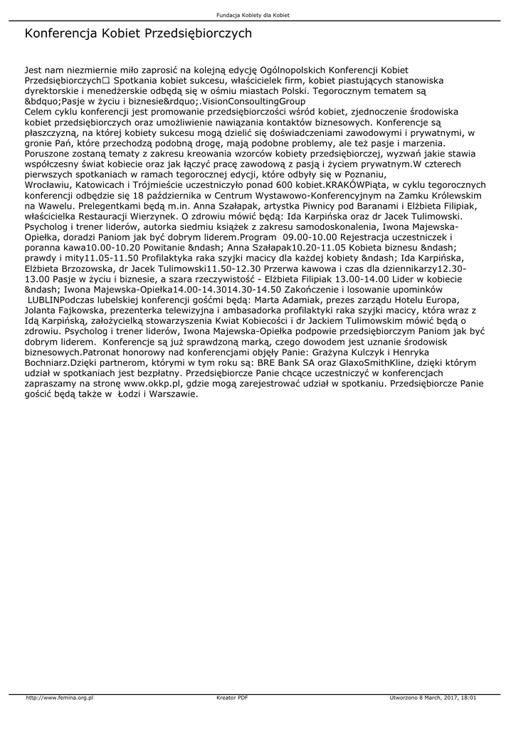 Fundacja Kobiety dla Kobiet Konferencja Kobiet Przedsiębiorczych Jest nam niezmiernie miło zaprosić na kolejną edycję Ogólnopolskich Konferencji Kobiet Przedsiębiorczych®. Spotkania kobiet sukcesu, właścicielek firm, kobiet piastujących stanowiska dyrektorskie i menedżerskie odbędą się w ośmiu miastach Polski. Tegorocznym tematem są „Pasje w życiu i biznesie”.VisionConsoultingGroup Celem cyklu konferencji jest promowanie przedsiębiorczości wśród kobiet, zjednoczenie środowiska kobiet przedsiębiorczych oraz umożliwienie nawiązania kontaktów biznesowych. Konferencje są płaszczyzną, na której kobiety sukcesu mogą dzielić się doświadczeniami zawodowymi i prywatnymi, w gronie Pań, które przechodzą podobną drogę, mają podobne problemy, ale też pasje i marzenia. Poruszone zostaną tematy z zakresu kreowania wzorców kobiety przedsiębiorczej, wyzwań jakie stawia współczesny świat kobiecie oraz jak łączyć pracę zawodową z pasją i życiem prywatnym.W czterech pierwszych spotkaniach w ramach tegorocznej edycji, które odbyły się w Poznaniu, Wrocławiu, Katowicach i Trójmieście uczestniczyło ponad 600 kobiet.KRAKÓWPiąta, w cyklu tegorocznych konferencji odbędzie się 18 października w Centrum Wystawowo-Konferencyjnym na Zamku Królewskim na Wawelu. Prelegentkami będą m.in. Anna Szałapak, artystka Piwnicy pod Baranami i Elżbieta Filipiak, właścicielka Restauracji Wierzynek. O zdrowiu mówić będą: Ida Karpińska oraz dr Jacek Tulimowski. Psycholog i trener liderów, autorka siedmiu książek z zakresu samodoskonalenia, Iwona MajewskaOpiełka, doradzi Paniom jak być dobrym liderem.Program 09.00-10.00 Rejestracja uczestniczek i poranna kawa10.00-10.20 Powitanie – Anna Szałapak10.20-11.05 Kobieta biznesu – prawdy i mity11.05-11.50 Profilaktyka raka szyjki macicy dla każdej kobiety – Ida Karpińska, Elżbieta Brzozowska, dr Jacek Tulimowski11.50-12.30 Przerwa kawowa i czas dla dziennikarzy12.3013.00 Pasje w życiu i biznesie, a szara rzeczywistość - Elżbieta Filipiak 13.00-14.00 Lider w kobiecie – Iwona Majewska-Opiełka14.00-14.3014.30-14.50 Zakończenie i losowanie upominków LUBLINPodczas lubelskiej konferencji gośćmi będą: Marta Adamiak, prezes zarządu Hotelu Europa, Jolanta Fajkowska, prezenterka telewizyjna i ambasadorka profilaktyki raka szyjki macicy, która wraz z Idą Karpińską, założycielką stowarzyszenia Kwiat Kobiecości i dr Jackiem Tulimowskim mówić będą o zdrowiu. Psycholog i trener liderów, Iwona Majewska-Opiełka podpowie przedsiębiorczym Paniom jak być dobrym liderem. Konferencje są już sprawdzoną marką, czego dowodem jest uznanie środowisk biznesowych.Patronat honorowy nad konferencjami objęły Panie: Grażyna Kulczyk i Henryka Bochniarz.Dzięki partnerom, którymi w tym roku są: BRE Bank SA oraz GlaxoSmithKline, dzięki którym udział w spotkaniach jest bezpłatny. Przedsiębiorcze Panie chcące uczestniczyć w konferencjach zapraszamy na stronę www.okkp.pl, gdzie mogą zarejestrować udział w spotkaniu. Przedsiębiorcze Panie gościć będą także w Łodzi i Warszawie. http://www.femina.org.pl Kreator PDF Utworzono 8 March, 2017, 18:01