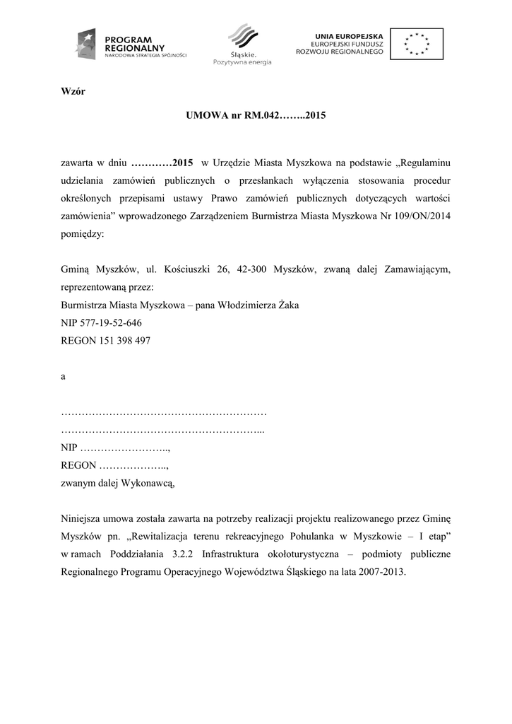Wzór UMOWA nr RM.042……..2015 zawarta w dniu …………2015 w Urzędzie Miasta Myszkowa na podstawie „Regulaminu udzielania zamówień publicznych o przesłankach wyłączenia stosowania procedur określonych przepisami ustawy Prawo zamówień publicznych dotyczących wartości zamówienia” wprowadzonego Zarządzeniem Burmistrza Miasta Myszkowa Nr 109/ON/2014 pomiędzy: Gminą Myszków, ul. Kościuszki 26, 42-300 Myszków, zwaną dalej Zamawiającym, reprezentowaną przez: Burmistrza Miasta Myszkowa – pana Włodzimierza Żaka NIP 577-19-52-646 REGON 151 398 497 a …………………………………………………… …………………………………………………... NIP …………………….., REGON ……………….., zwanym dalej Wykonawcą, Niniejsza umowa została zawarta na potrzeby realizacji projektu realizowanego przez Gminę Myszków pn. „Rewitalizacja terenu rekreacyjnego Pohulanka w Myszkowie – I etap” w ramach Poddziałania 3.2.2 Infrastruktura okołoturystyczna – podmioty publiczne Regionalnego Programu Operacyjnego Województwa Śląskiego na lata 2007-2013. §1 Przedmiot umowy 1. Zamawiający zleca a Wykonawca przyjmuje zamówienie na wykonanie usług, przedmiotem których jest opracowanie i realizacja kampanii informacyjno-promocyjnej projektu „Rewitalizacja terenu rekreacyjnego Pohulanka w Myszkowie – I etap” w ramach Poddziałania 3.2.2 Infrastruktura okołoturystyczna – podmioty publiczne Regionalnego Programu Operacyjnego Województwa Śląskiego na lata 2007-2013. 2. Wykonawca jest z opracowaniem zobowiązany i realizacją do akcji wykonania wszystkich informacyjno-promocyjnej usług związanych projektu zgodnie z aktualnymi wytycznymi zawartymi w publikacji zatytułowanej „Wytyczne Instytucji Zarządzającej Regionalnym Programem Operacyjnym Województwa Śląskiego na lata 2007-2013 dla beneficjentów w zakresie informacji i promocji ” (do pobrania na www.rpo.slaskie.pl). 3. W ramach realizacji akcji informacyjno-promocyjnej, o której mowa w §1 ust. 1 niniejszej umowy Wykonawca jest zobowiązany wykonać poszczególne rodzaje usług: a) Ulotki (sztuk 50) - format A5 (14,8 x 21 cm) - druk: pełen kolor dwustronny, papier: kreda błysk 135 g/m2, wykonanie projektu, przygotowanie do druku, wydruk, b) Plakaty (sztuk 50) - format B2 (70 x 50 cm) - druk: pełen kolor, papier: kreda błysk 135g/m2, wykonanie projektu, przygotowanie do druku, wydruk, c) Foldery (sztuk 50) - format A5 (14,8 x 21 cm) 6 stronicowe, druk: pełen kolor, papier: kreda błysk 135g/m2 wykonanie projektu, przygotowanie do druku, wydruk d) Nalepki informacyjne (sztuk 500) - format 5 x 10 cm poziomo, druk: pełen kolor, trwały materiał odporny na zniszczenia, wykonanie projektu, przygotowanie do druku, wydruk, e) Informacje w prasie (sztuk 2) - wykonanie projektów i opracowań graficznych, wymiary modułu min. 152mm x 174mm, strona 2,3 lub ostatnia, f) Informacje w mediach (sztuk 2) - 1 ogłoszenie (opracowanie spotu reklamowego i publikacja w radio) - 2 emisje w radio regionalnym, g) Tablica informacyjna/pamiątkowa (sztuk 2) - w miejscu realizacji projektu, umieszczone na terenie inwestycji, montaż tablicy na dwóch słupkach, wymiary 90 x 70 cm, pełen kolor, wykonanie projektu, wykonanie z trwałego materiału odpornego na warunki atmosferyczne. §2 Szczegółowe Obowiązki Stron Umowy 1. Wykonawca jest zobowiązany do przedłożenia Zamawiającemu projektów opracowanych materiałów informacyjno-promocyjnych wymienionych w §1 ust. 3 do akceptacji przed ich wydrukiem lub emisją. 2. Zamawiający dokona akceptacji dostarczonych przez Wykonawcę projektów materiałów promocyjnych i informacyjnych wraz z wydaniem oświadczenia o ich przyjęciu lub określeniu zmian i poprawek, które Wykonawca zobowiązany jest dokonać nieodpłatnie w wyznaczonym przez Zamawiającego terminie. 3. Zamawiający wymaga, aby materiały promocyjne były dobrej jakości, charakteryzowały się estetyką i elegancją oraz starannością wykonania. 4. Wykonawca dołoży wszelkich starań, aby materiały promocyjne i informacyjne były odpowiednio zapakowane i nie uległy zniszczeniu podczas transportu. 5. Wykonawca jest zobowiązany do dostarczenia Zamawiającemu dowodów publikacji prasowych w postaci 1 egzemplarza danej gazety, w której znajduje się emitowane ogłoszenie, oraz nagranie spotu dla radia utrwalone w wersji elektronicznej na płycie CD lub DVD. 6. Wykonawca przekaże Zamawiającemu informację o terminie emisji ogłoszeń promocyjnych z podaniem nazw mediów, w których emitowano informacje promujące projekt. §3 Nadzór nad realizacją umowy 1. Ze strony Zamawiającego prace będą nadzorowane przez panią Katarzynę Jęderko – pracownika Wydziału Rozwoju Miasta. 2. Ze strony Wykonawcy do kontaktów wyznaczona/y zostaje ………………….. 3. Każde polecenie, zawiadomienie, zgoda, decyzja, zatwierdzenie Zamawiającego lub Wykonawcy będzie dokonywane w formie pisemnej, telefonicznej lub elektronicznej. §4 Termin realizacji zamówienia 1. Wykonawca wykona przedmiot umowy w terminie do dnia 30.06.2015r. 2. Za datę wykonania przedmiotu umowy uważa się datę spisania protokołu odbioru końcowego przedmiotu umowy. §5 Wynagrodzenie Wykonawcy i płatności 1. Za wykonanie przedmiotu umowy strony ustalają wynagrodzenie brutto w wysokości ……………. zł (słownie: ……………………………………………………..), w tym: – netto ………… zł (słownie: ………………………………………………………….) - VAT 23% ………… zł (słownie: ……………………………………………………). Wynagrodzenie, o którym mowa powyżej, obejmuje wszystkie koszty związane z realizacją przedmiotu umowy. 2. Wynagrodzenie za wykonanie poszczególnych usług wskazane jest w załączniku do umowy – oferta Wykonawcy. 3. Podstawą do zapłaty będzie faktura wystawiona przez Wykonawcę wraz